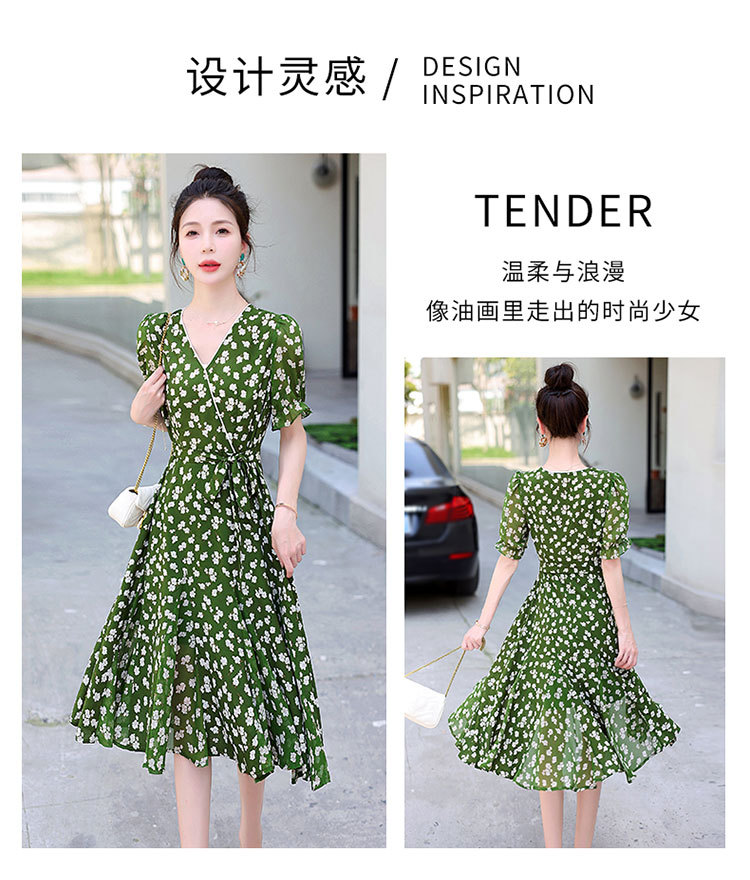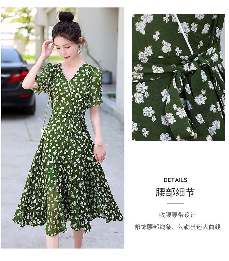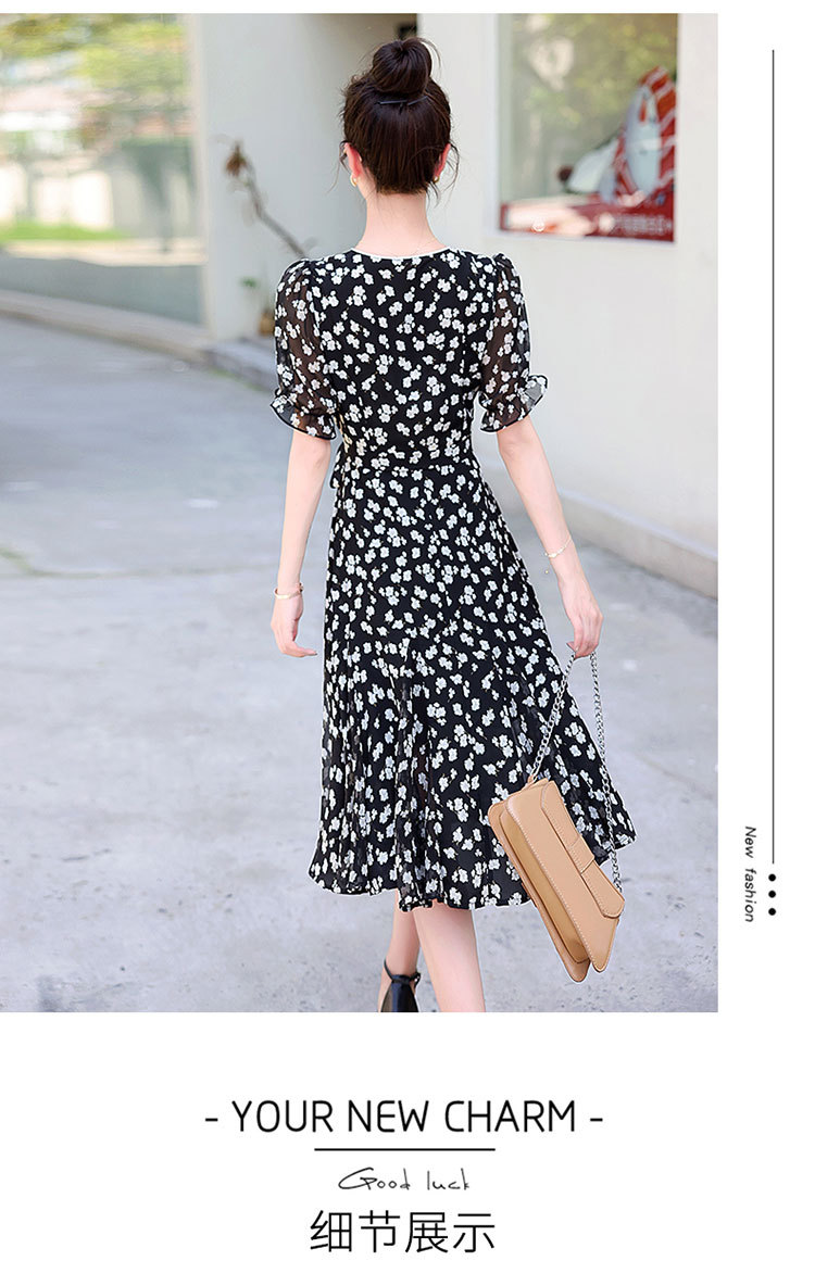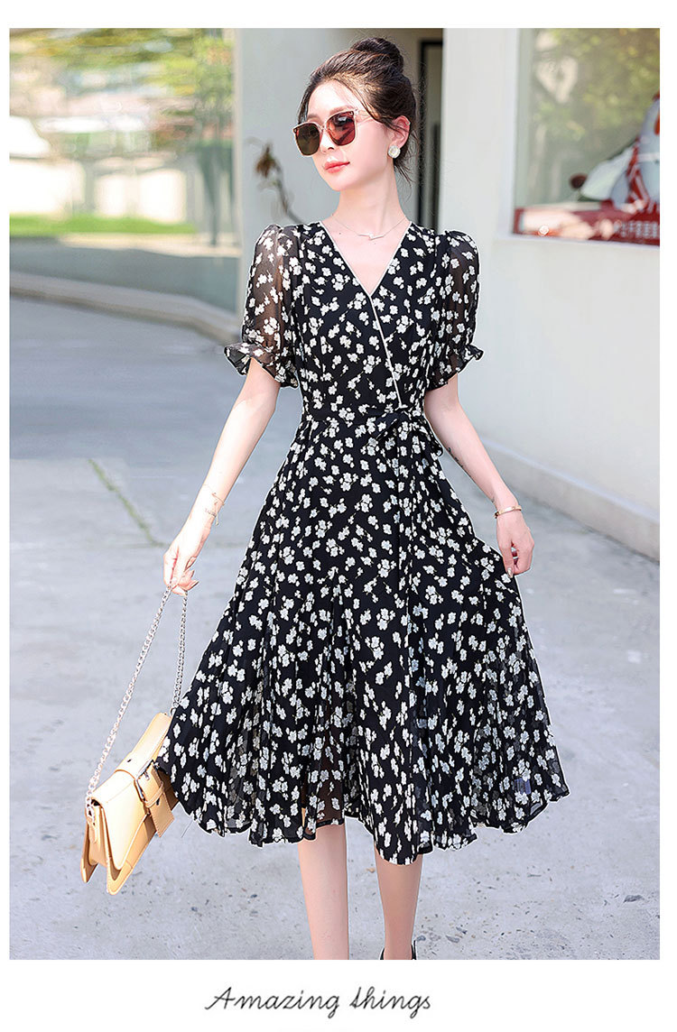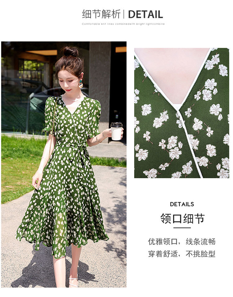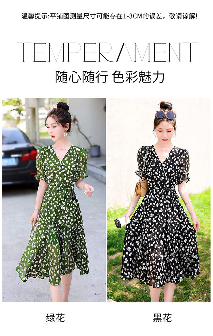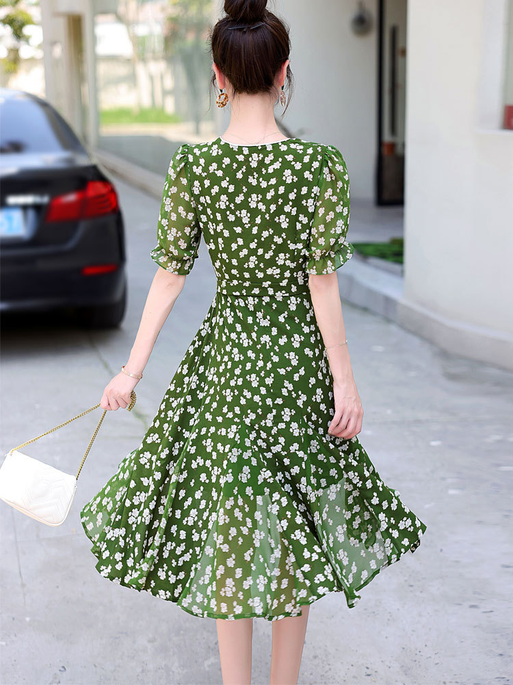 2023碎花连衣裙女时尚气质收腰过膝法式泡泡袖修身显瘦大摆雪纺裙