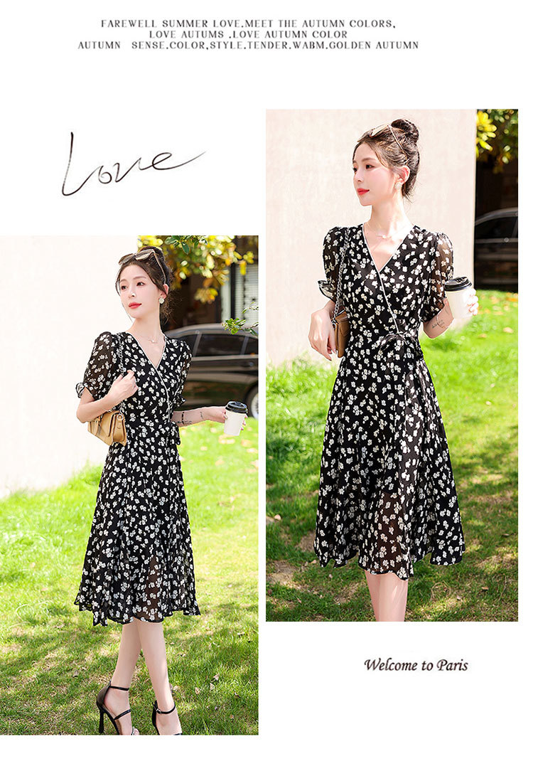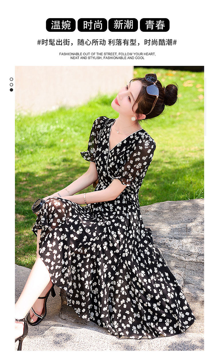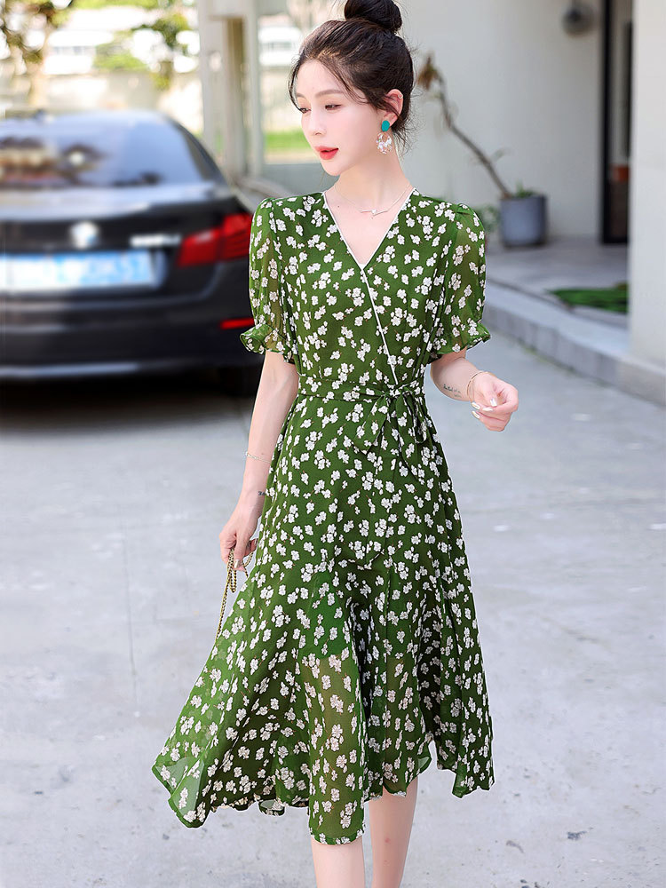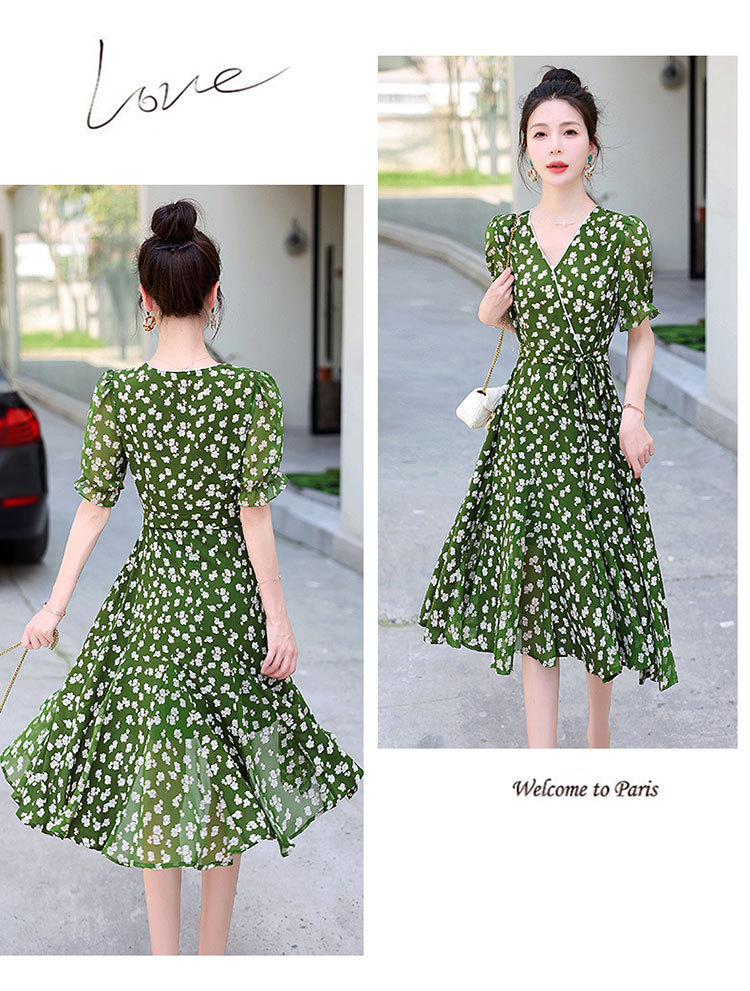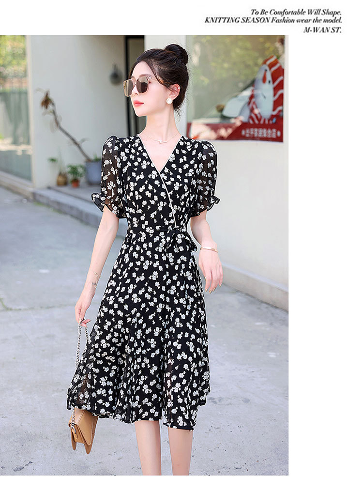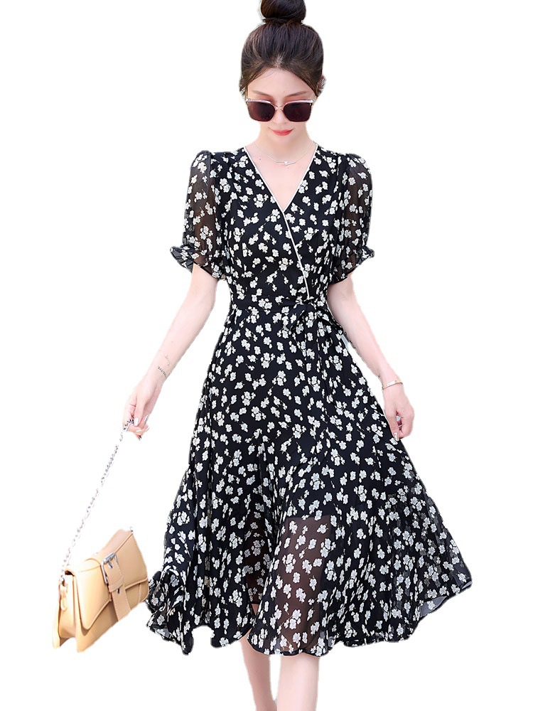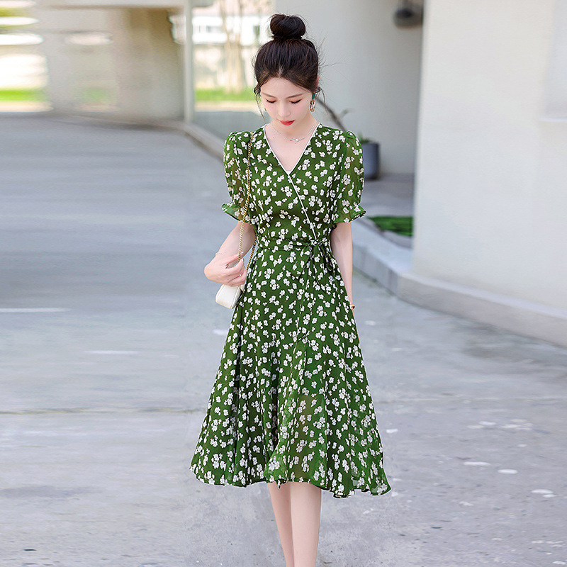 2023碎花连衣裙女时尚气质收腰过膝法式泡泡袖修身显瘦大摆雪纺裙
