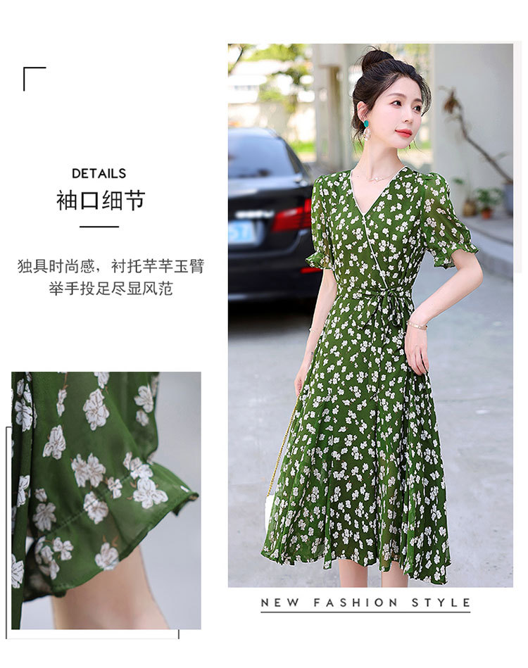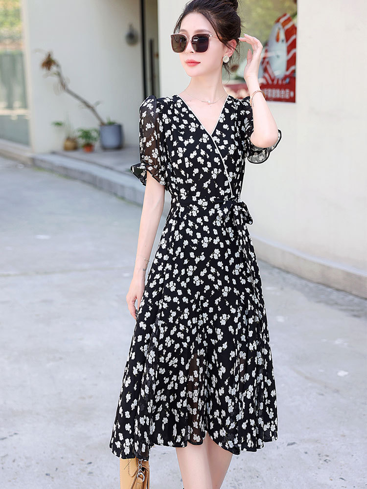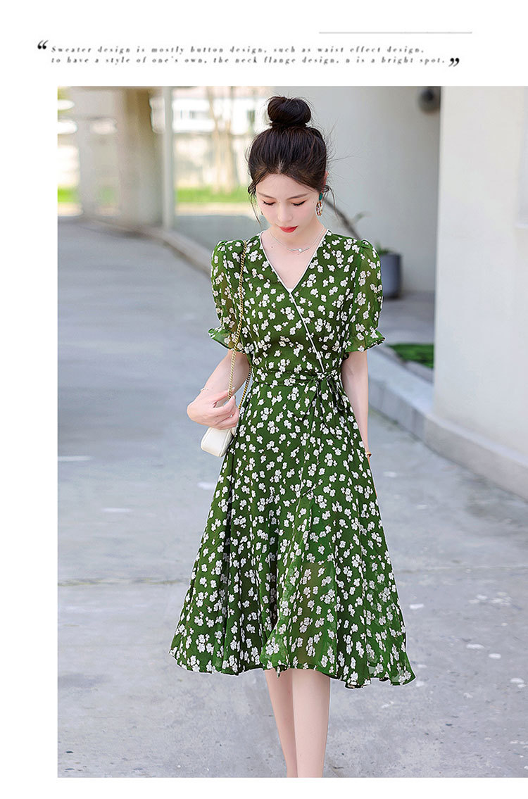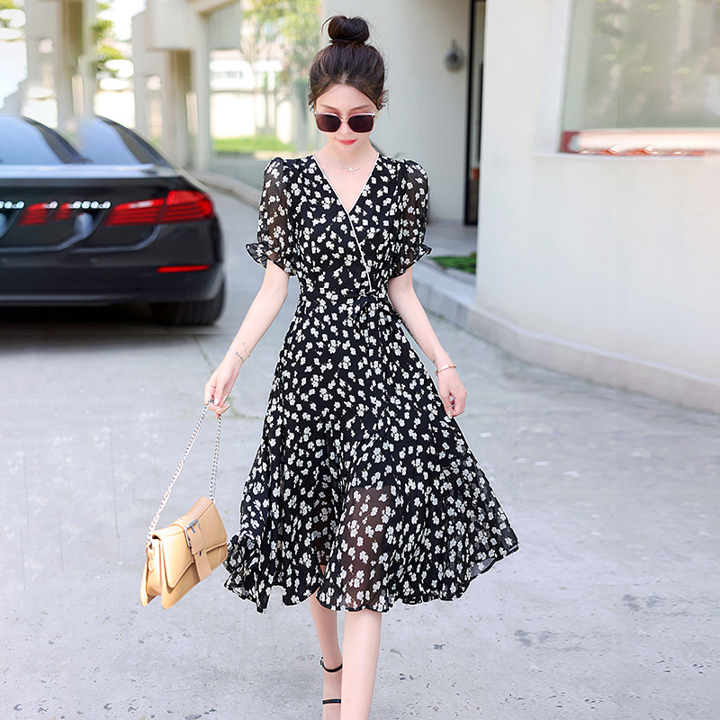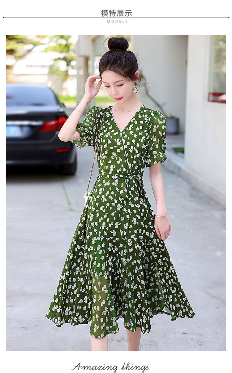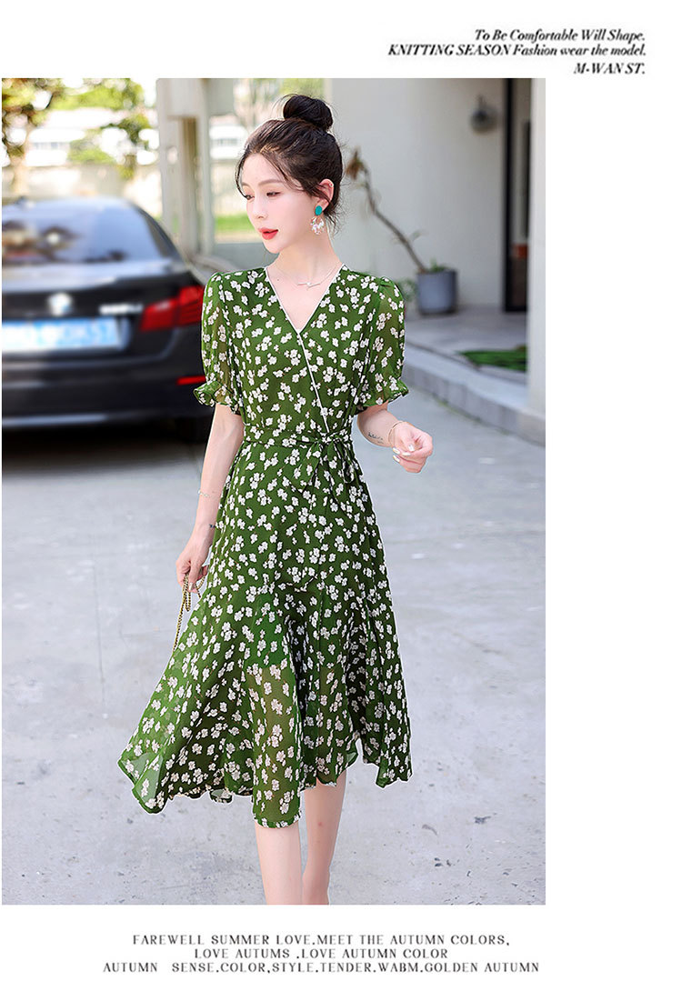 2023碎花连衣裙女时尚气质收腰过膝法式泡泡袖修身显瘦大摆雪纺裙