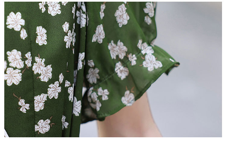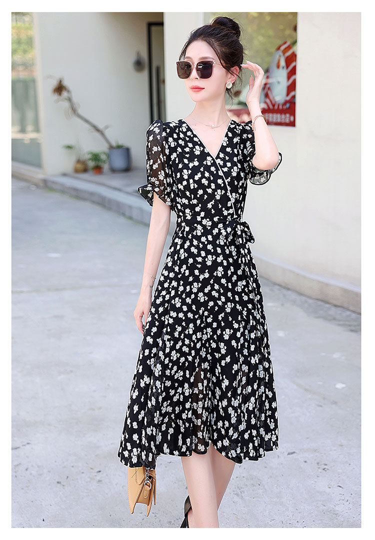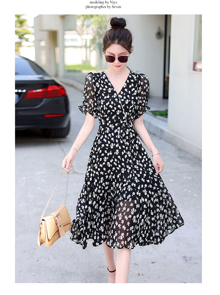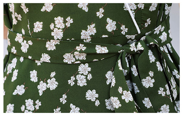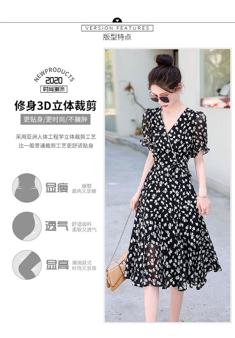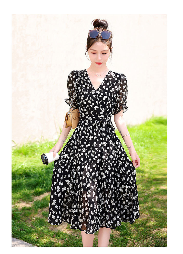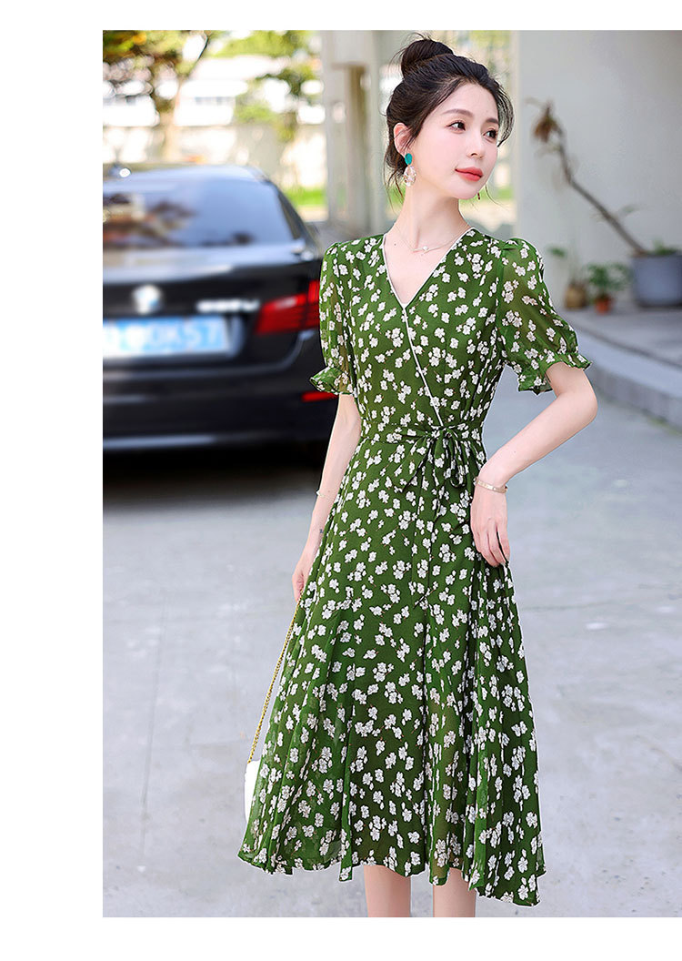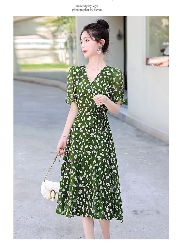 2023碎花连衣裙女时尚气质收腰过膝法式泡泡袖修身显瘦大摆雪纺裙