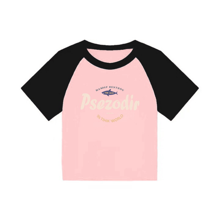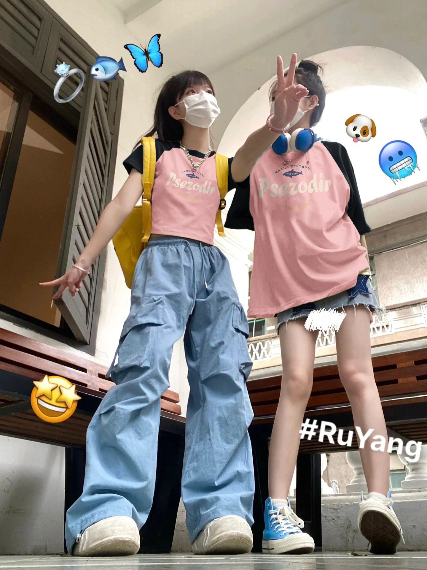 黑粉色插肩短袖t恤女夏季閨蜜裝一長一短多巴胺甜酷短款正肩上衣