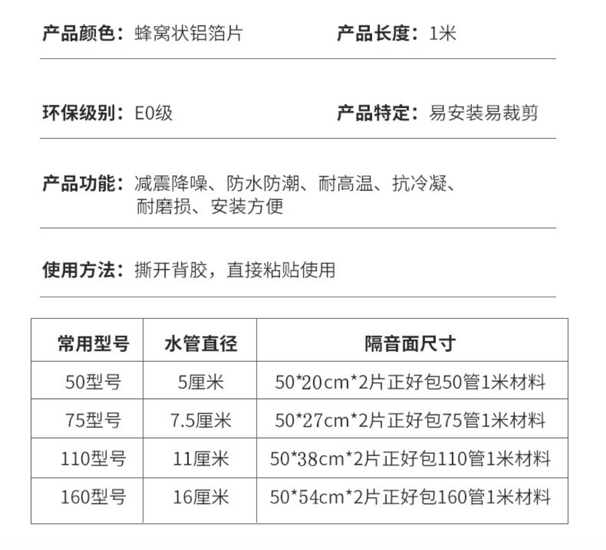 规格 高分子黄金阻尼减震片【50型号】 无甲醛一米装,高分子黄金阻尼减震片【75型号】 无甲醛一米装,高分子黄金阻尼减震片【110型号】 无甲醛一米装,高分子黄金阻尼减震片【160型号】 无甲醛一米装,高分子黄金阻尼减震片【50型号】 无甲醛半米装,高分子黄金阻尼减震片【75型号】 无甲醛半米装,高分子黄金阻尼减震片【110型号】 无甲醛半米装,高分子黄金阻尼减震片【160型号】 无甲醛半米装,通用型│黄金阻尼片【50型】 50*80CM,【50型】1cm隔音棉1米+阻尼片1米,【75型】1cm隔音棉1米+阻尼片1米 二合一隔音套装,【110型】1cm隔音棉1米+阻尼片1米 二合一隔音套装,【160型】1cm隔音棉1米+阻尼片1米 二合一隔音套装,【50型】2cm隔音棉1米+阻尼片1米 二合一隔音套装,【75型】2cm隔音棉1米+阻尼片1米 二合一隔音套装,【110型】2cm隔音棉1米+阻尼片1米 二合一隔音套装,【160型】2cm隔音棉1米+阻尼片1米 二合一隔音套装,【升级高密】50型1cm米白色隔音棉1米+阻尼片1米,【升级高密】75型1cm米白色隔音棉1米+阻尼片1米 升级款二合一隔音套装,【升级高密】110型1cm米白色隔音棉1米+阻尼片1米 升级款二合一隔音套装,【升级高密】160型1cm米白色隔音棉1米+阻尼片1米 升级款二合一隔音套装,【升级高密】50型2cm米白色隔音棉1米+阻尼片1米 升级款二合一隔音套装,【升级高密】75型2cm米白色隔音棉1米+阻尼片1米 升级款二合一隔音套装,【升级高密】110型2cm米白色隔音棉1米+阻尼片1米 升级款二合一隔音套装,【升级高密】160型2cm米白色隔音棉1米+阻尼片1米 升级款二合一隔音套装,【高密降噪】50型1cm厚管道隔音棉 扎带u0026铝箔胶带,【高密降噪】75型1cm厚管道隔音棉 扎带u0026铝箔胶带,【高密降噪】110型1cm厚管道隔音棉 扎带u0026铝箔胶带,【高密降噪】160型1cm厚管道隔音棉 扎带u0026铝箔胶带,【高密降噪】50型2cm厚管道隔音棉 扎带u0026铝箔胶带,【高密降噪】75型2cm厚管道隔音棉 扎带u0026铝箔胶带,【高密降噪】110型2cm厚管道隔音棉 扎带u0026铝箔胶带,【高密降噪】160型2cm厚管道隔音棉 扎带u0026铝箔胶带,【升级高密】50型米白色隔音棉1CM厚 扎带u0026铝箔胶带,【升级高密】75型米白色隔音棉1CM厚 扎带u0026铝箔胶带,【升级高密】110型米白色隔音棉1CM厚 扎带u0026铝箔胶带,【升级高密】160型米白色隔音棉1CM厚 扎带u0026铝箔胶带,【升级高密】50型米白色隔音棉2CM厚 扎带u0026铝箔胶带,【升级高密】75型米白色隔音棉2CM厚 扎带u0026铝箔胶带,【升级高密】110型米白色隔音棉2CM厚 扎带u0026铝箔胶带,【升级高密】160型米白色隔音棉2CM厚 扎带u0026铝箔胶带