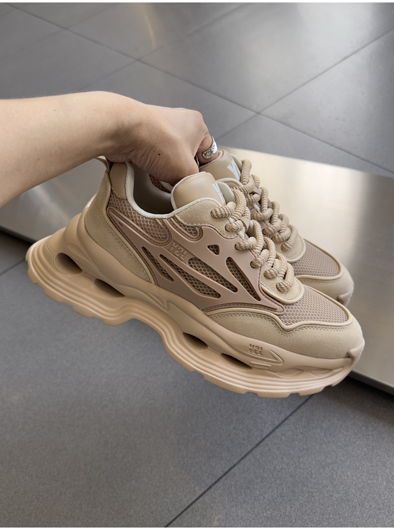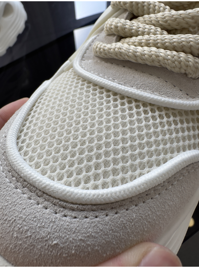 鞋面采用头层反绒牛皮材质 拼接复合网面