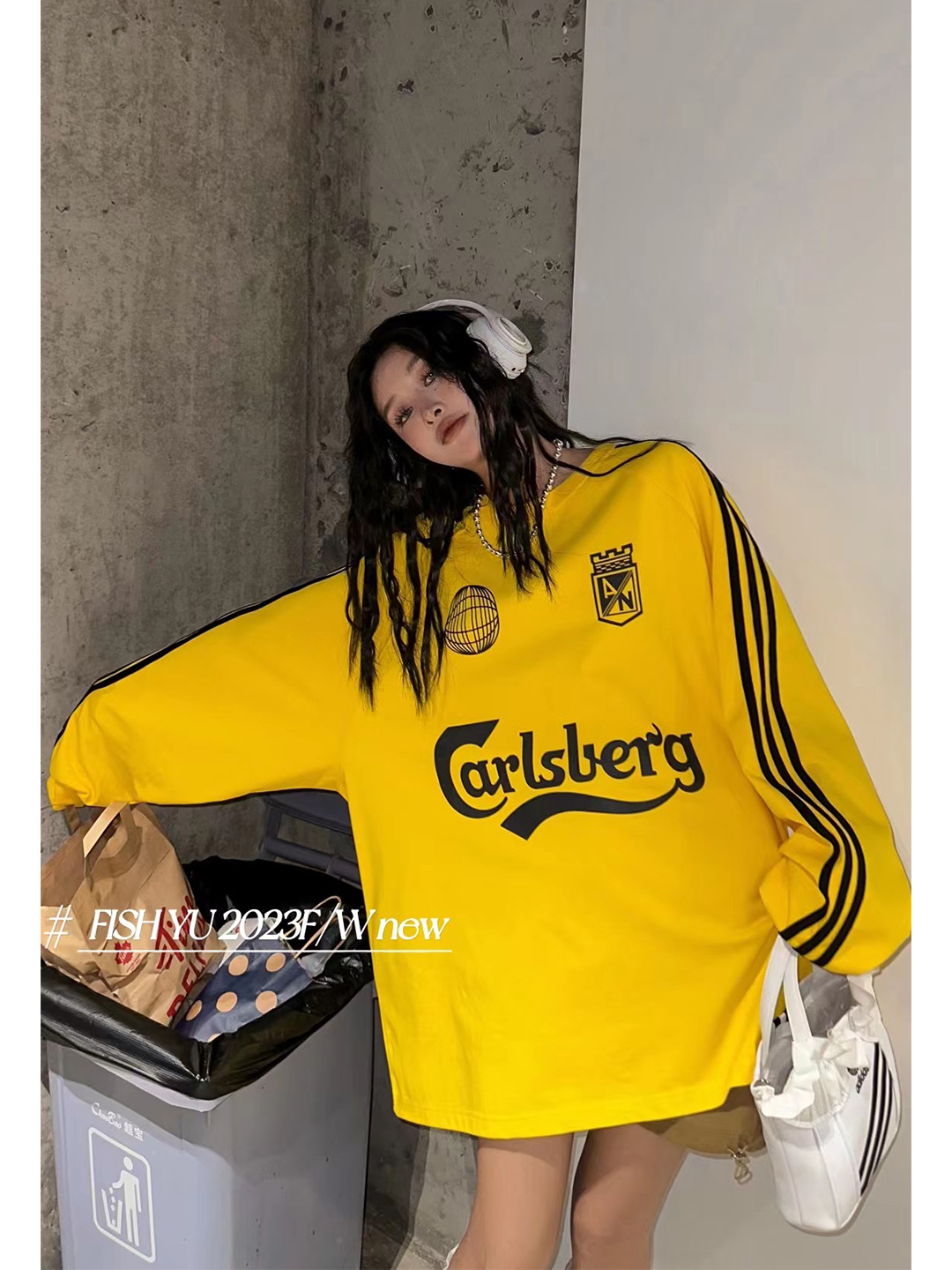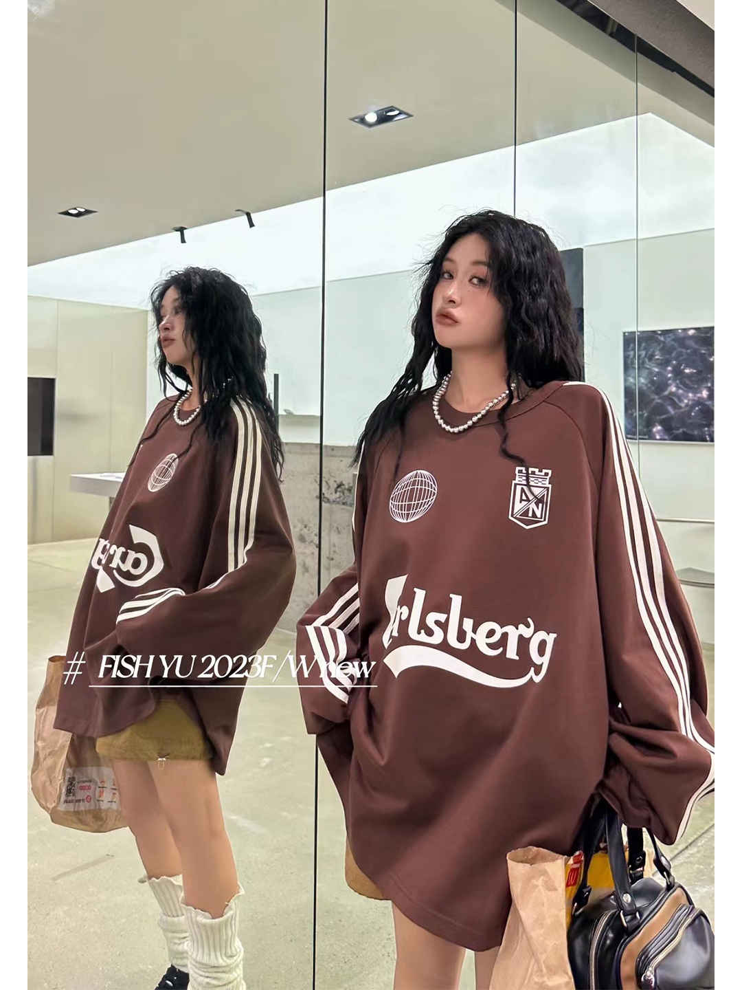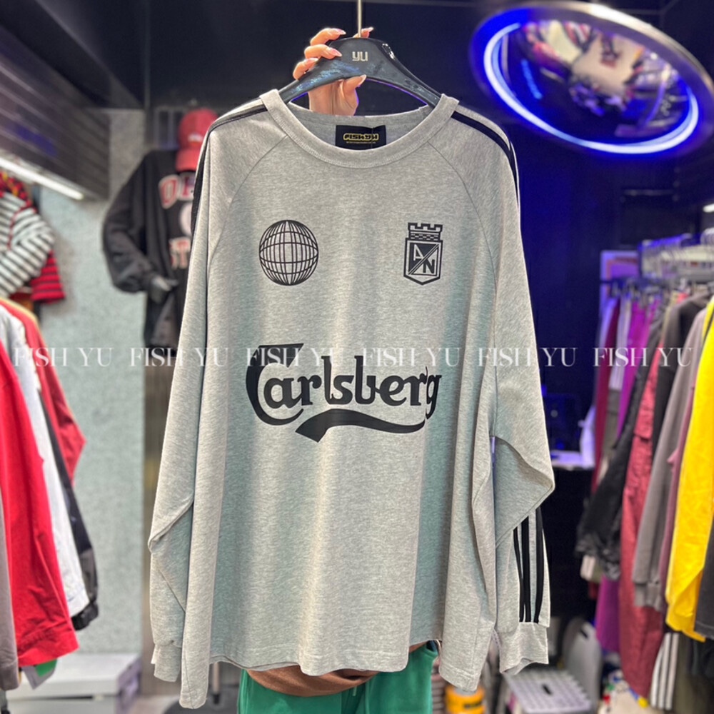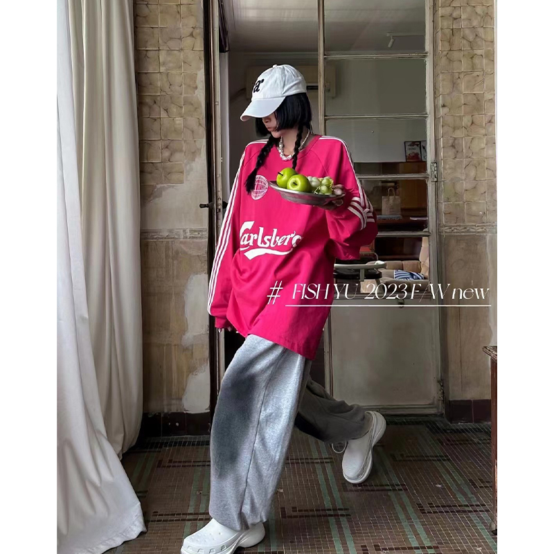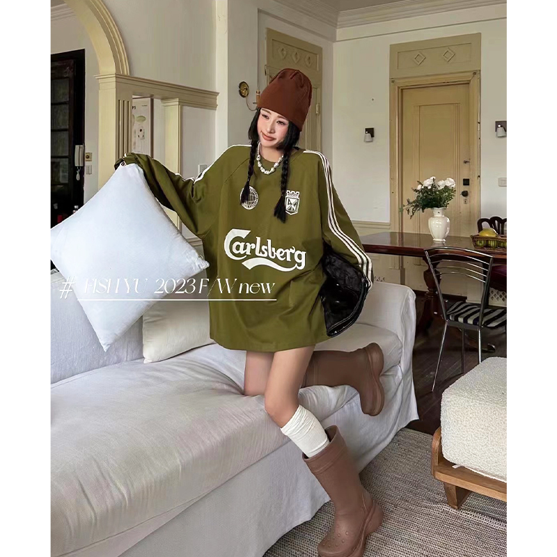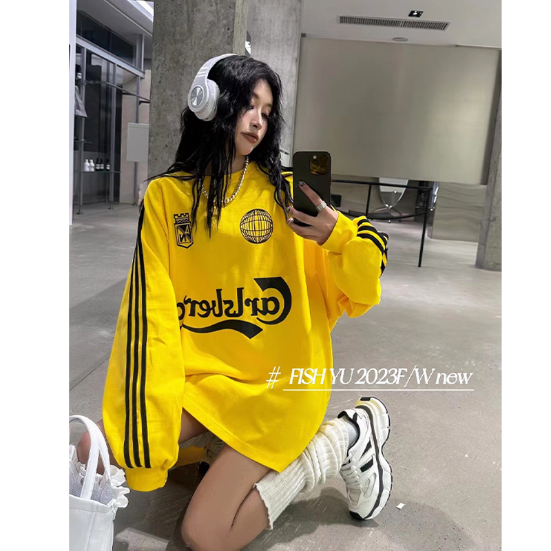 衛衣T恤女長袖大尺碼薄款美式復古側邊槓條設計撞色巨顯瘦遮臀長版T