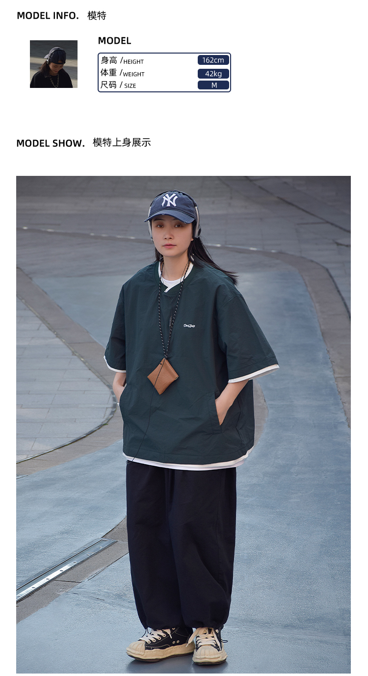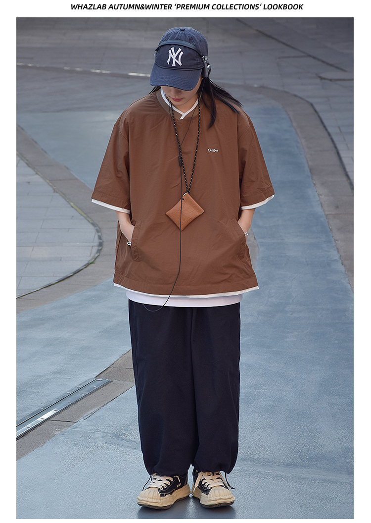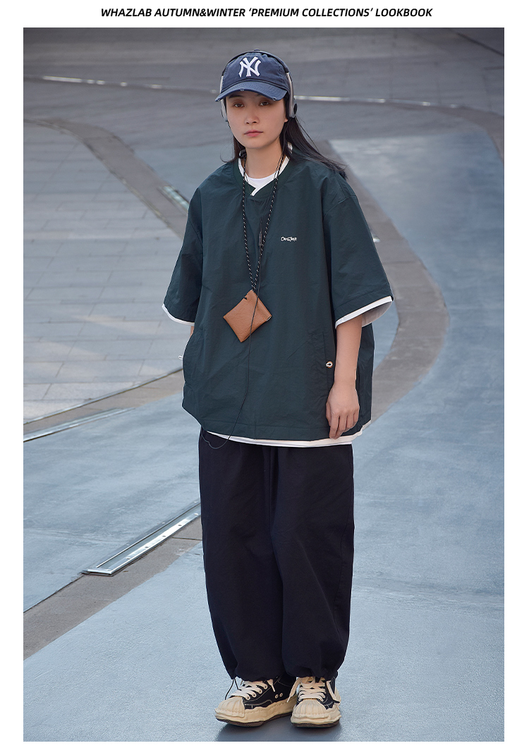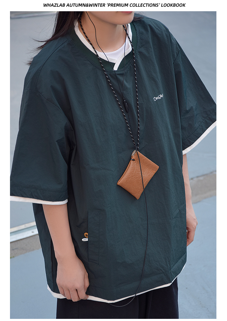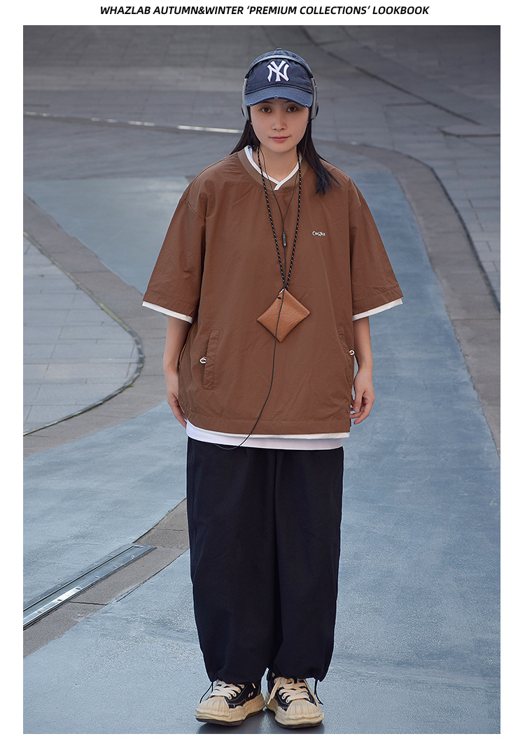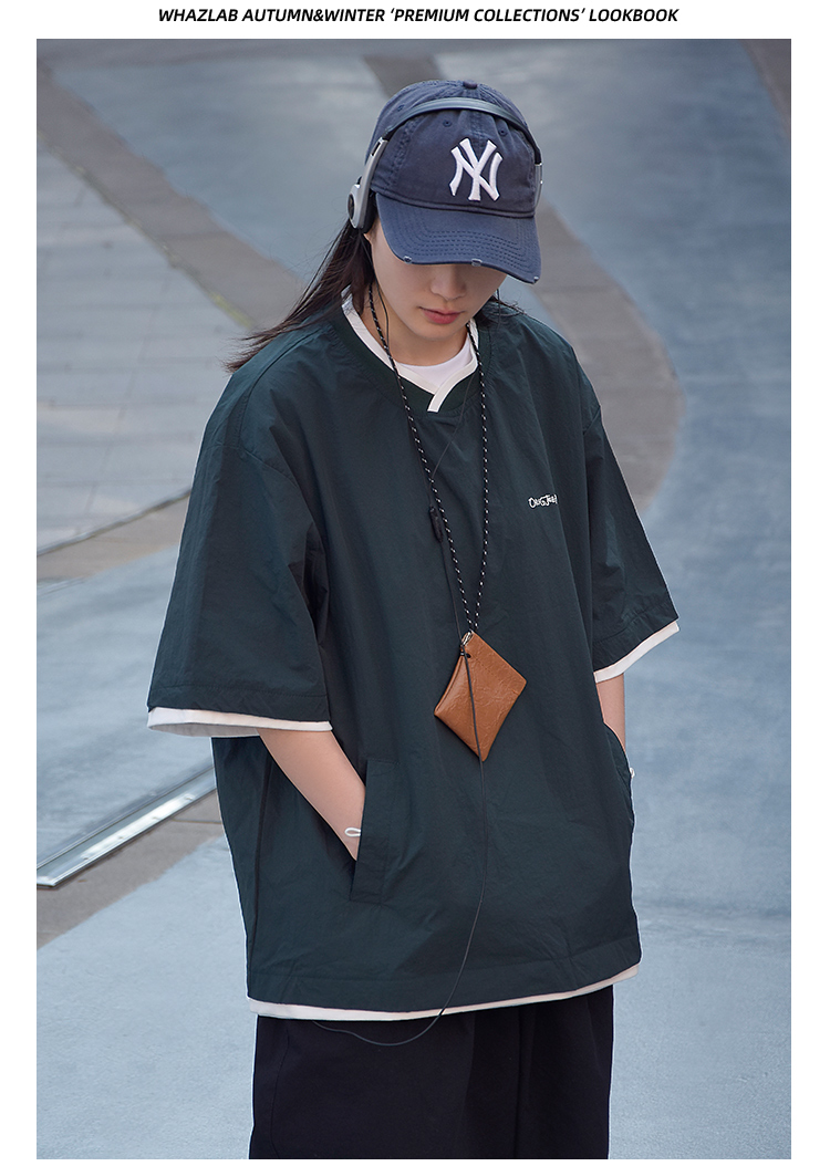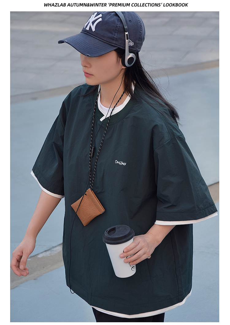 WHAZLAB2023夏季日系復古假兩件短袖T恤棒球領寬鬆印花休閒純色潮
