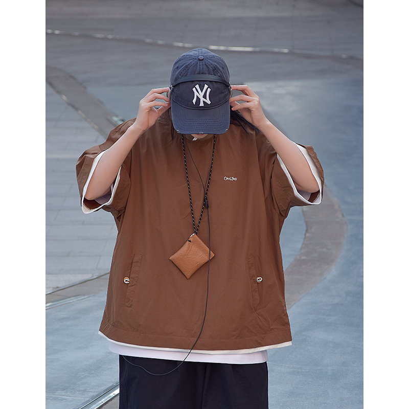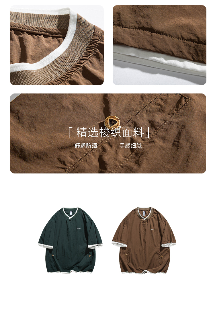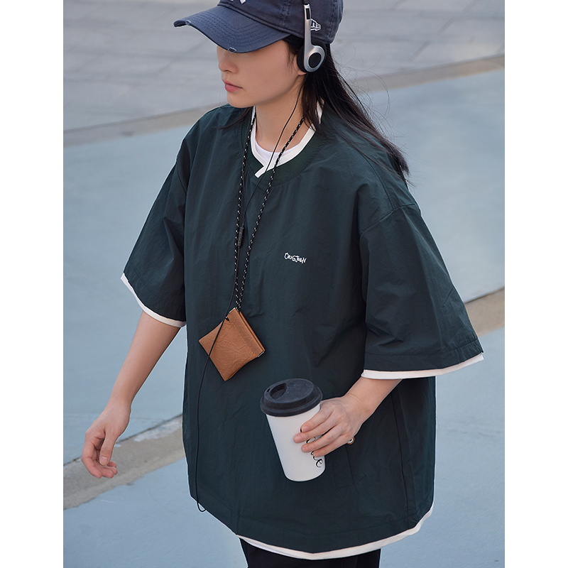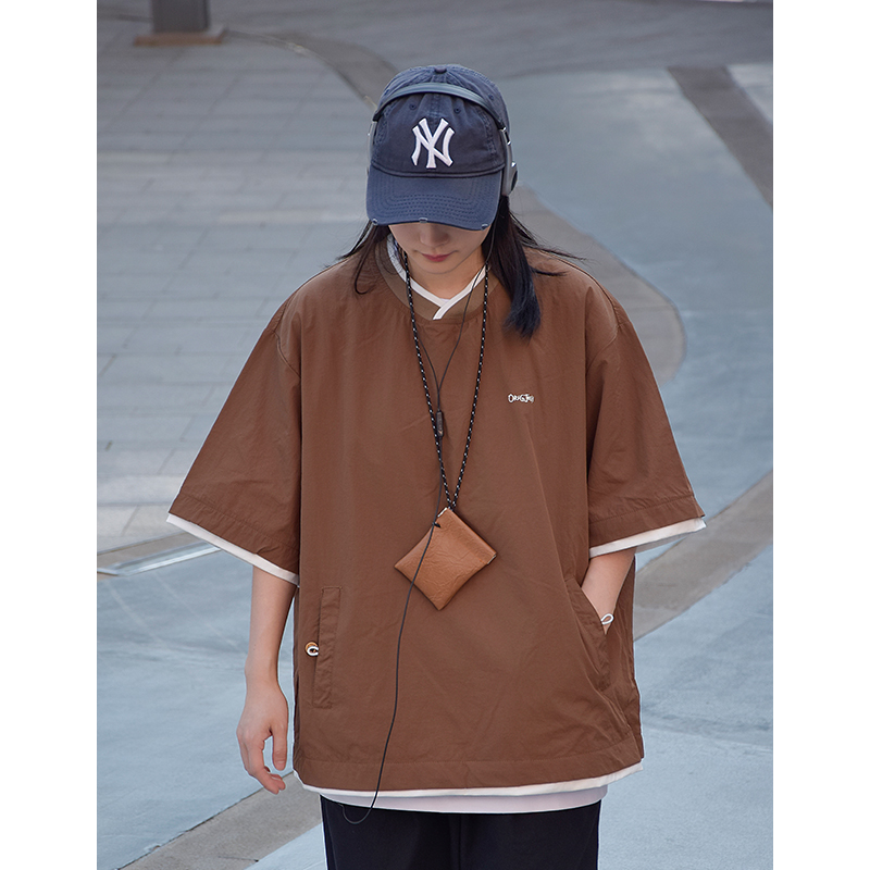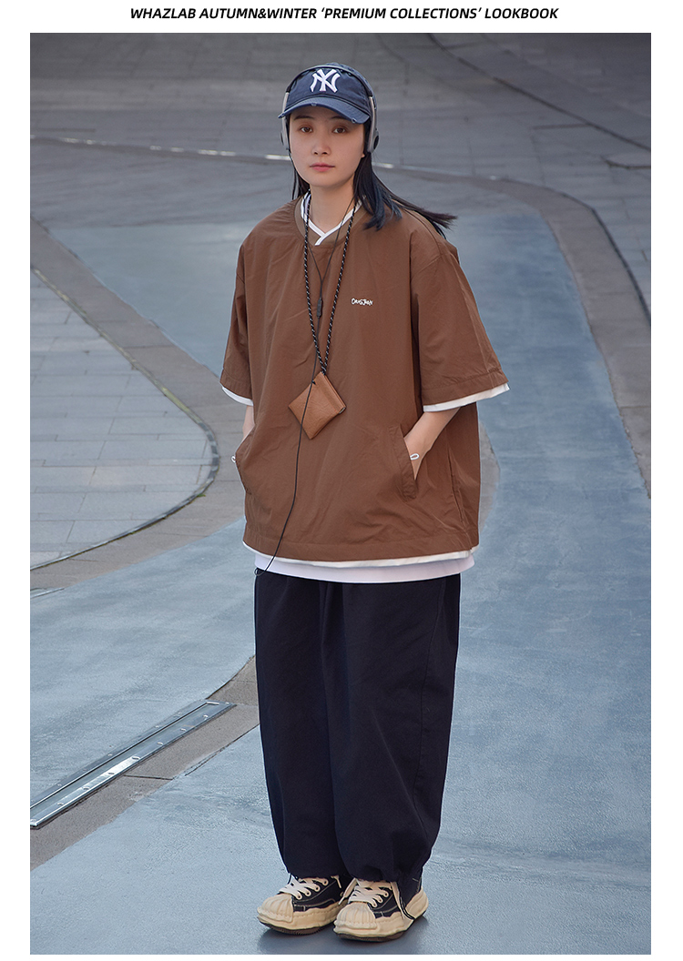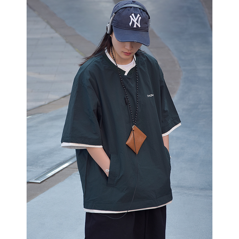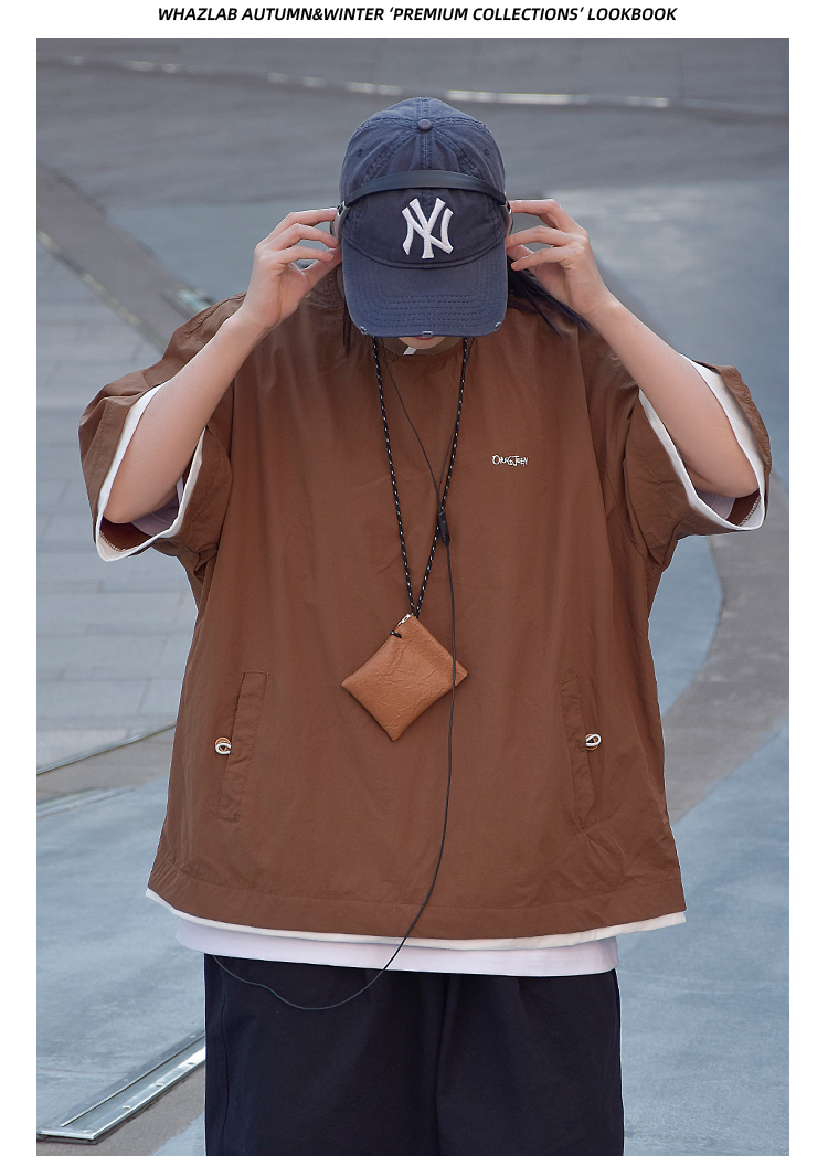 WHAZLAB2023夏季日系復古假兩件短袖T恤棒球領寬鬆印花休閒純色潮