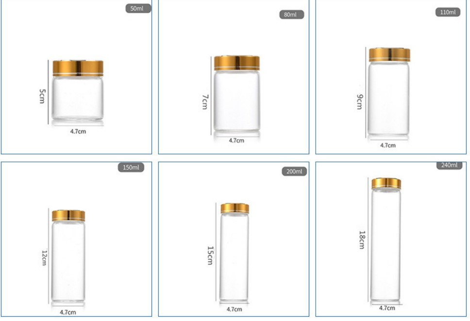 高硼硅管制密封瓶,燕窝瓶。糖果瓶 粉剂瓶,沉香瓶带铝盖。价格包含铝盖,需要电化铝盖请另拍盖子,不明白之处请联系旺旺。一板60只
