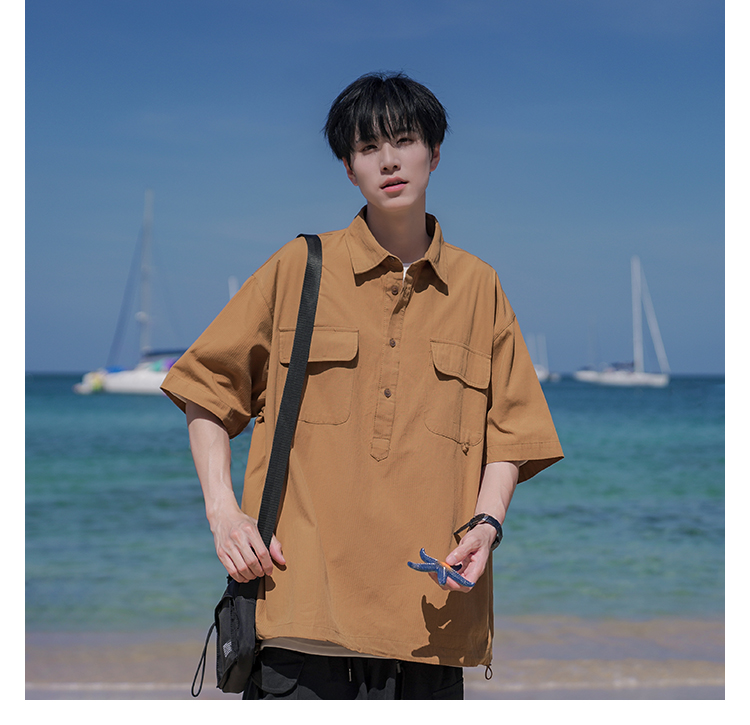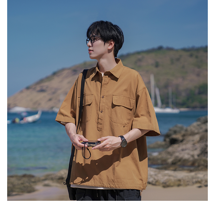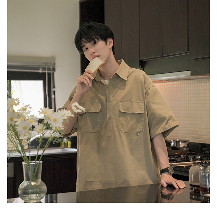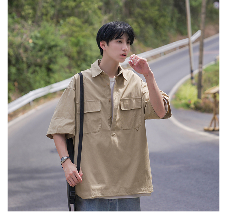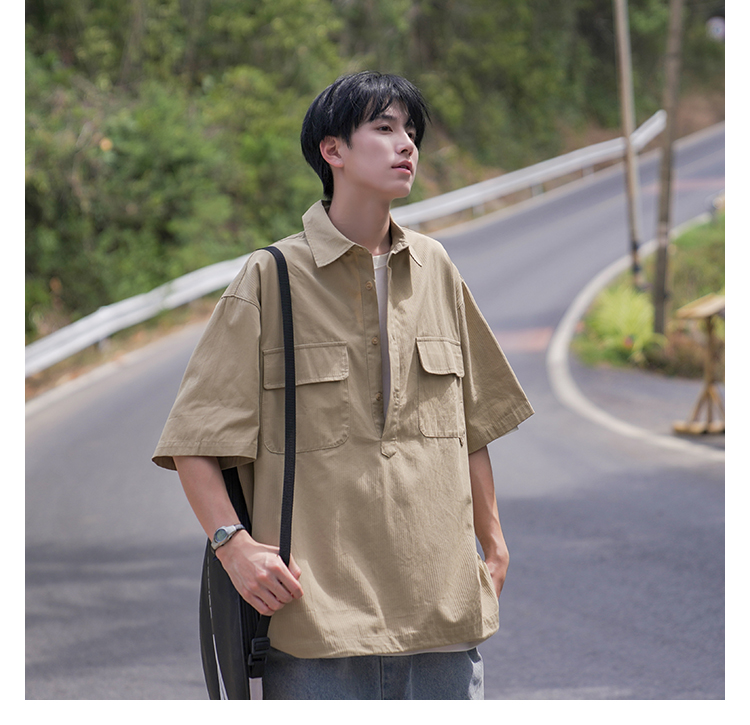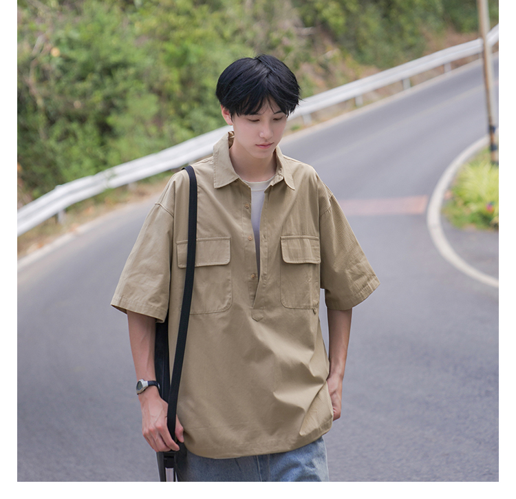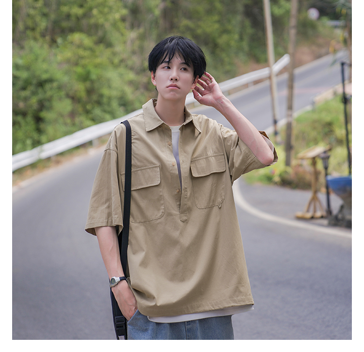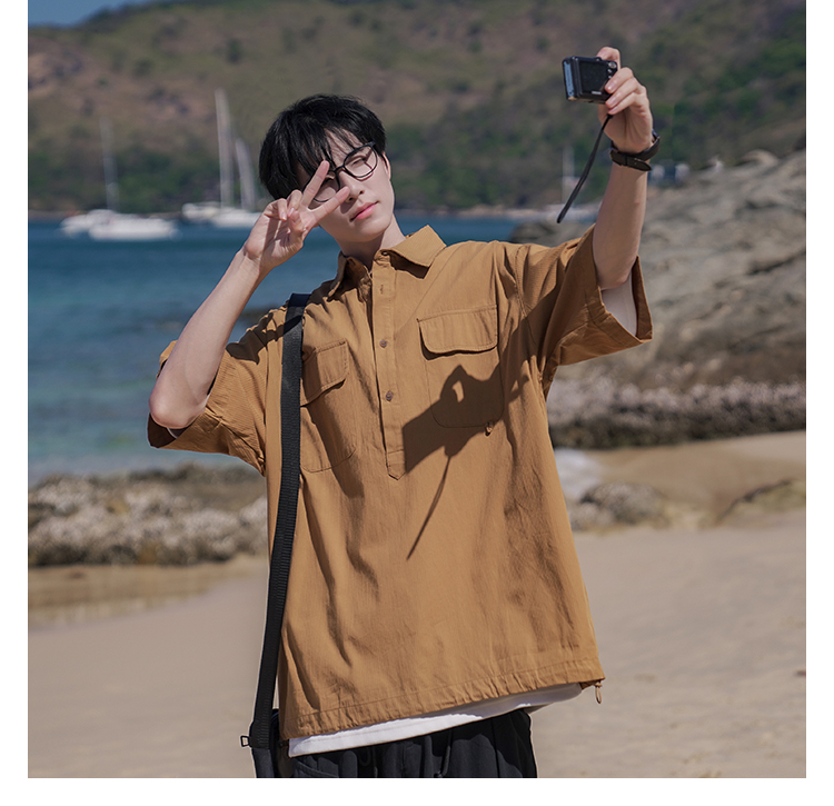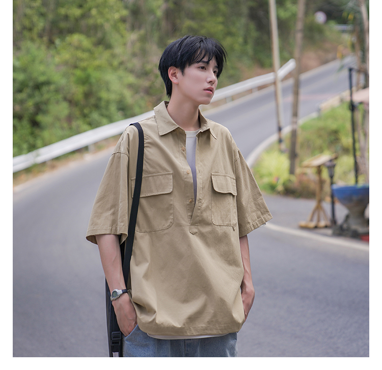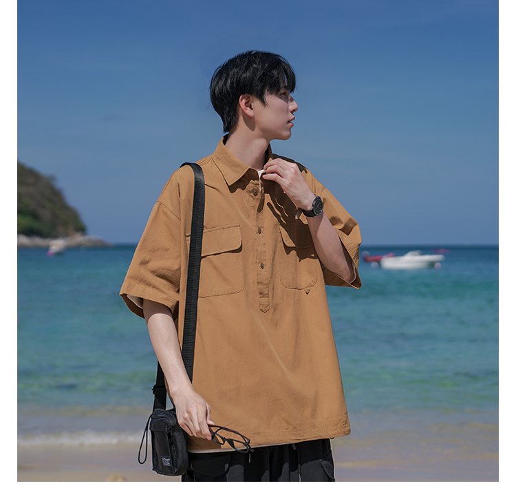 日系復古POLO衫男夏季潮牌設計感小眾寬鬆休閒口袋襯衫領短袖t恤