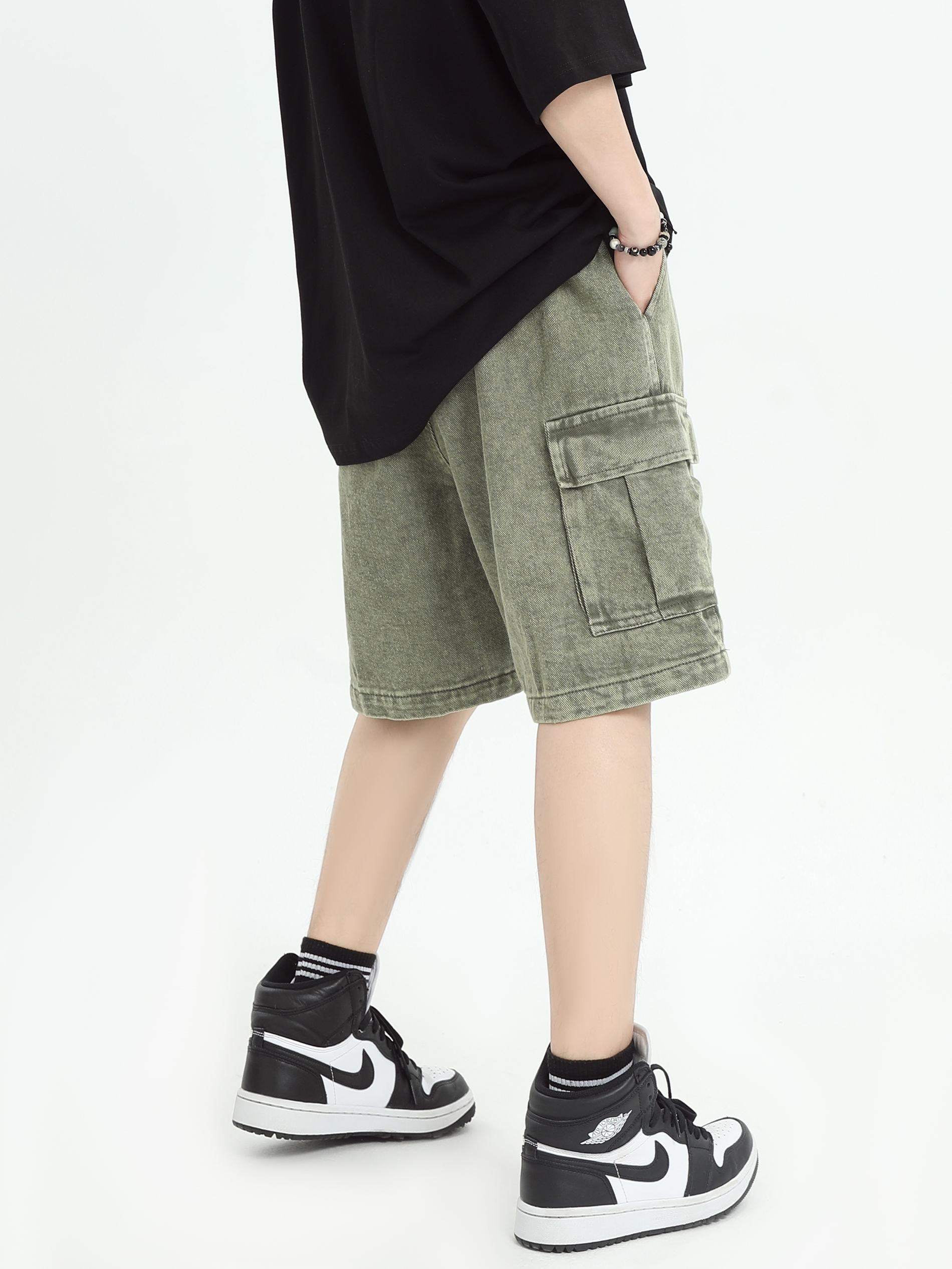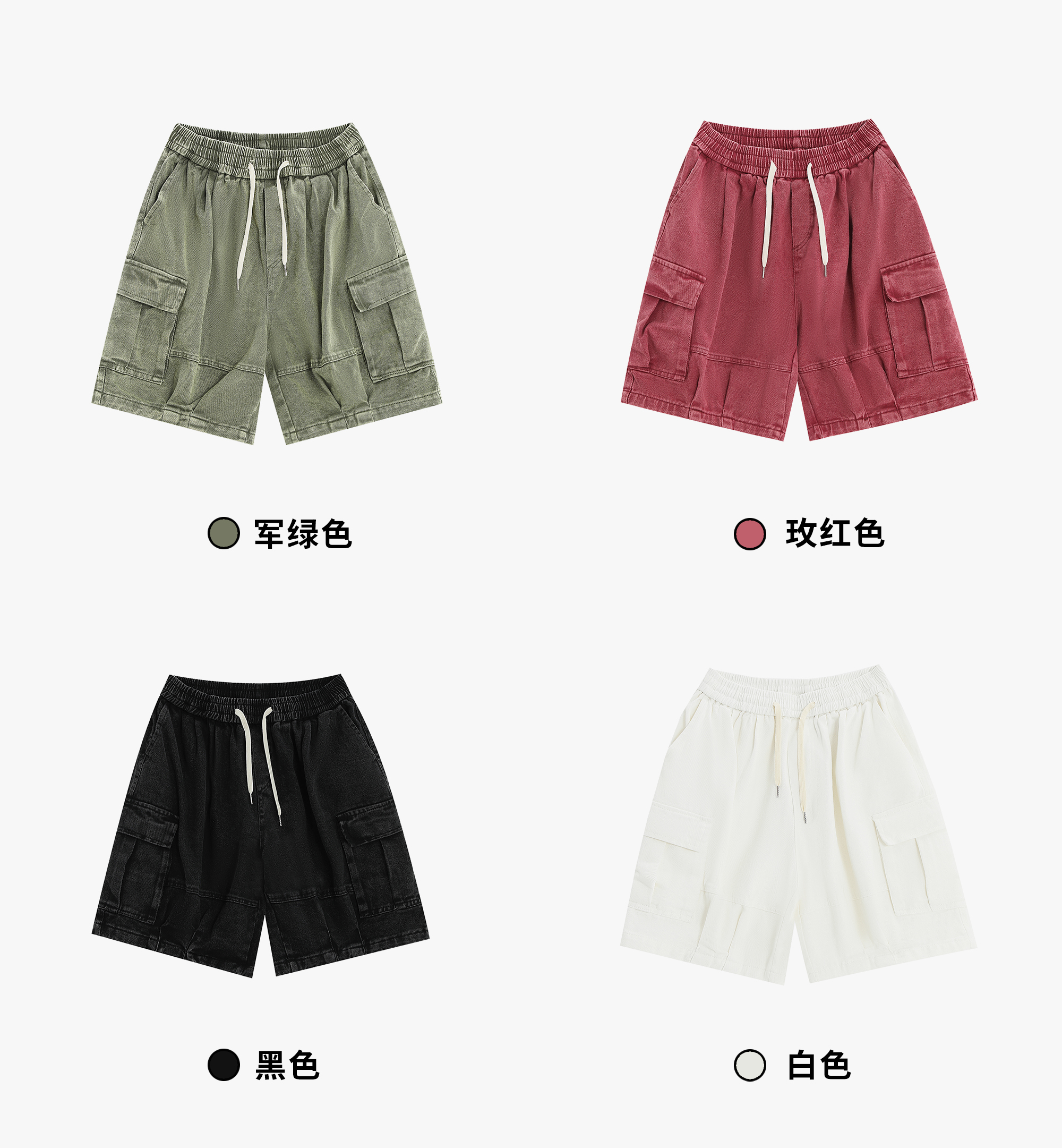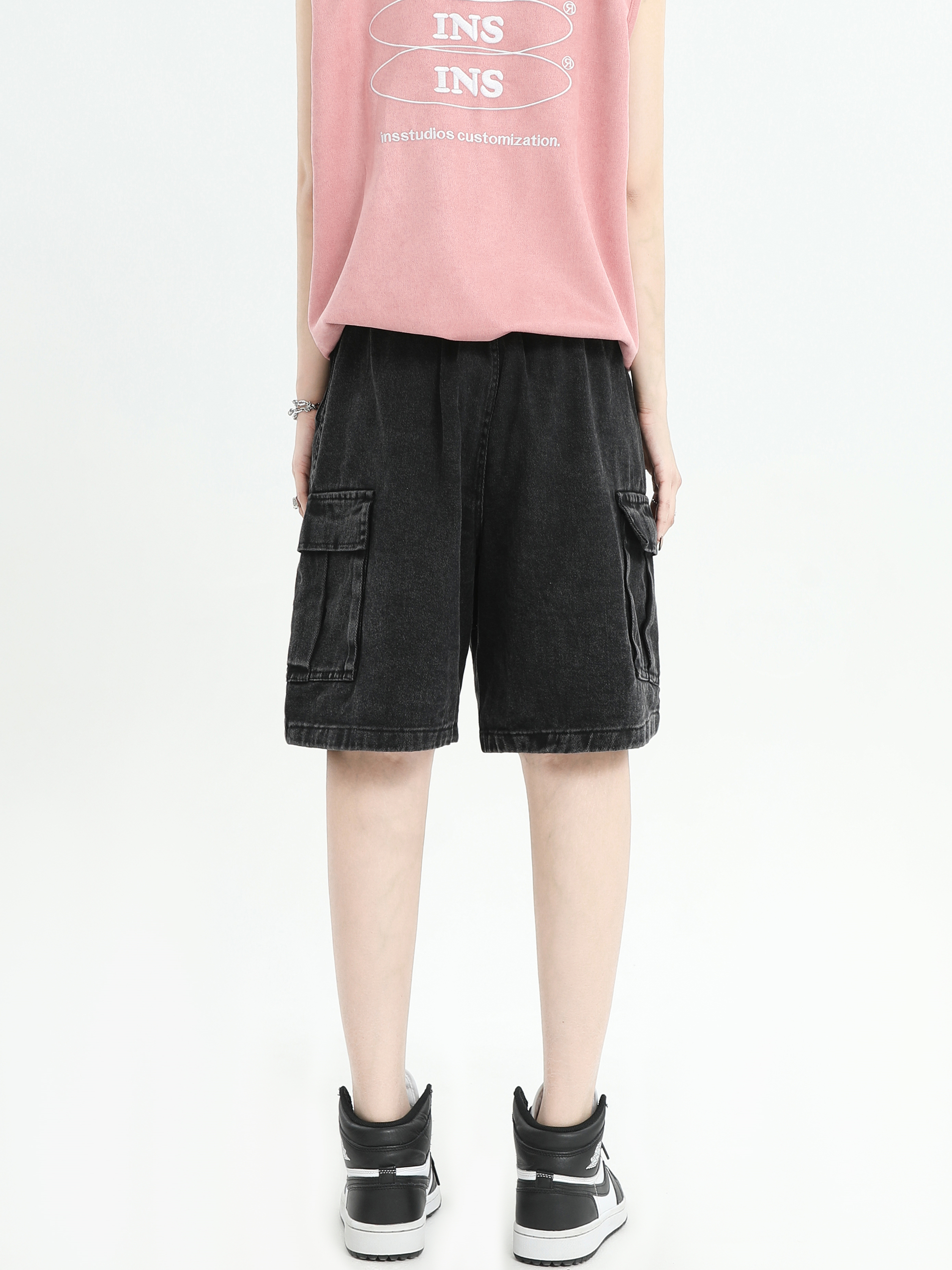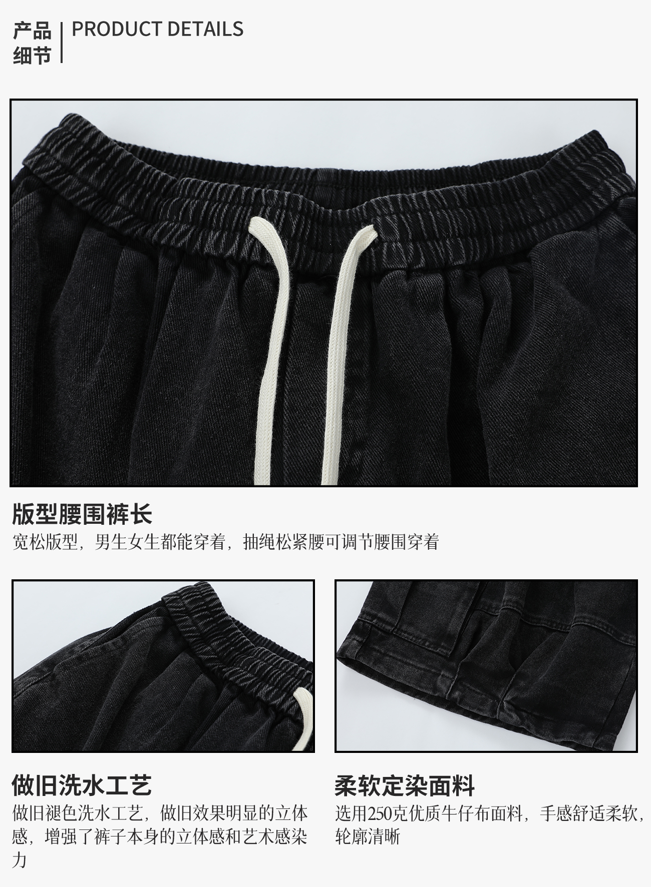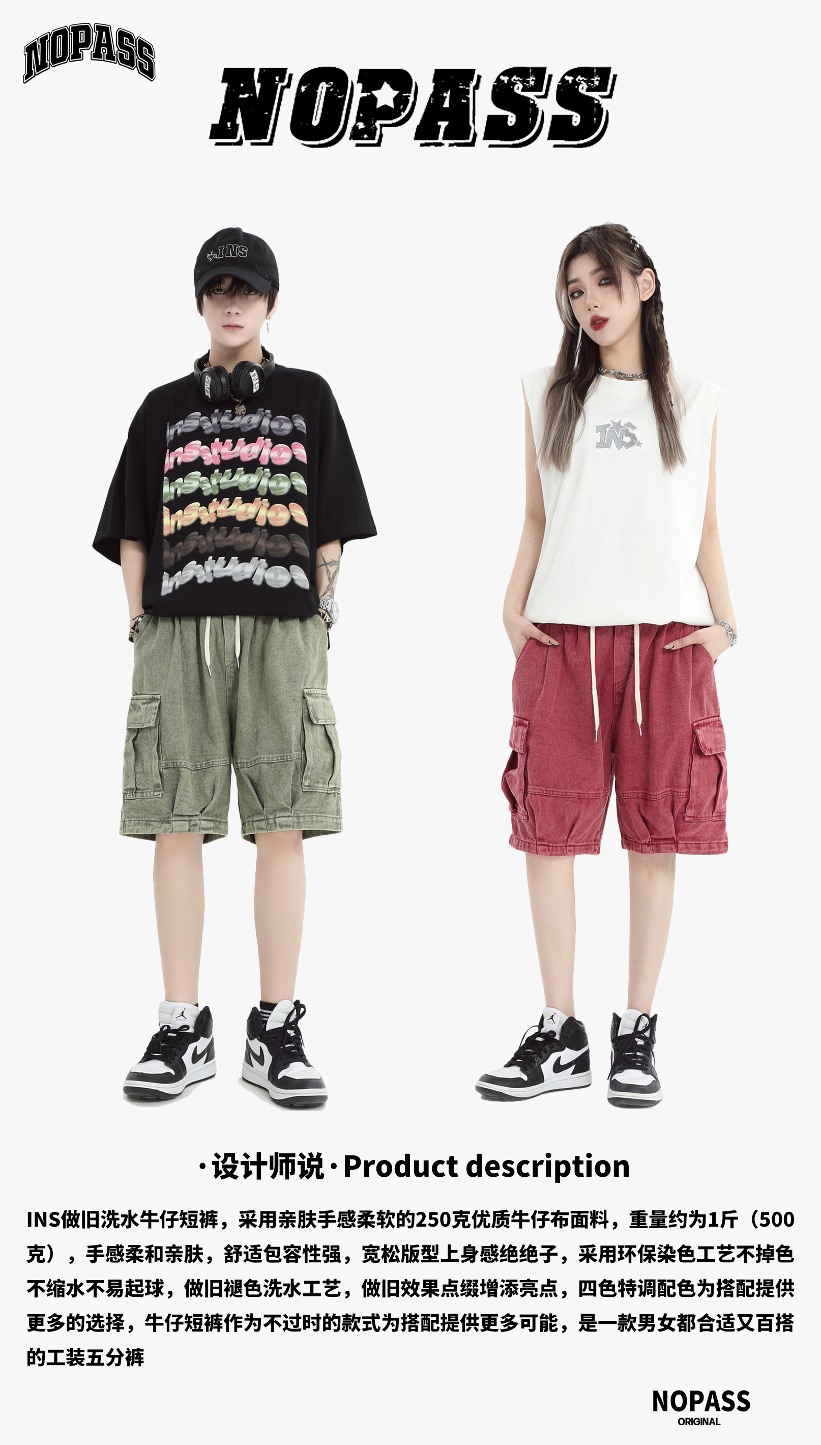 NOPASS 國潮牌情侶原創美式做舊洗水牛仔短褲寬鬆貼袋工裝五分褲