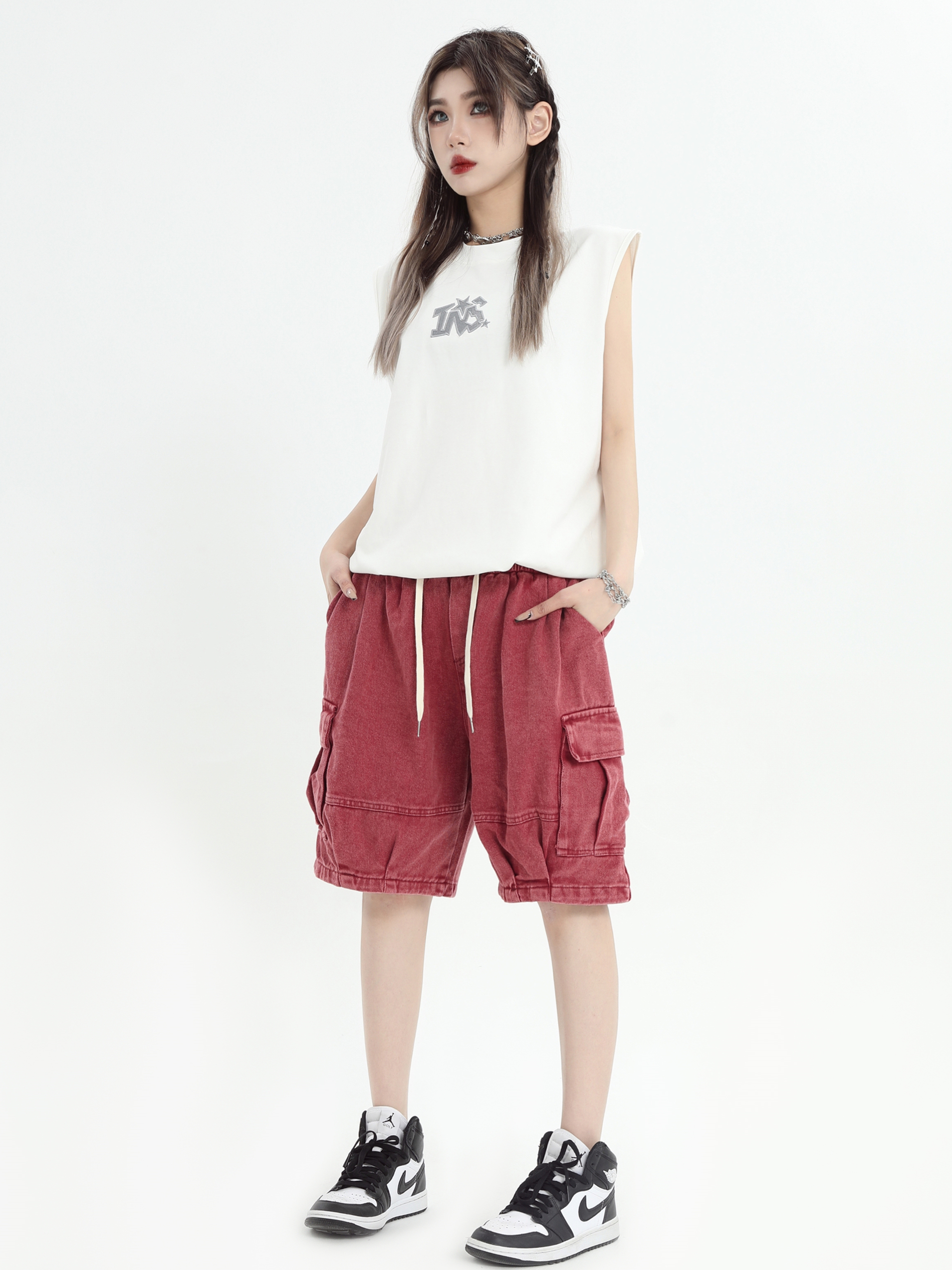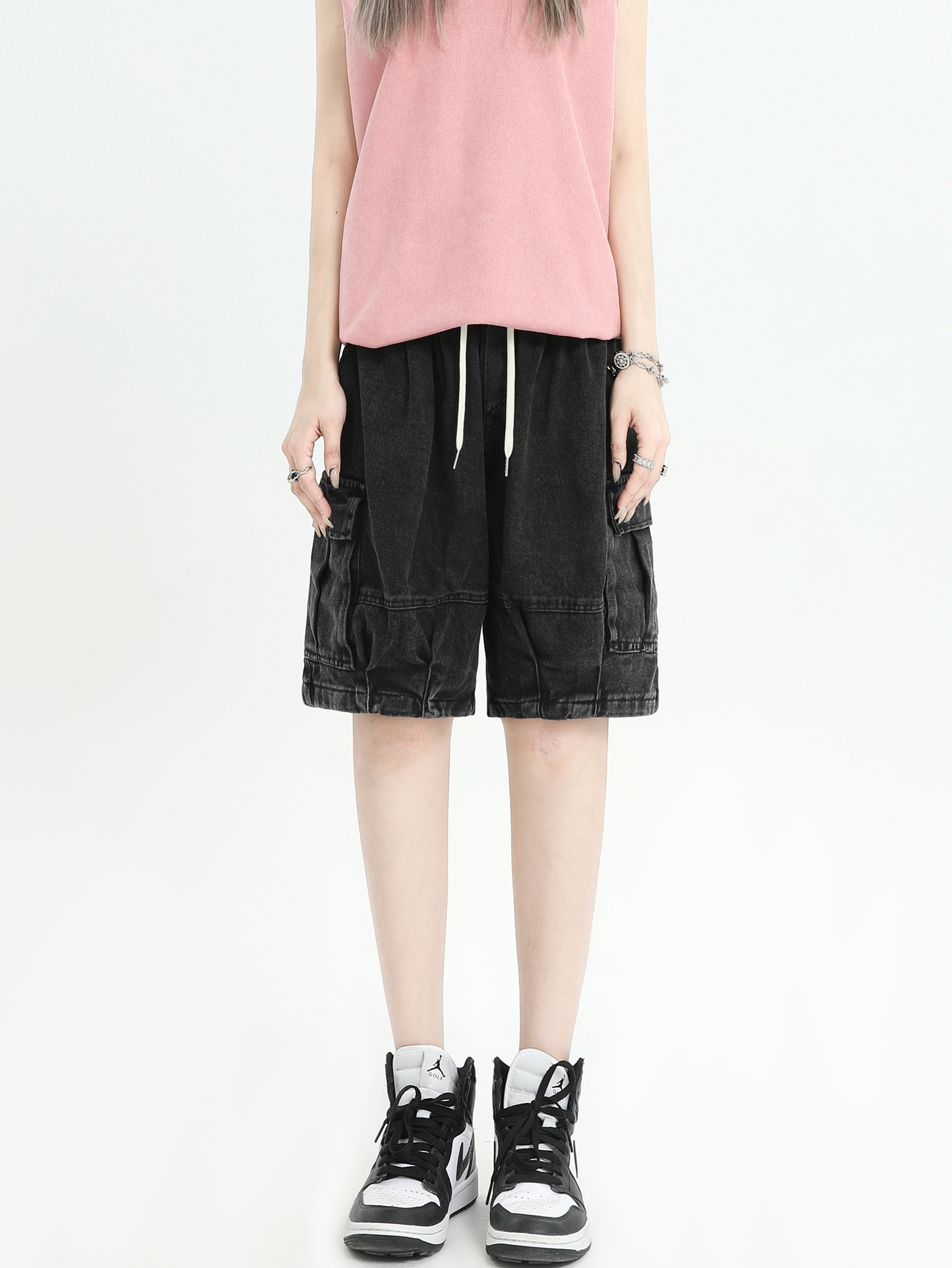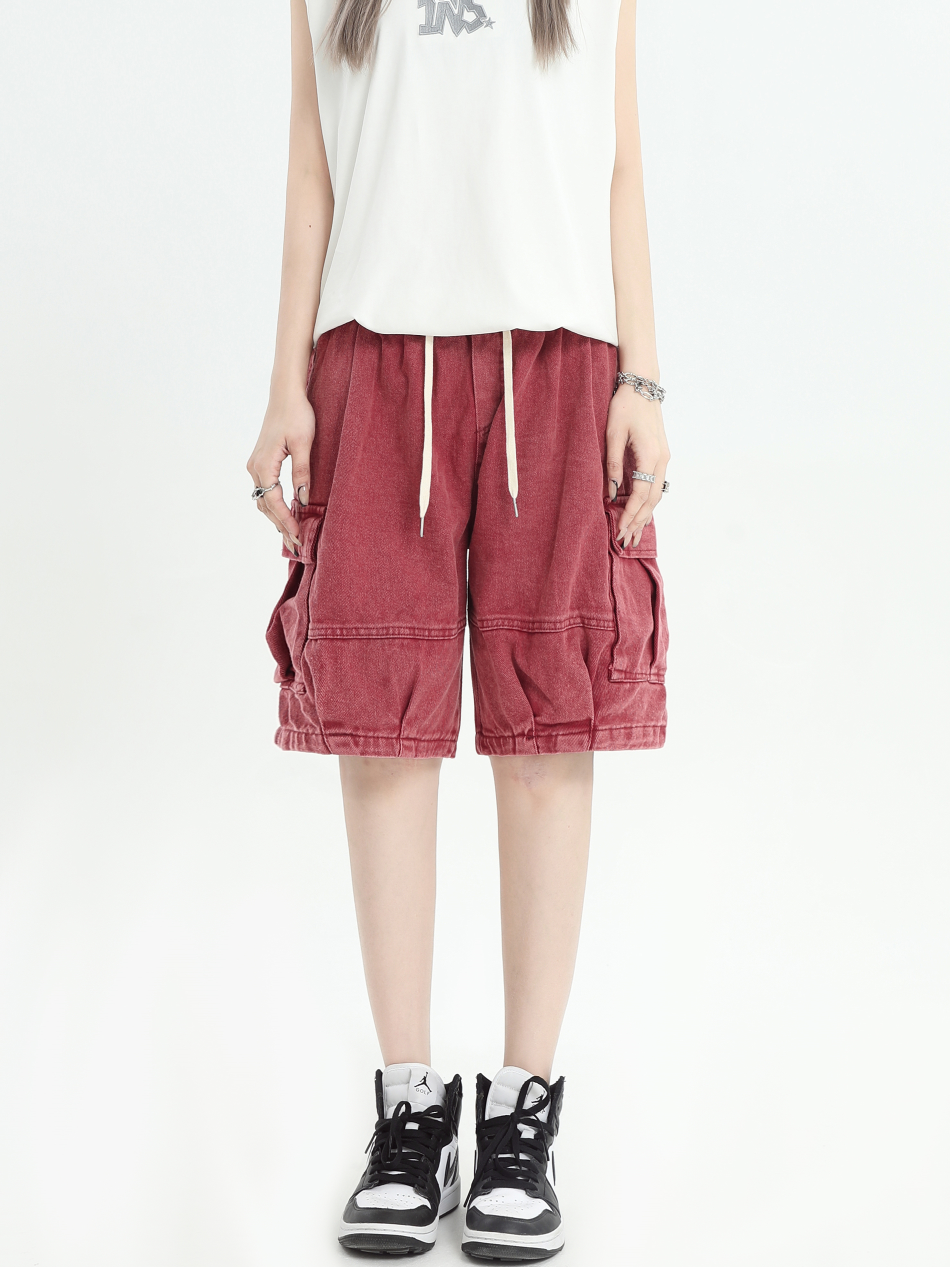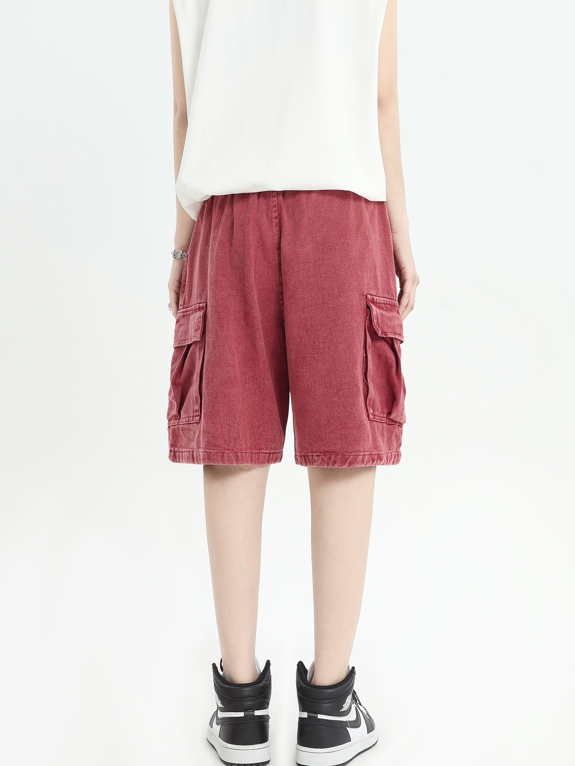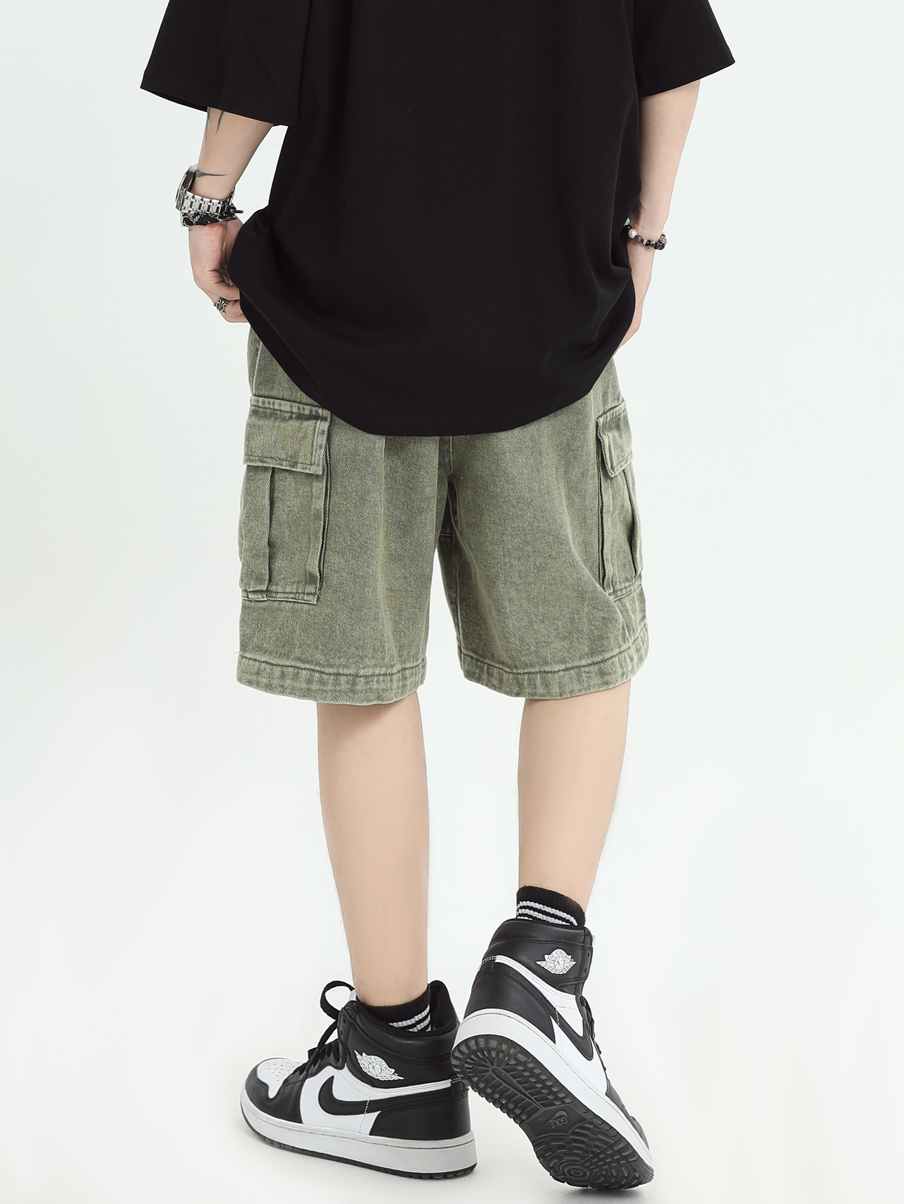 NOPASS 國潮牌情侶原創美式做舊洗水牛仔短褲寬鬆貼袋工裝五分褲