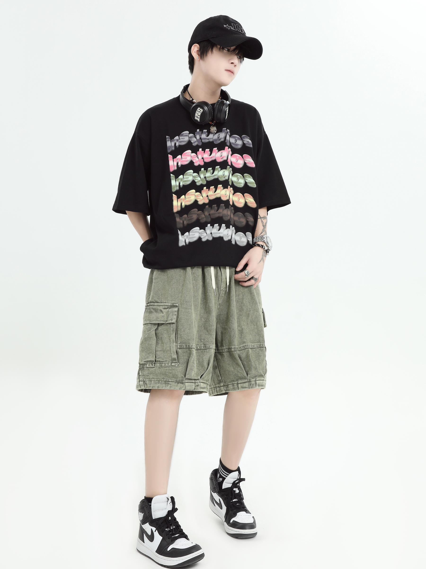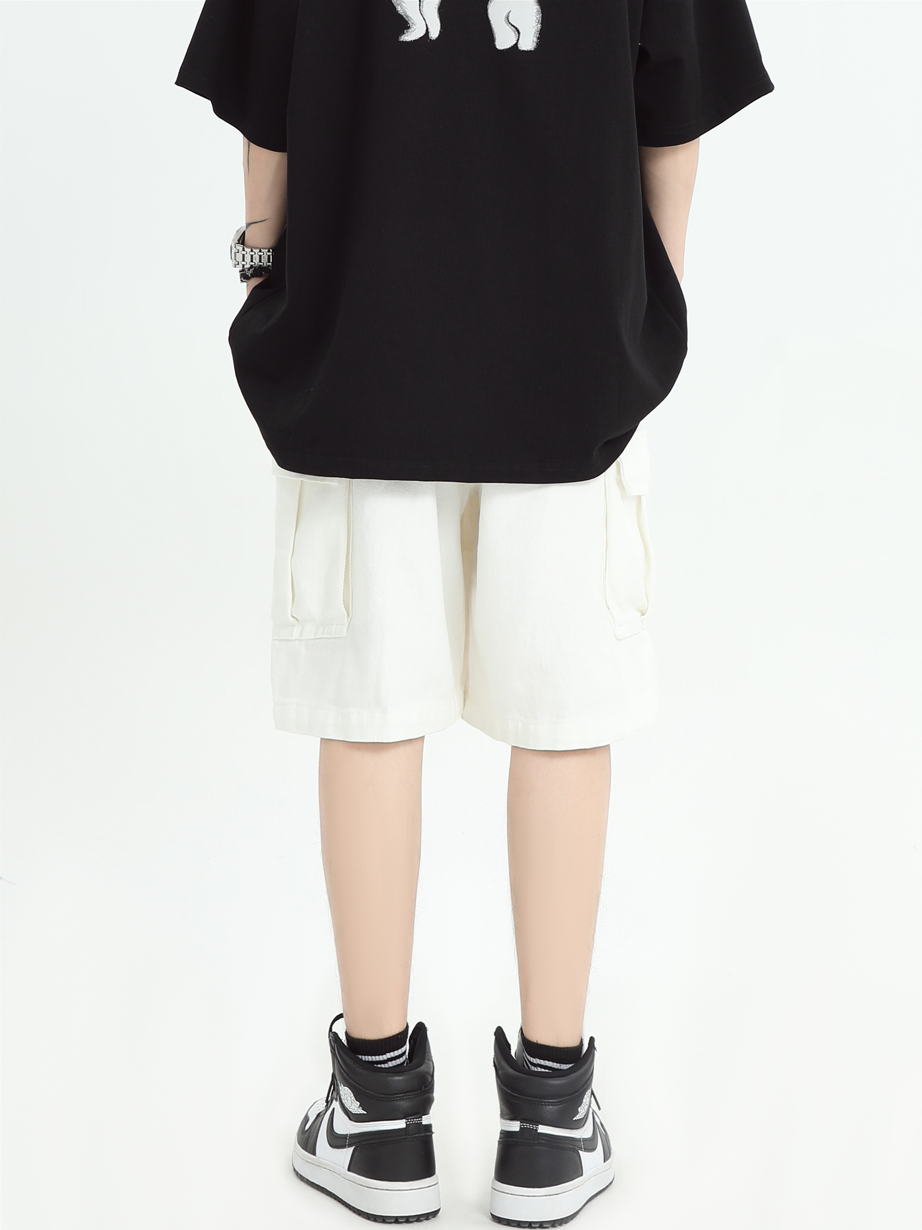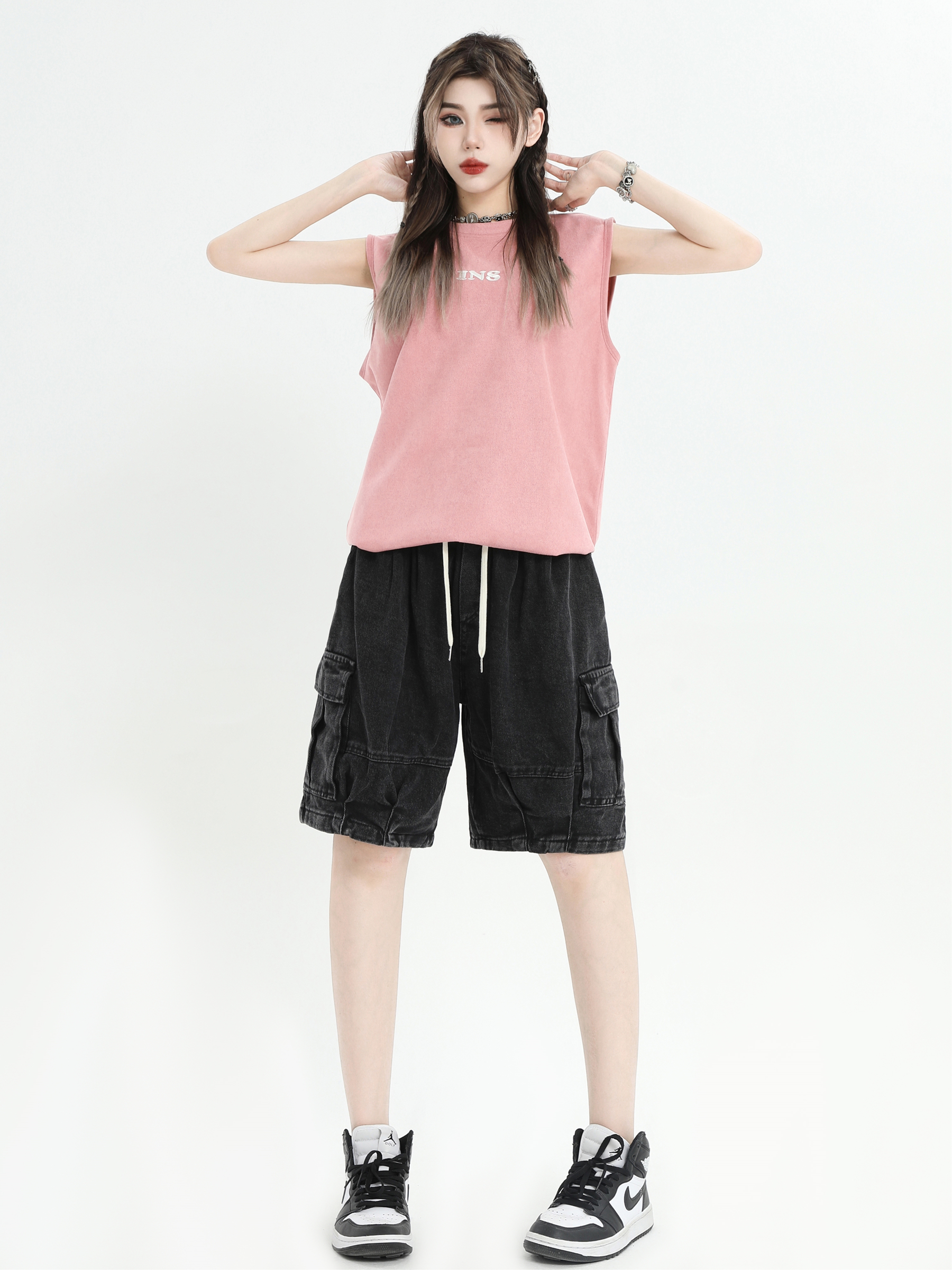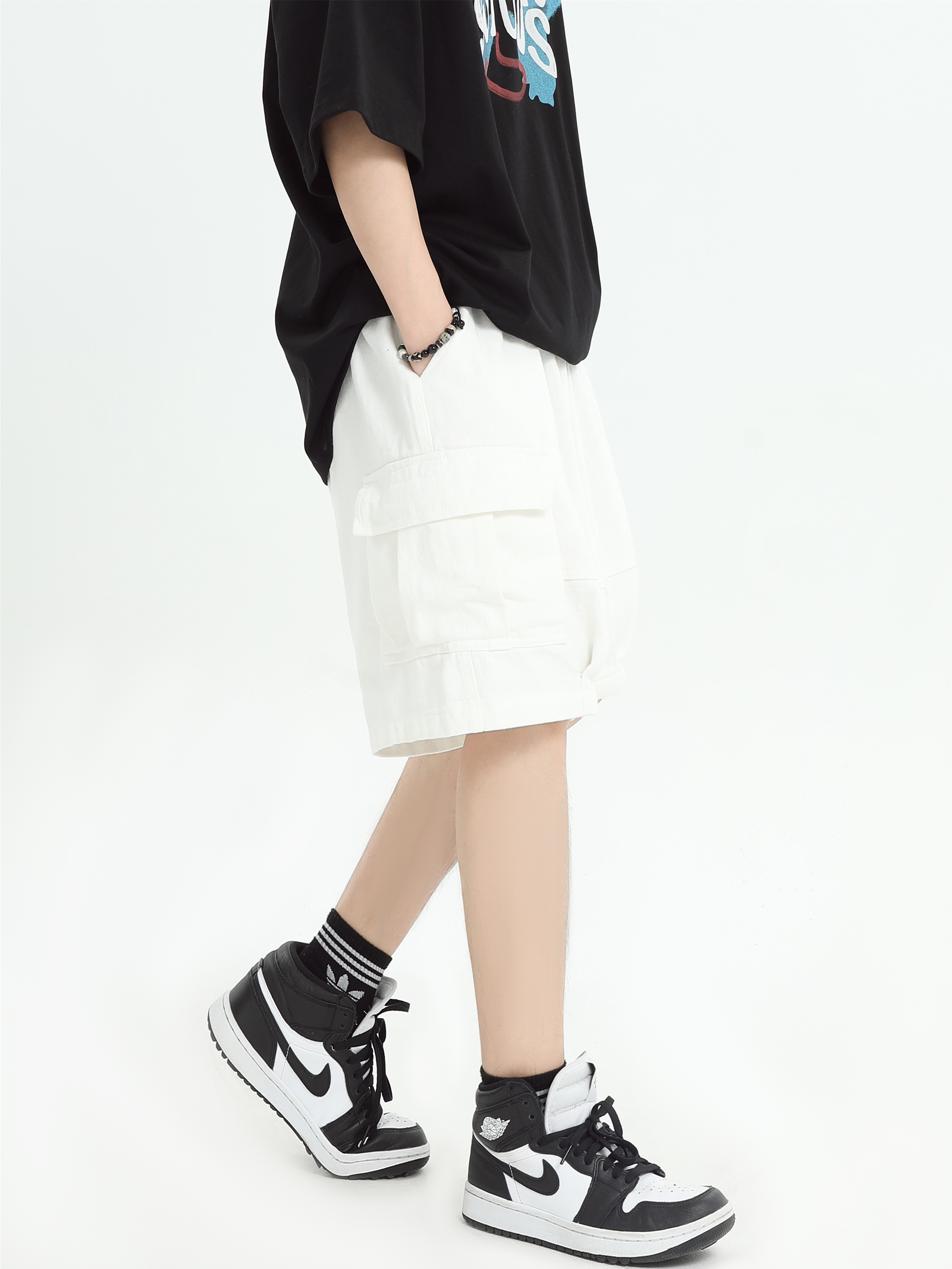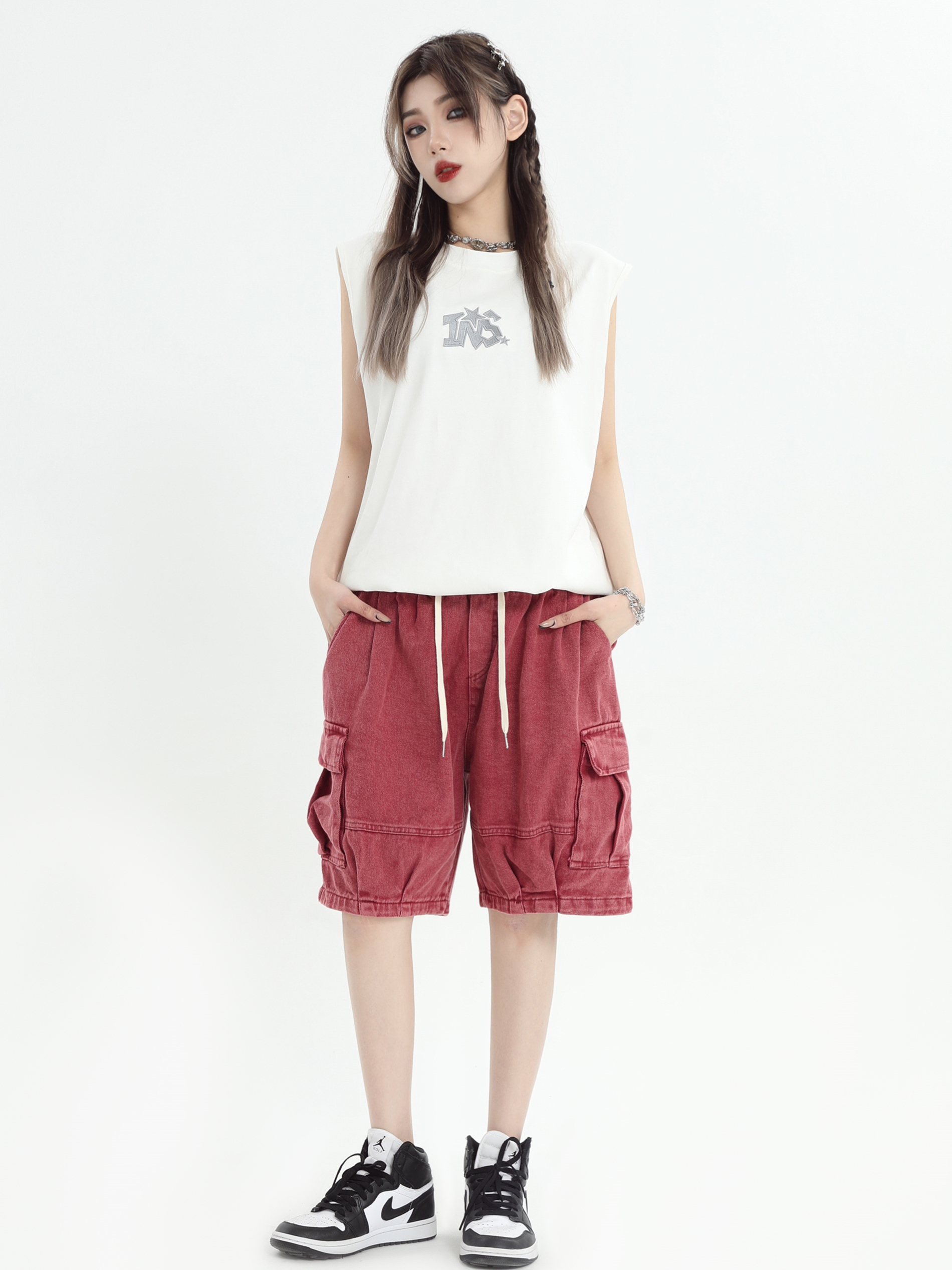 NOPASS 國潮牌情侶原創美式做舊洗水牛仔短褲寬鬆貼袋工裝五分褲