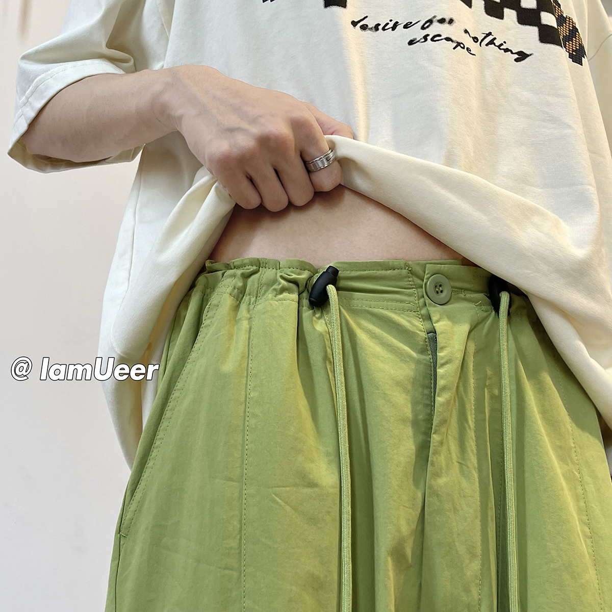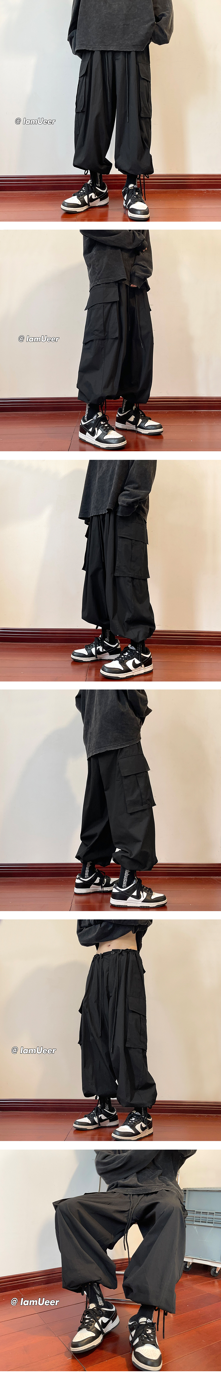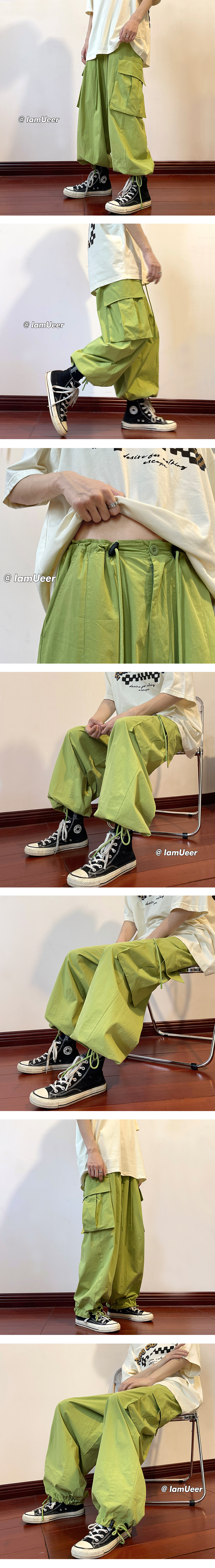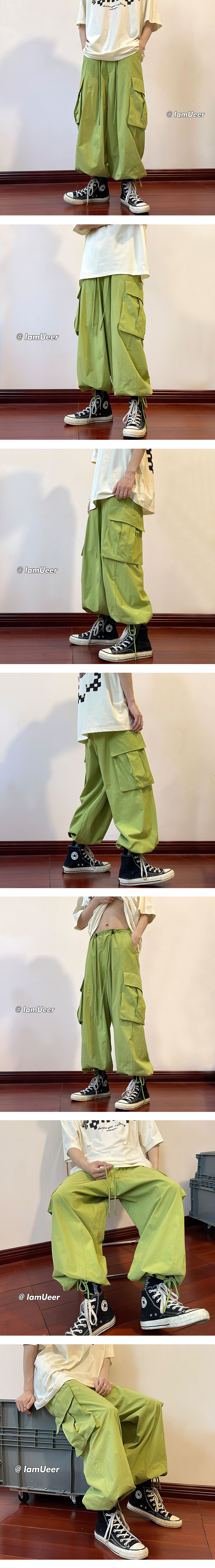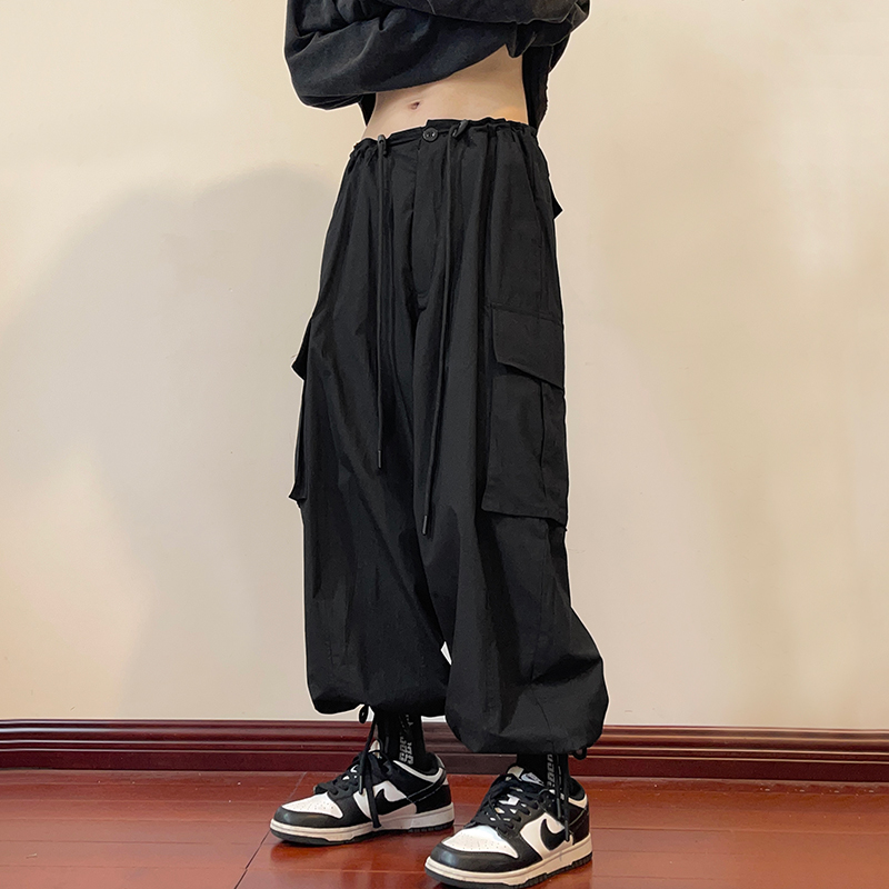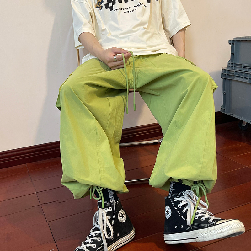 日系oversize褲子ins高街綠色工裝褲男夏季闊腿美式哈倫燈籠褲