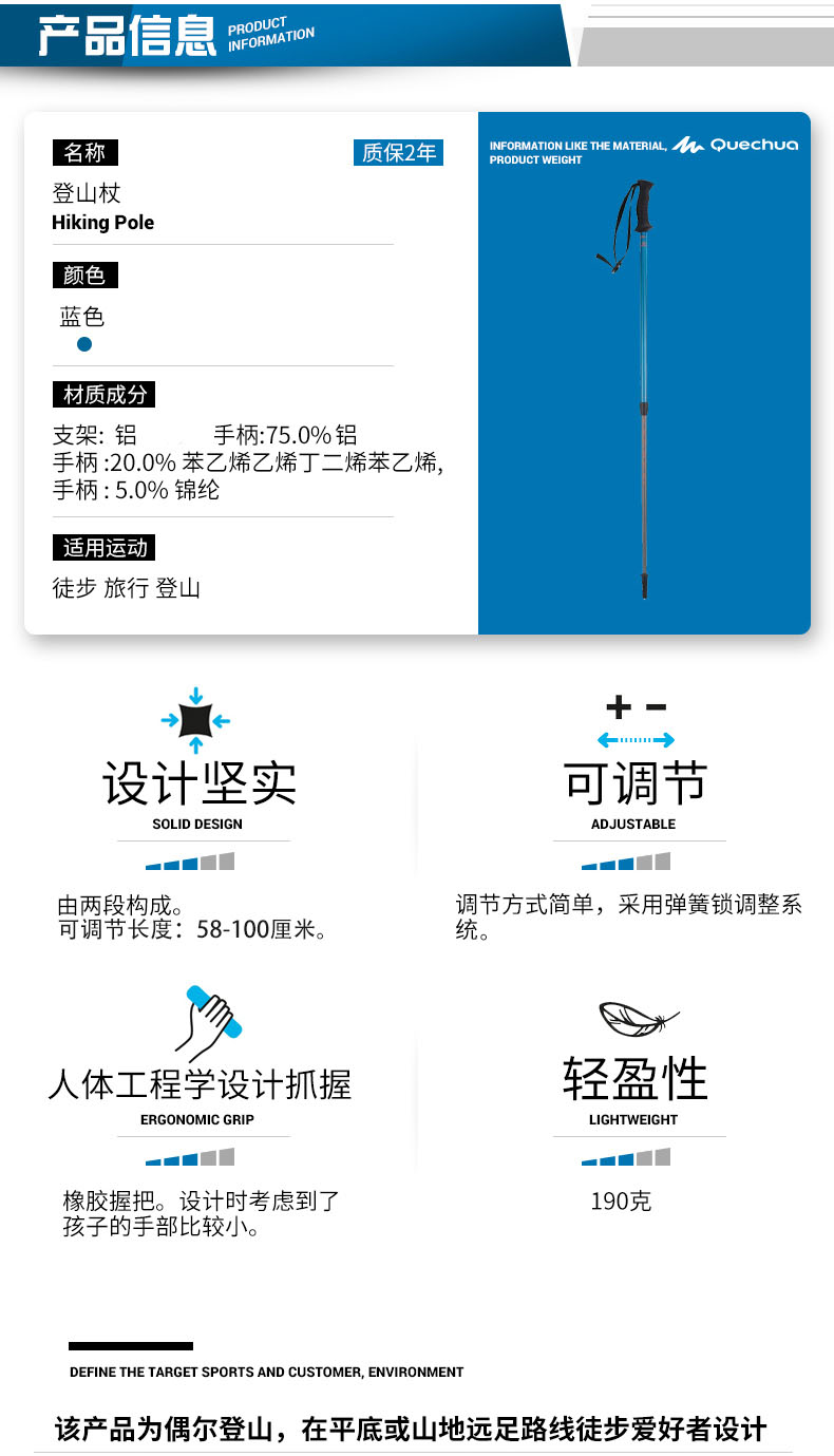 迪卡儂戶外伸縮登山杖兒童青少年徒步手杖輕盈兩節可攜式柺杖KIDD