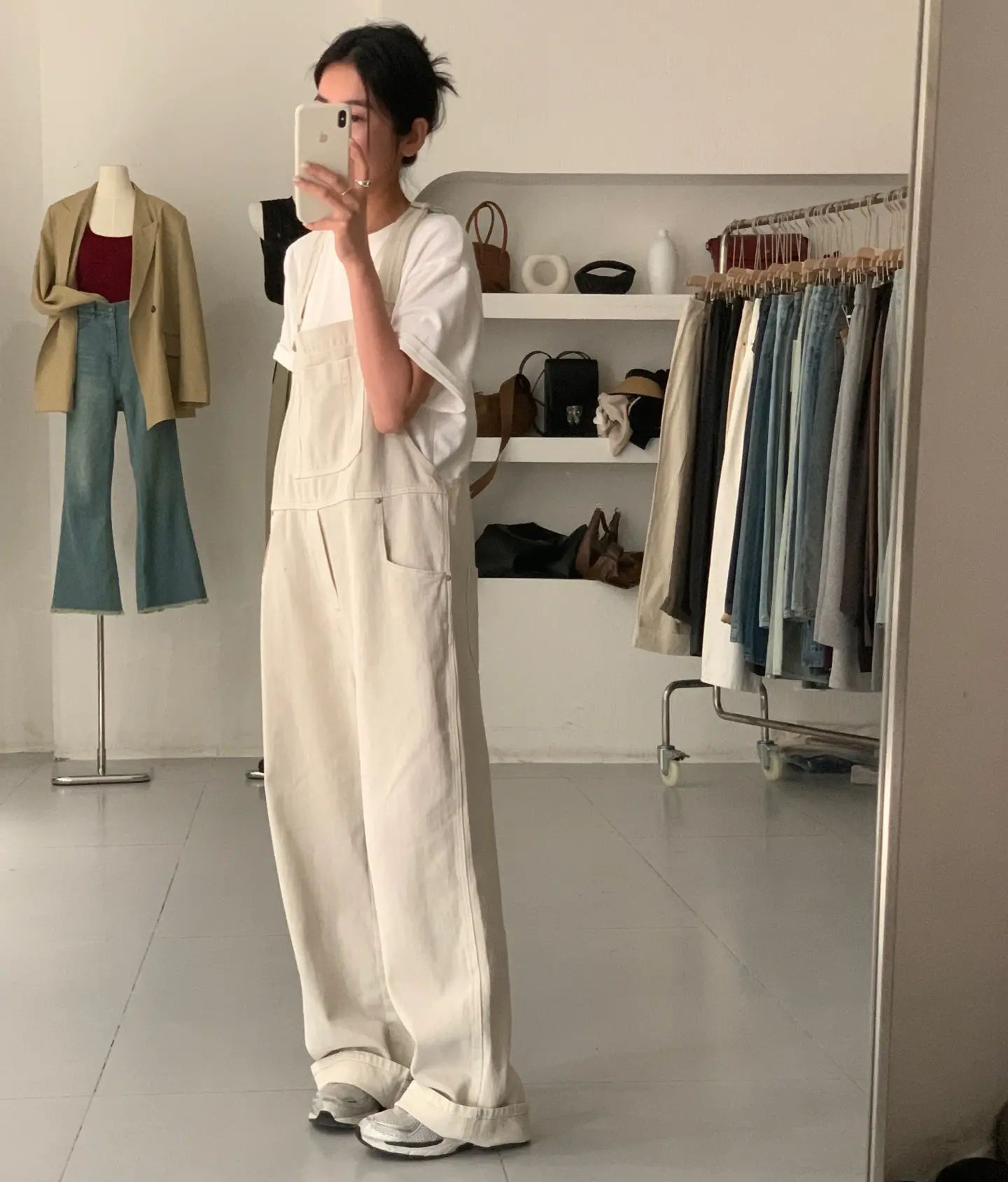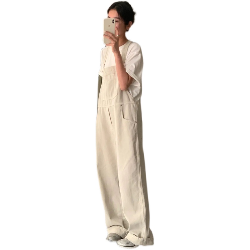 歐尼基礎款簡約寬鬆百搭無袖抱嬰袋連身褲拖地直筒闊腿休閒褲長褲子