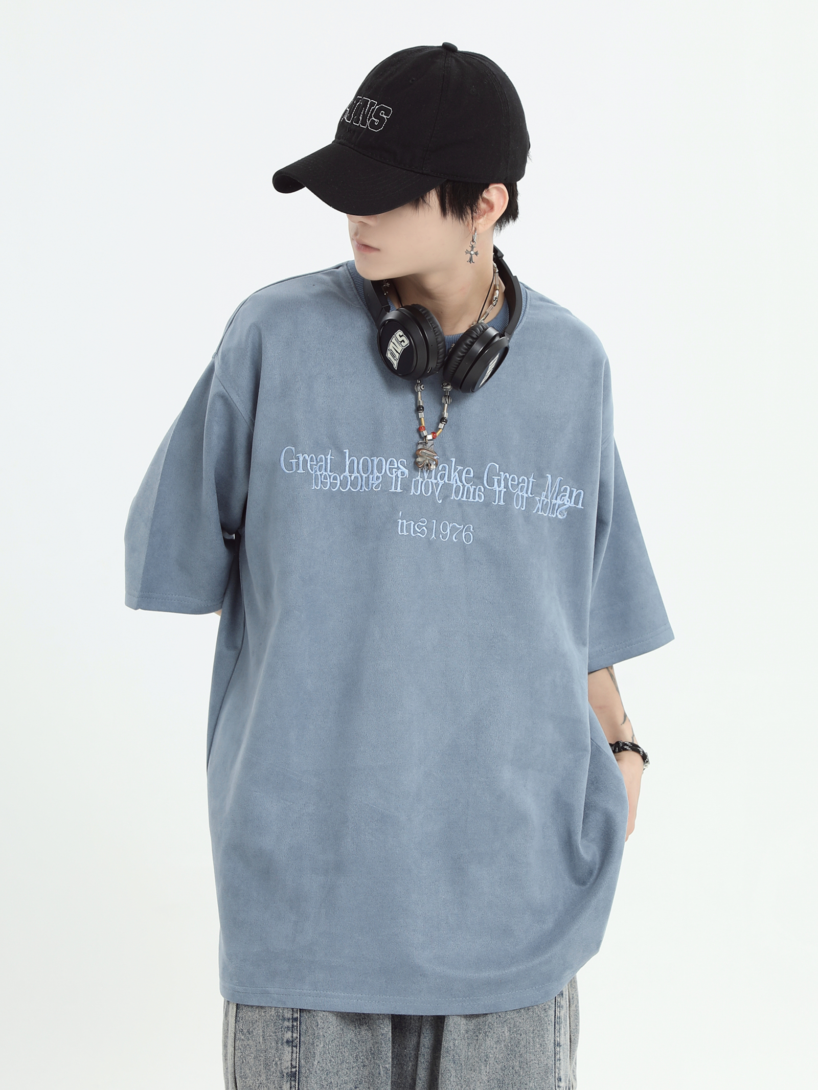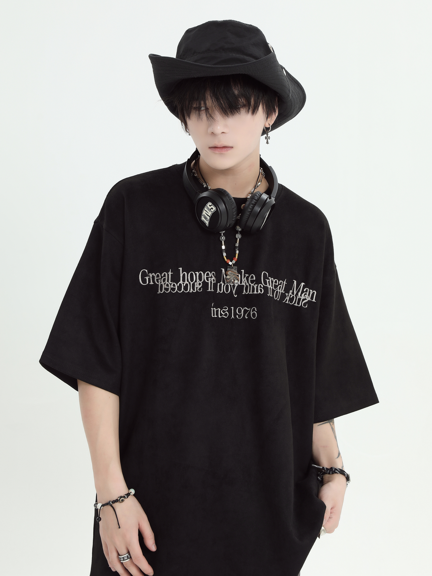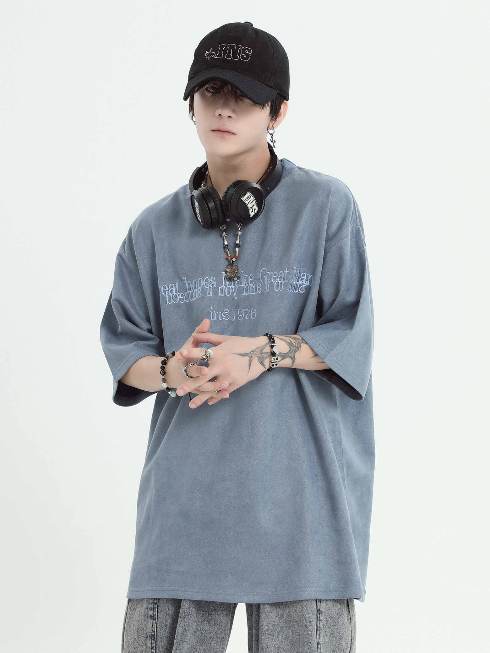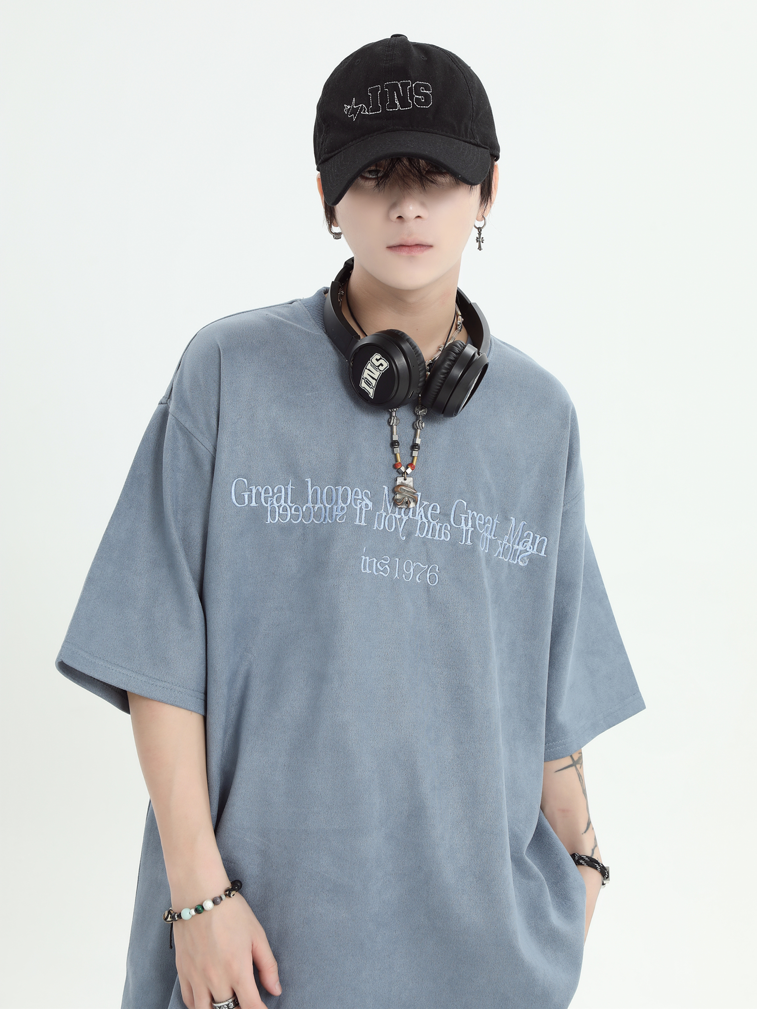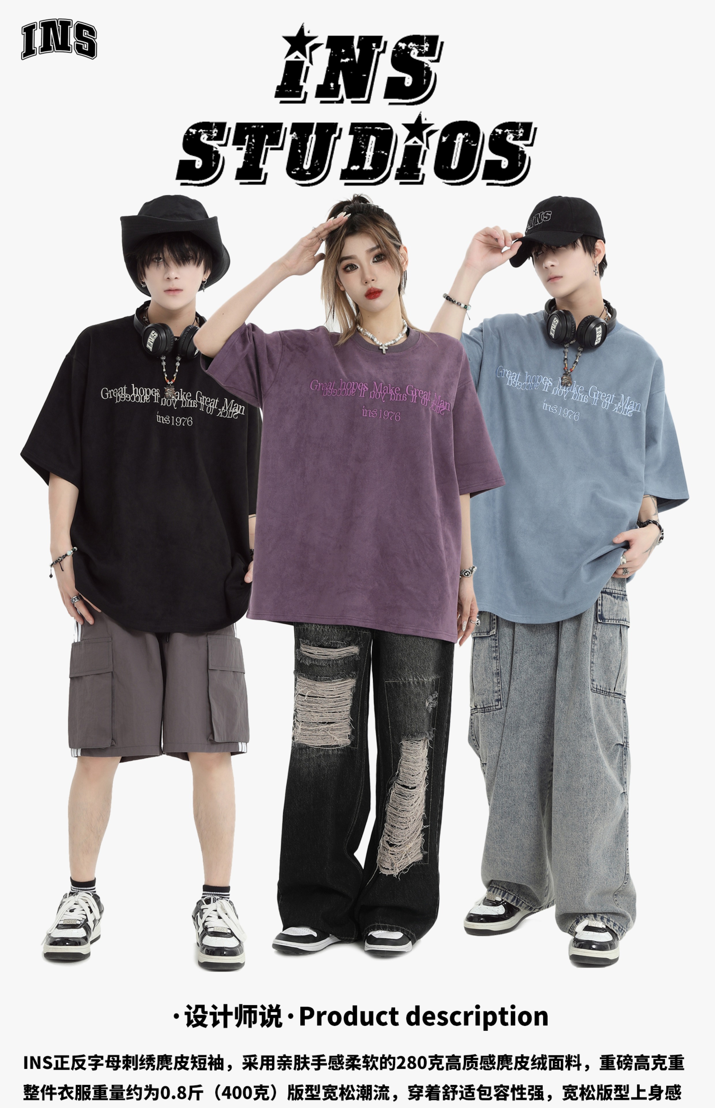 INSstudios 國潮牌情侶美式正反字母刺繡麂皮短袖寬鬆半袖T恤衫男