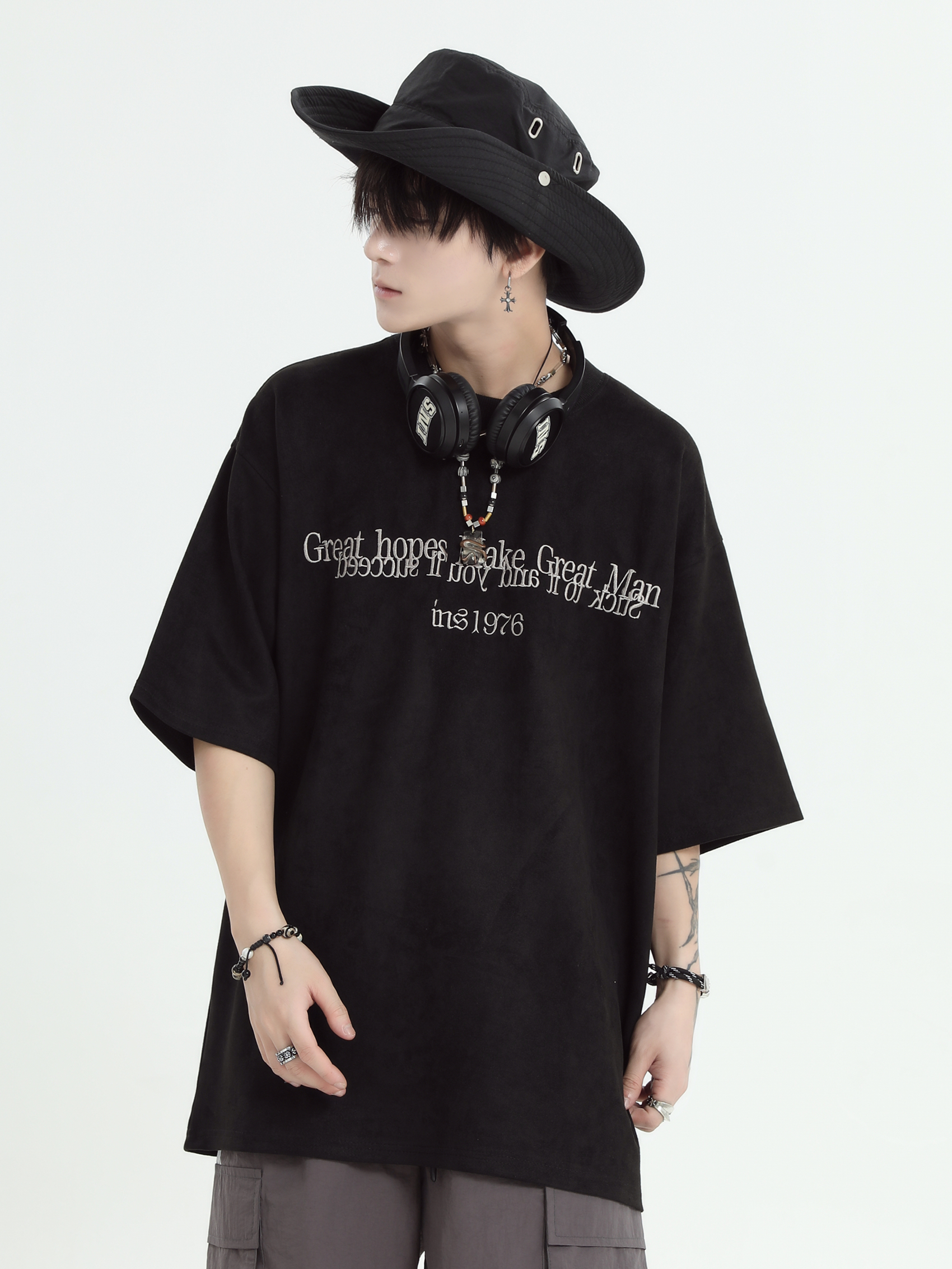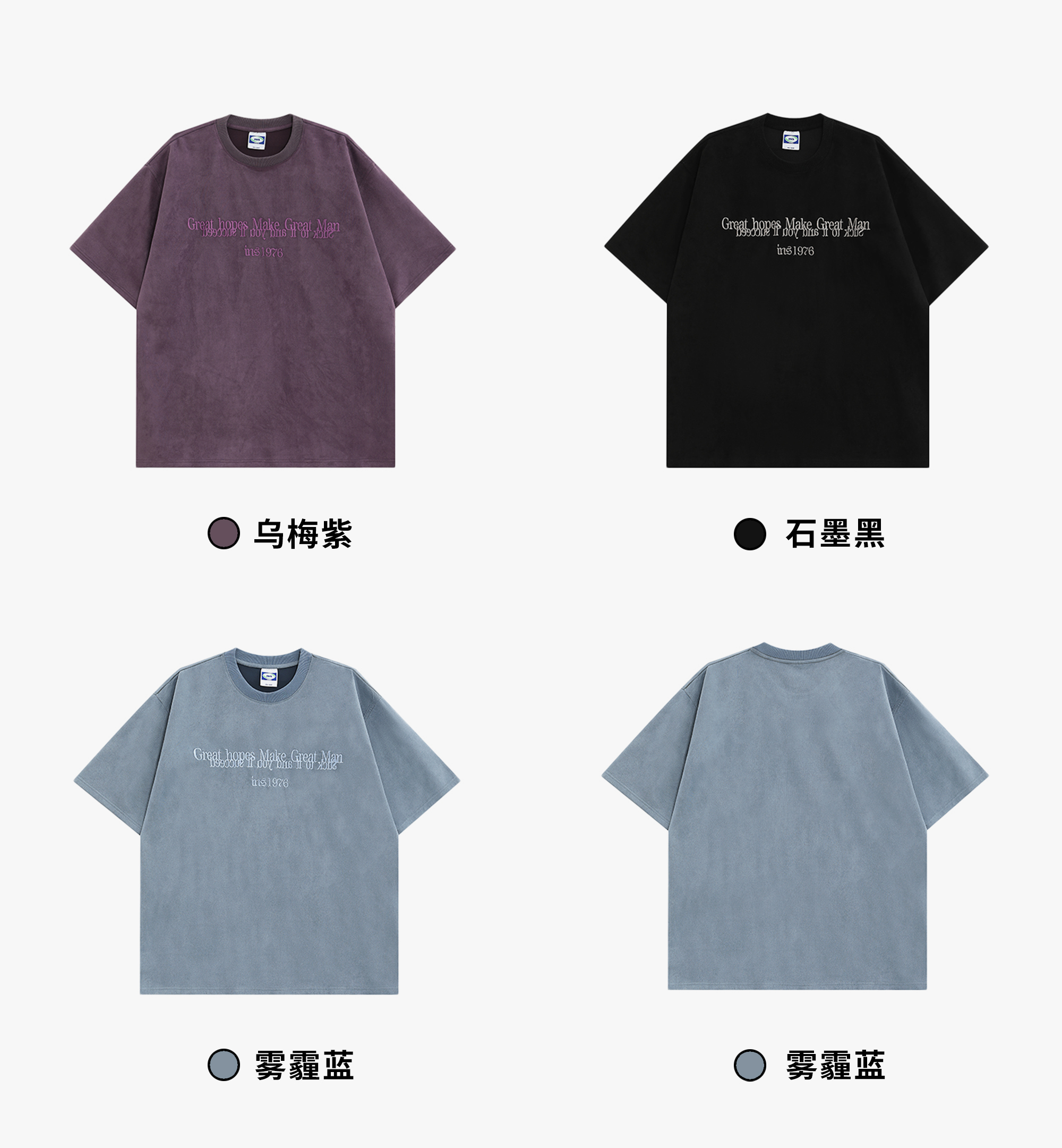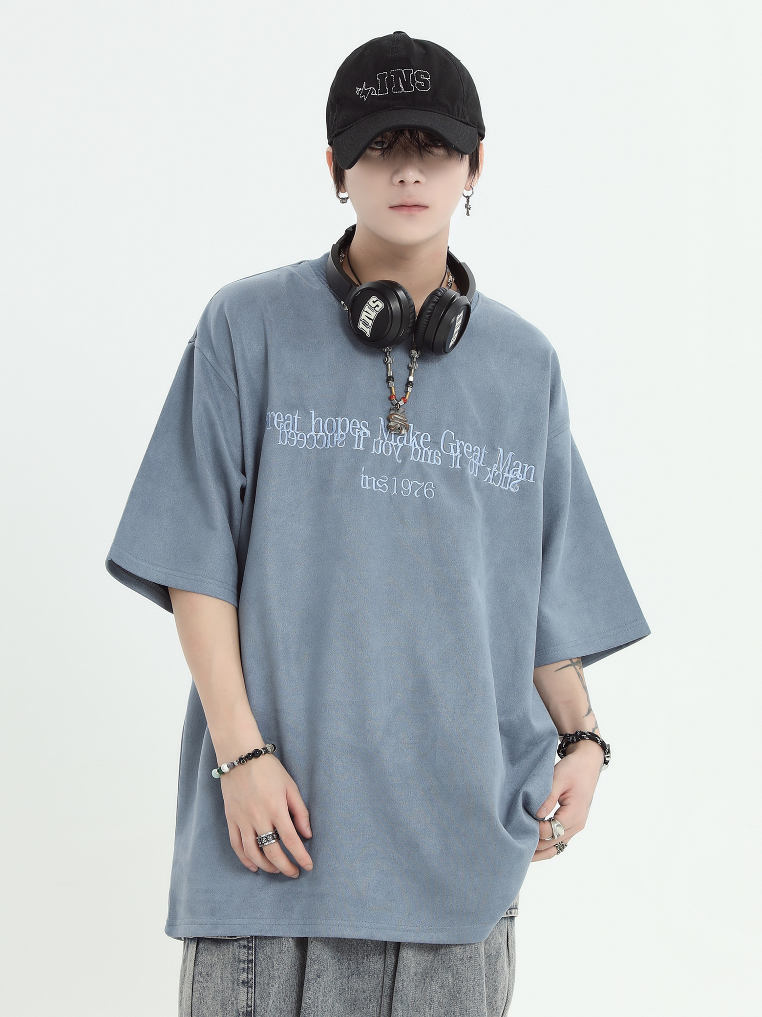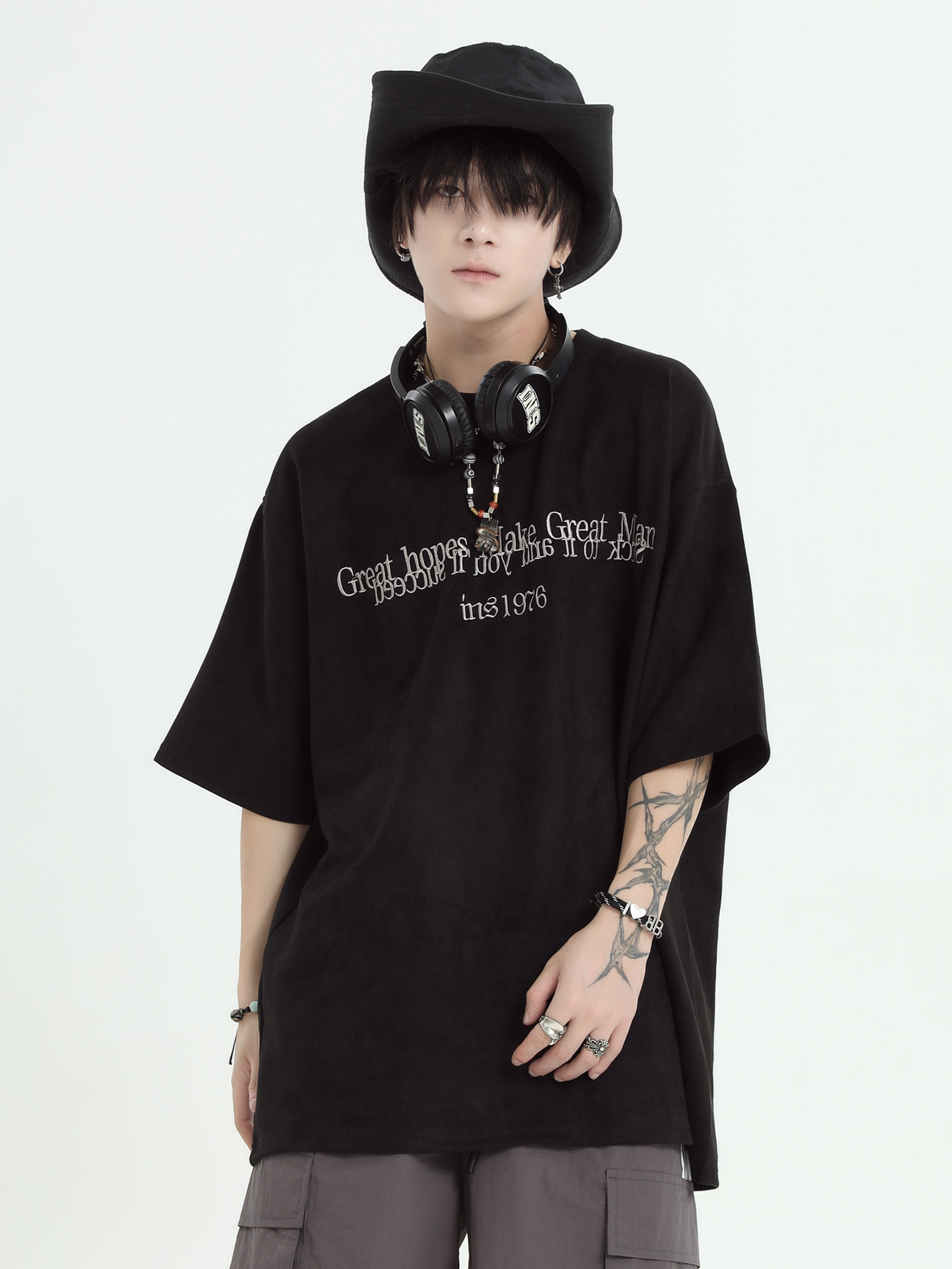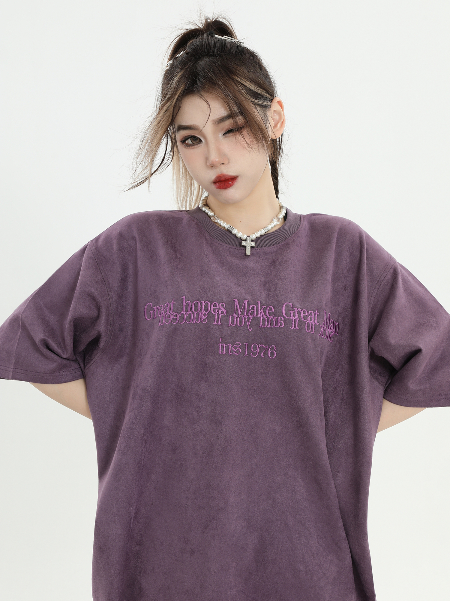 INSstudios 國潮牌情侶美式正反字母刺繡麂皮短袖寬鬆半袖T恤衫男