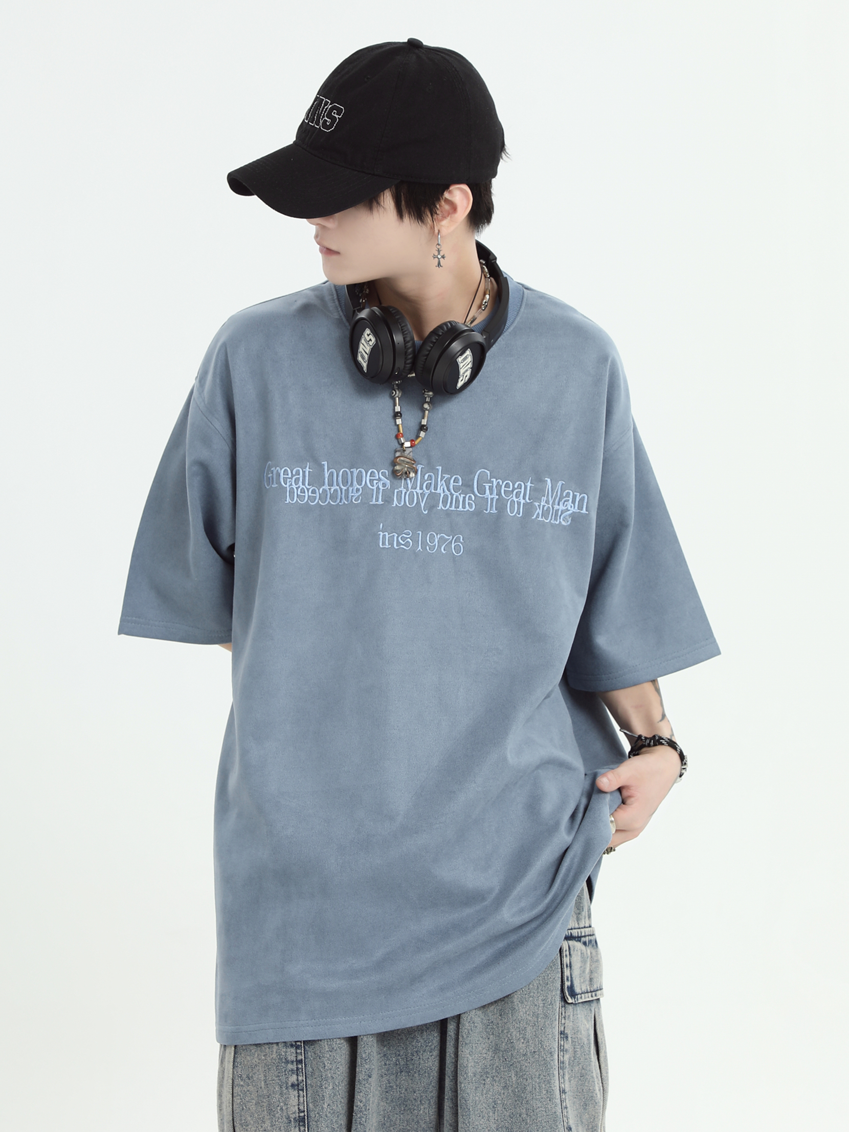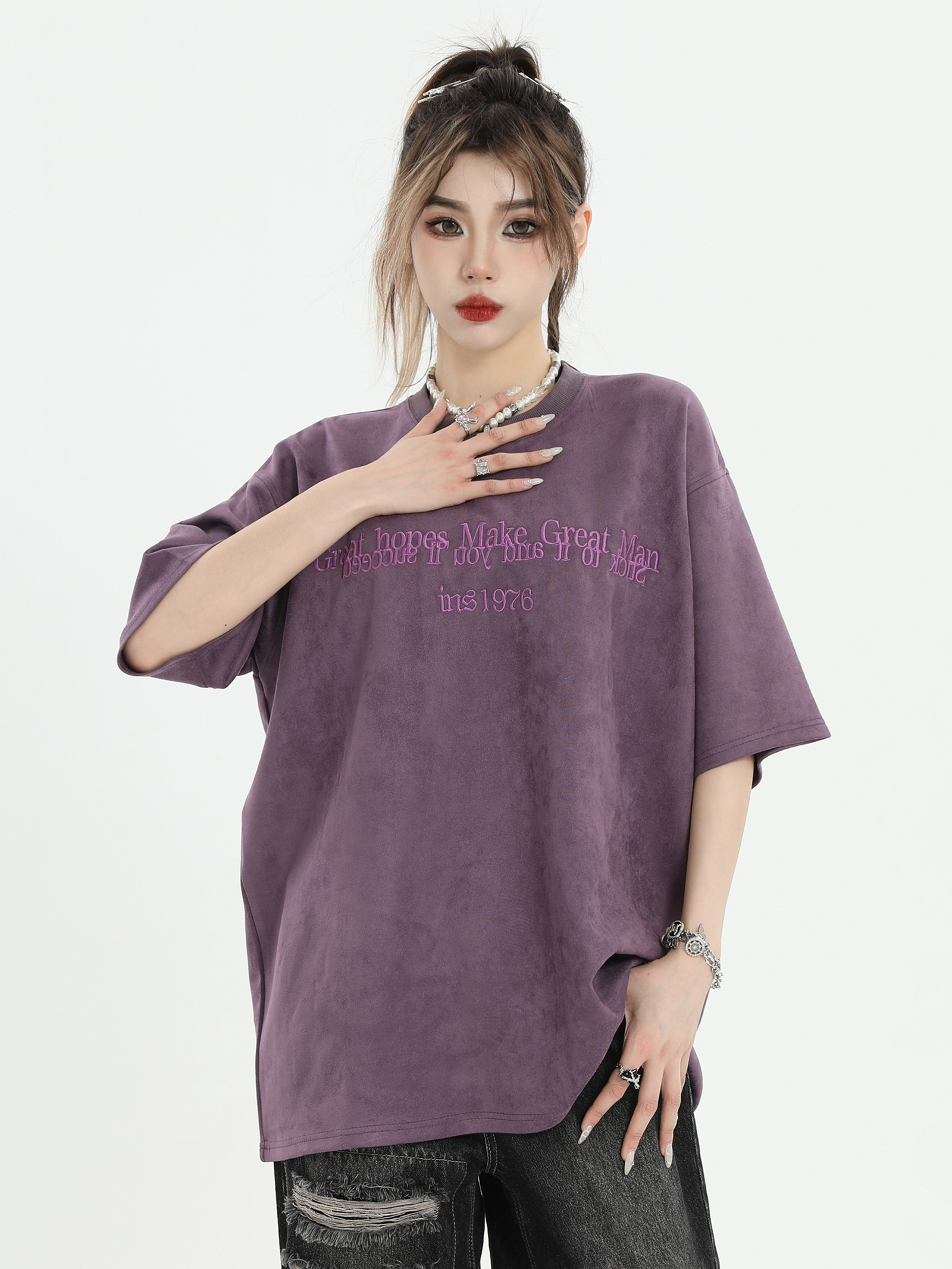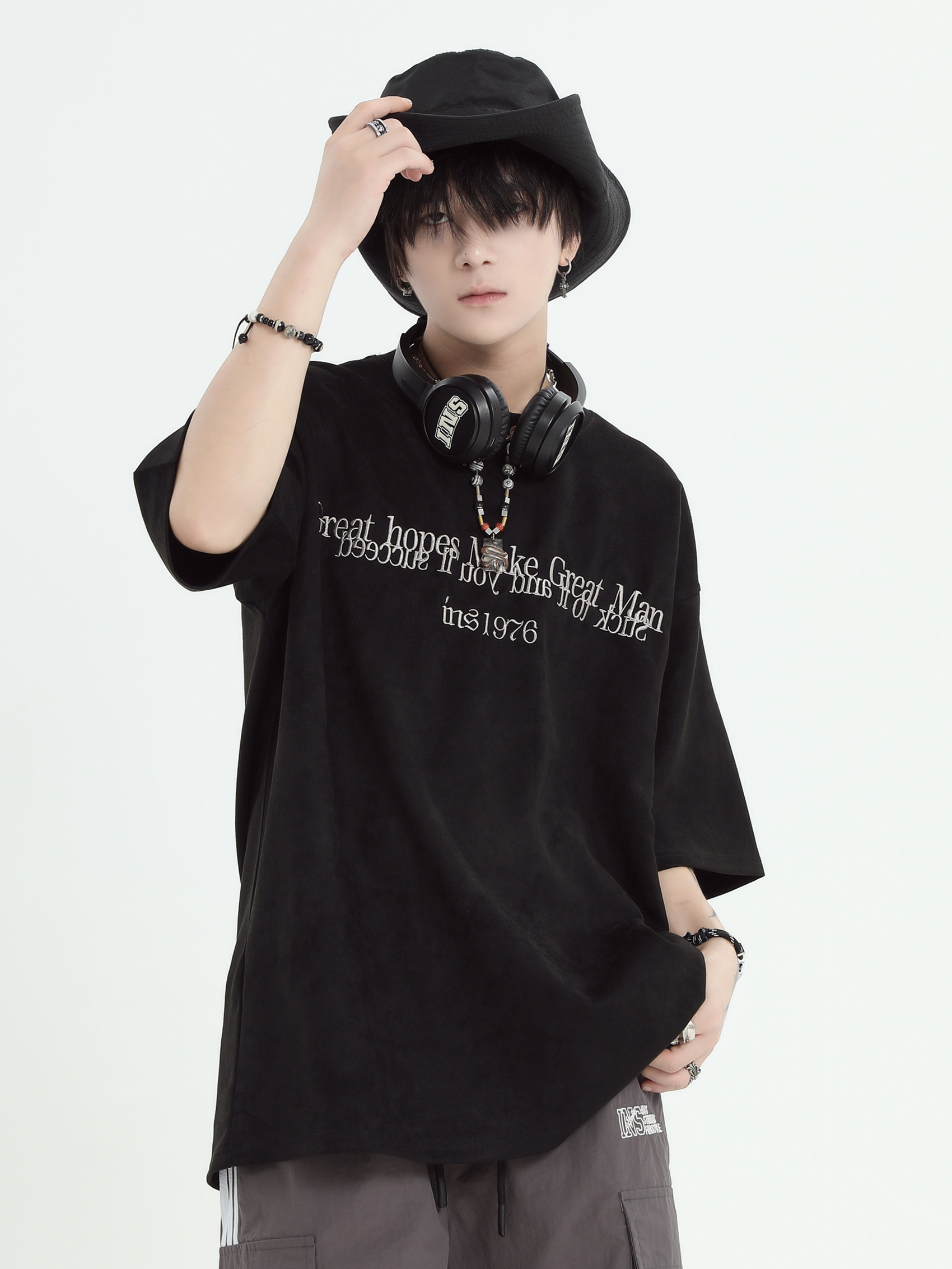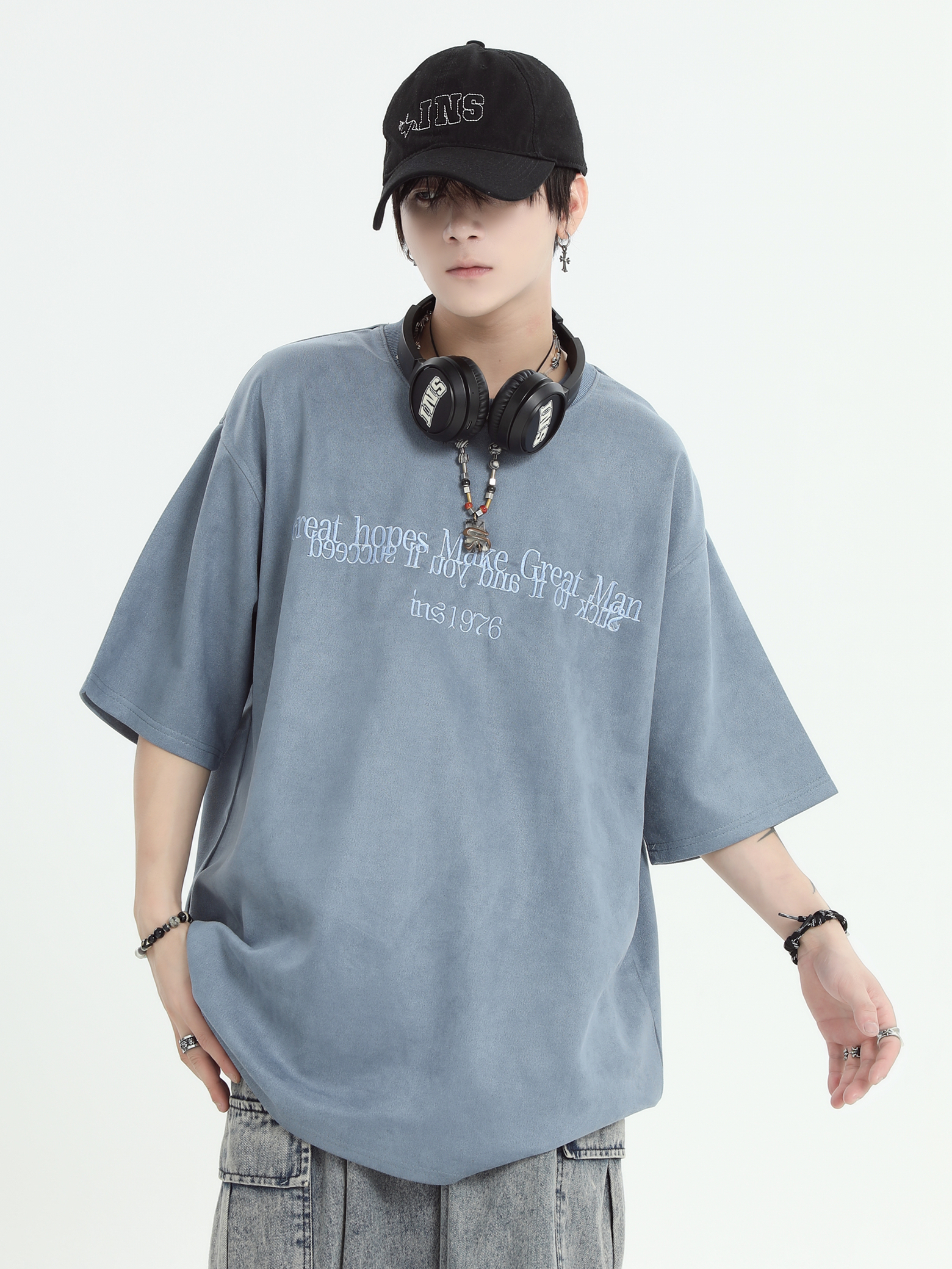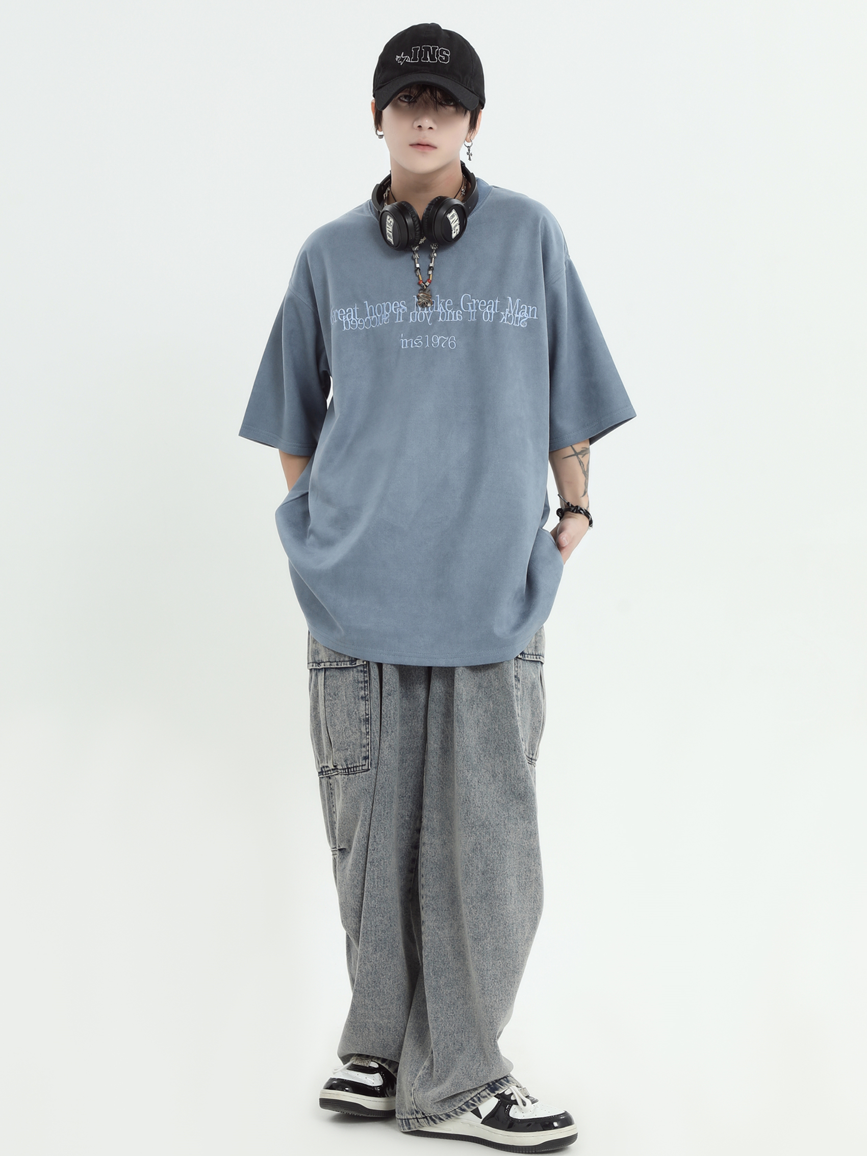 INSstudios 國潮牌情侶美式正反字母刺繡麂皮短袖寬鬆半袖T恤衫男