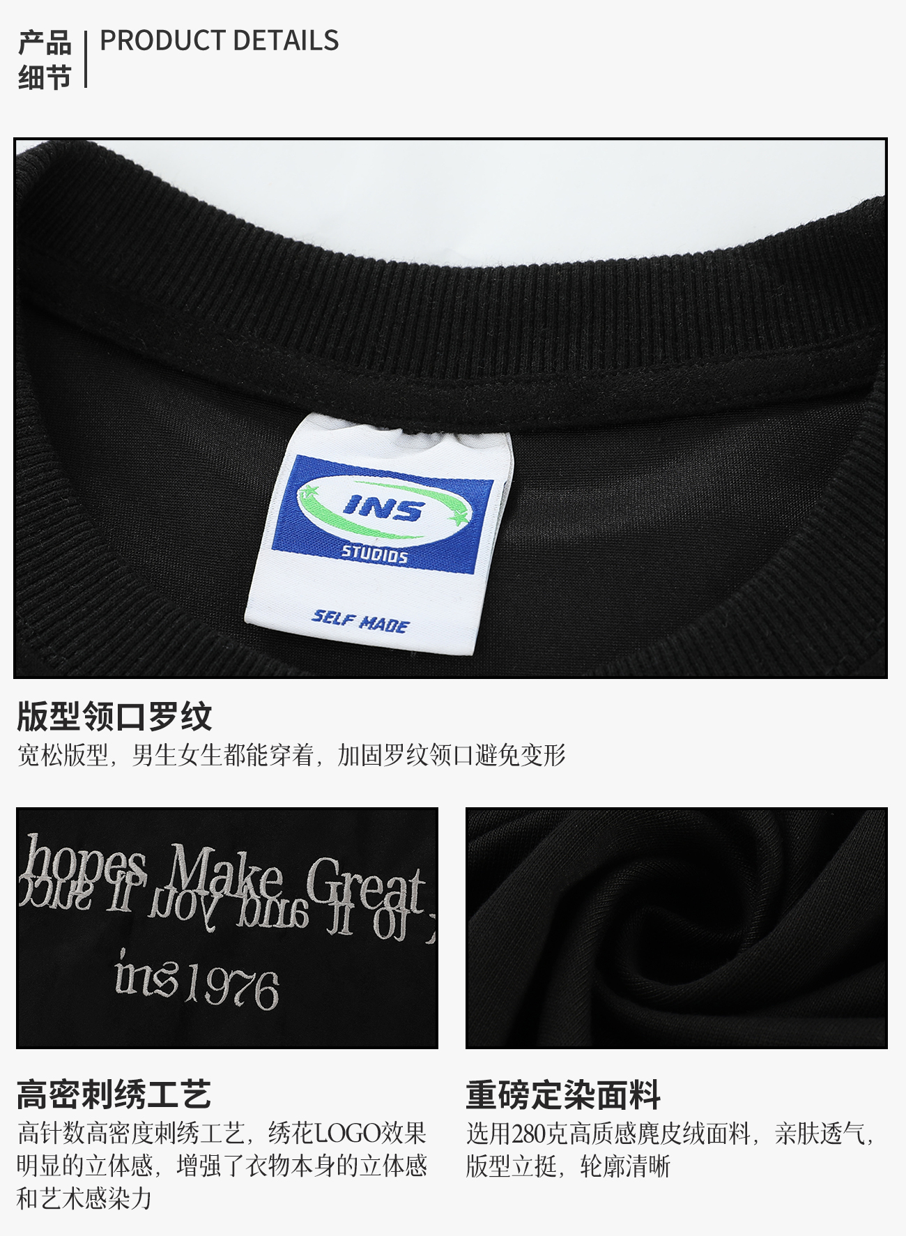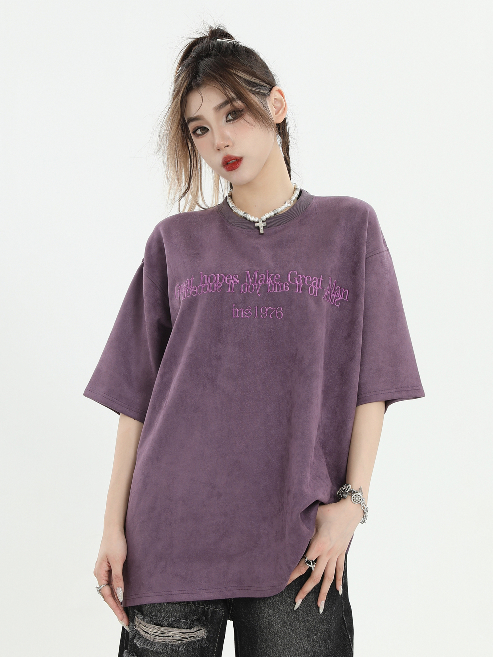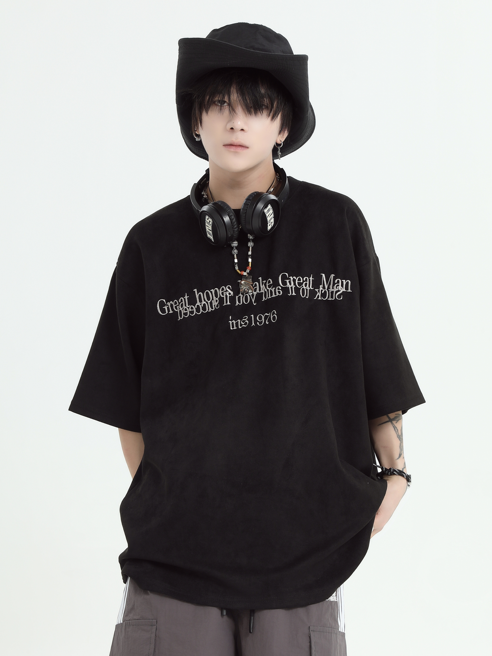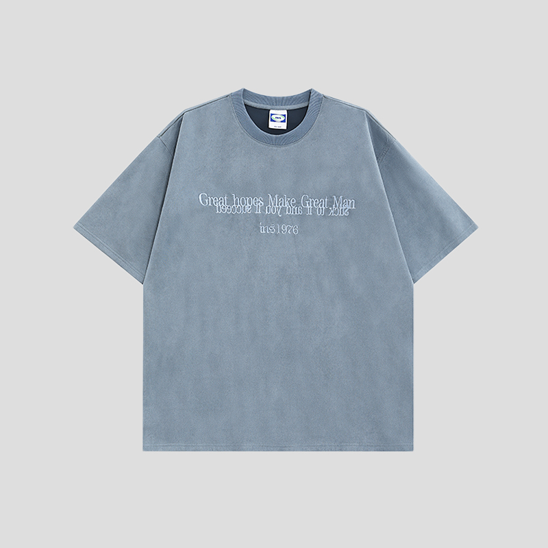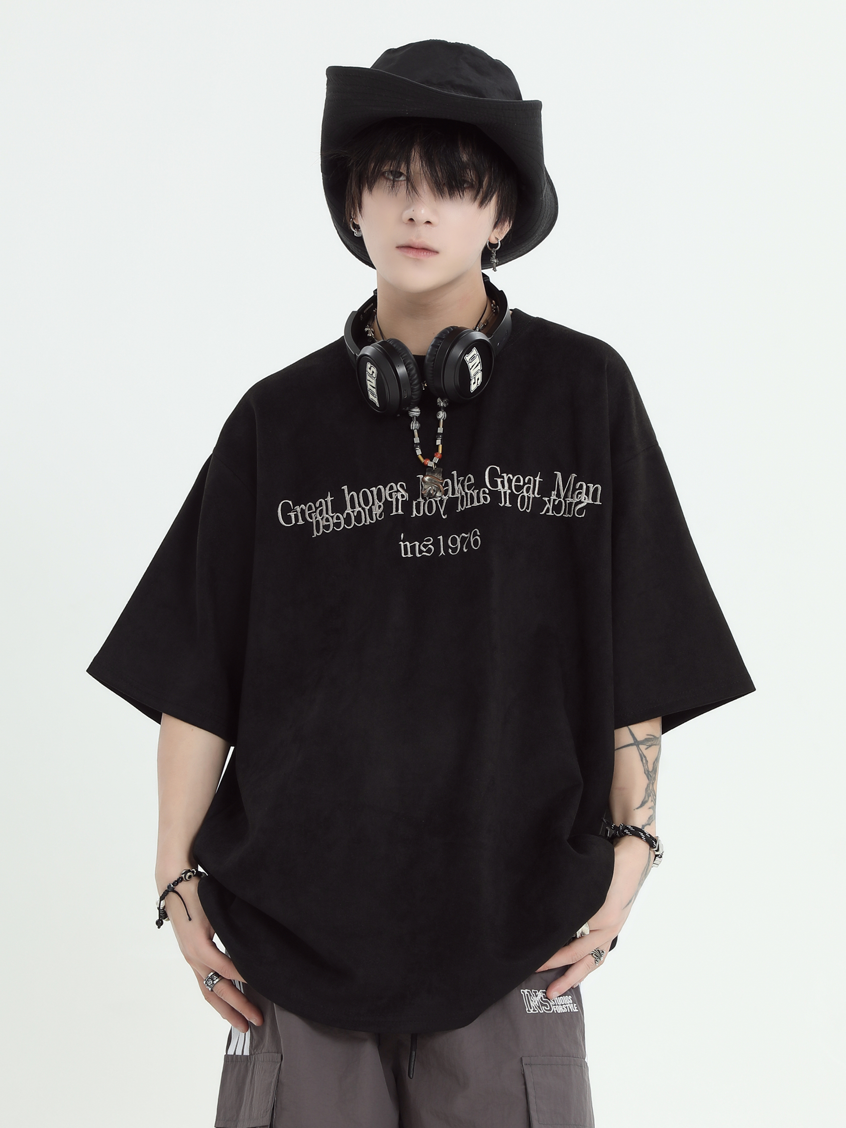 INSstudios 國潮牌情侶美式正反字母刺繡麂皮短袖寬鬆半袖T恤衫男