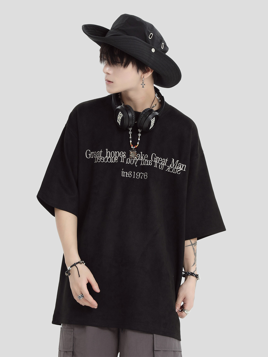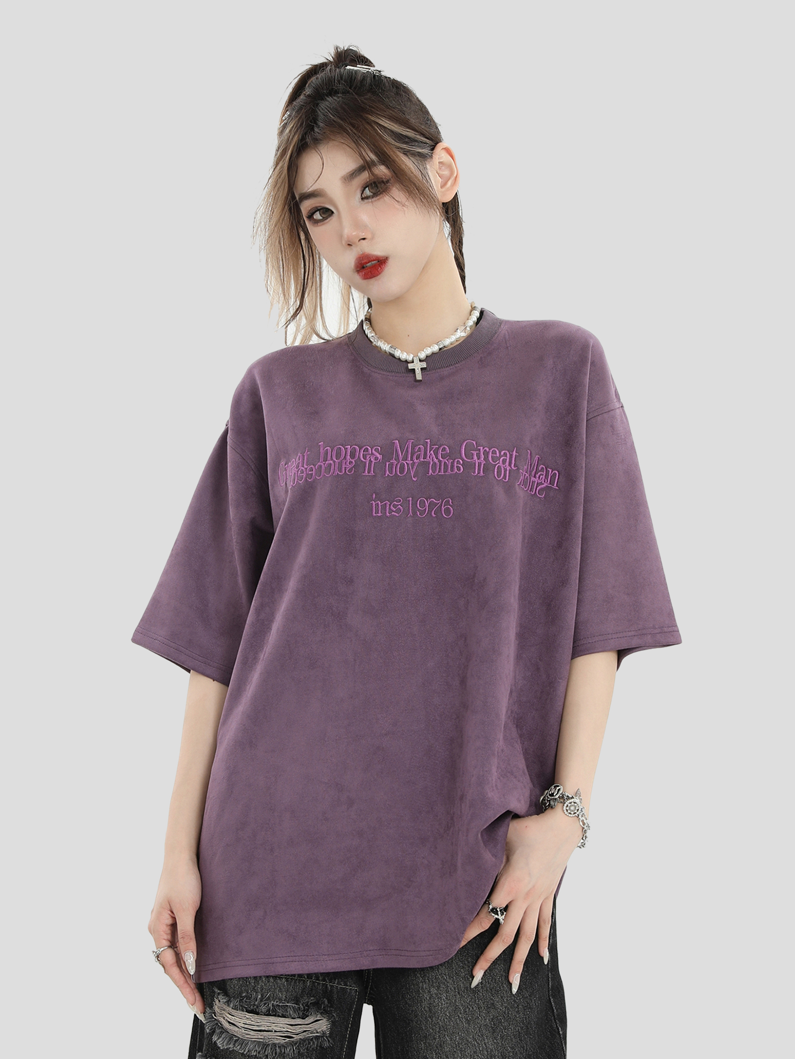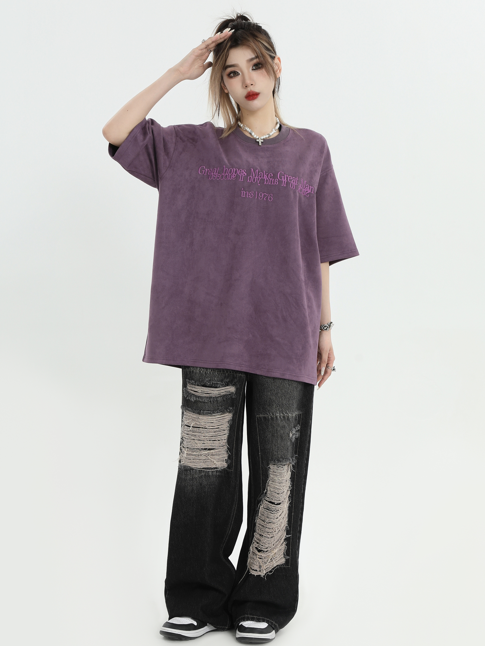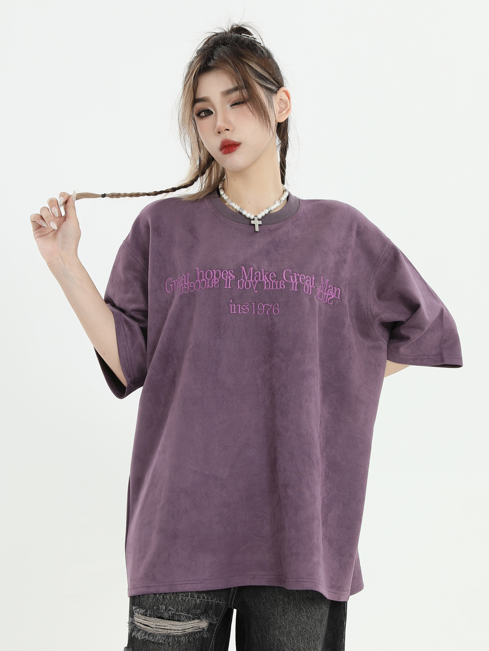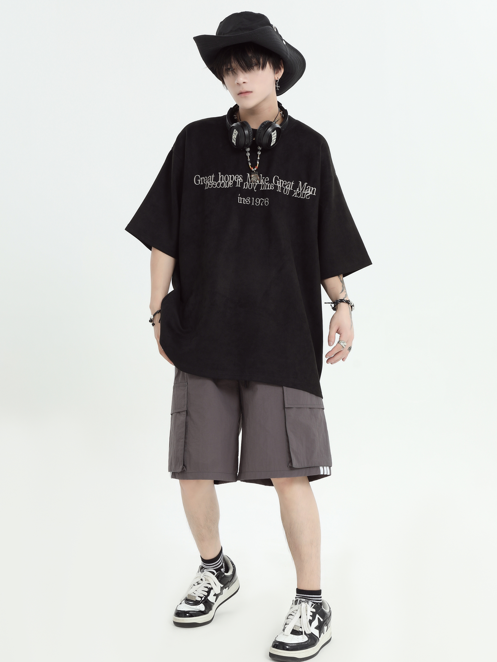 INSstudios 國潮牌情侶美式正反字母刺繡麂皮短袖寬鬆半袖T恤衫男