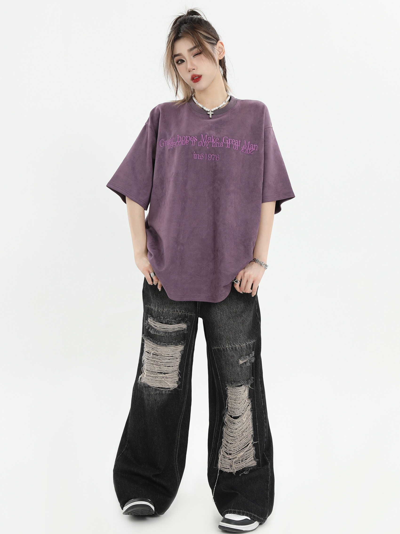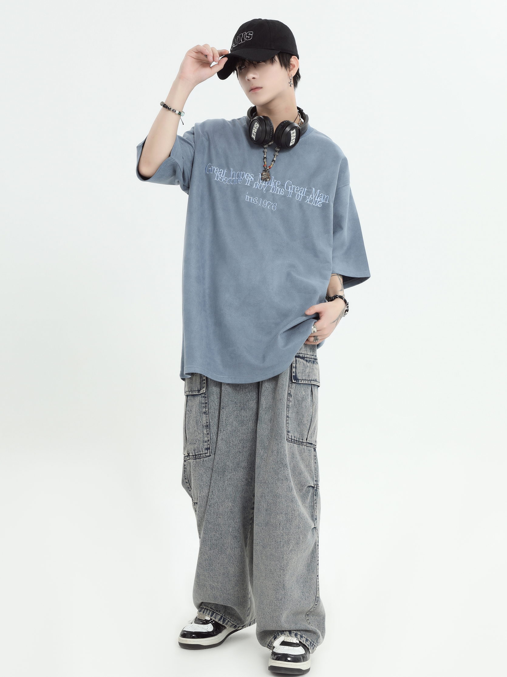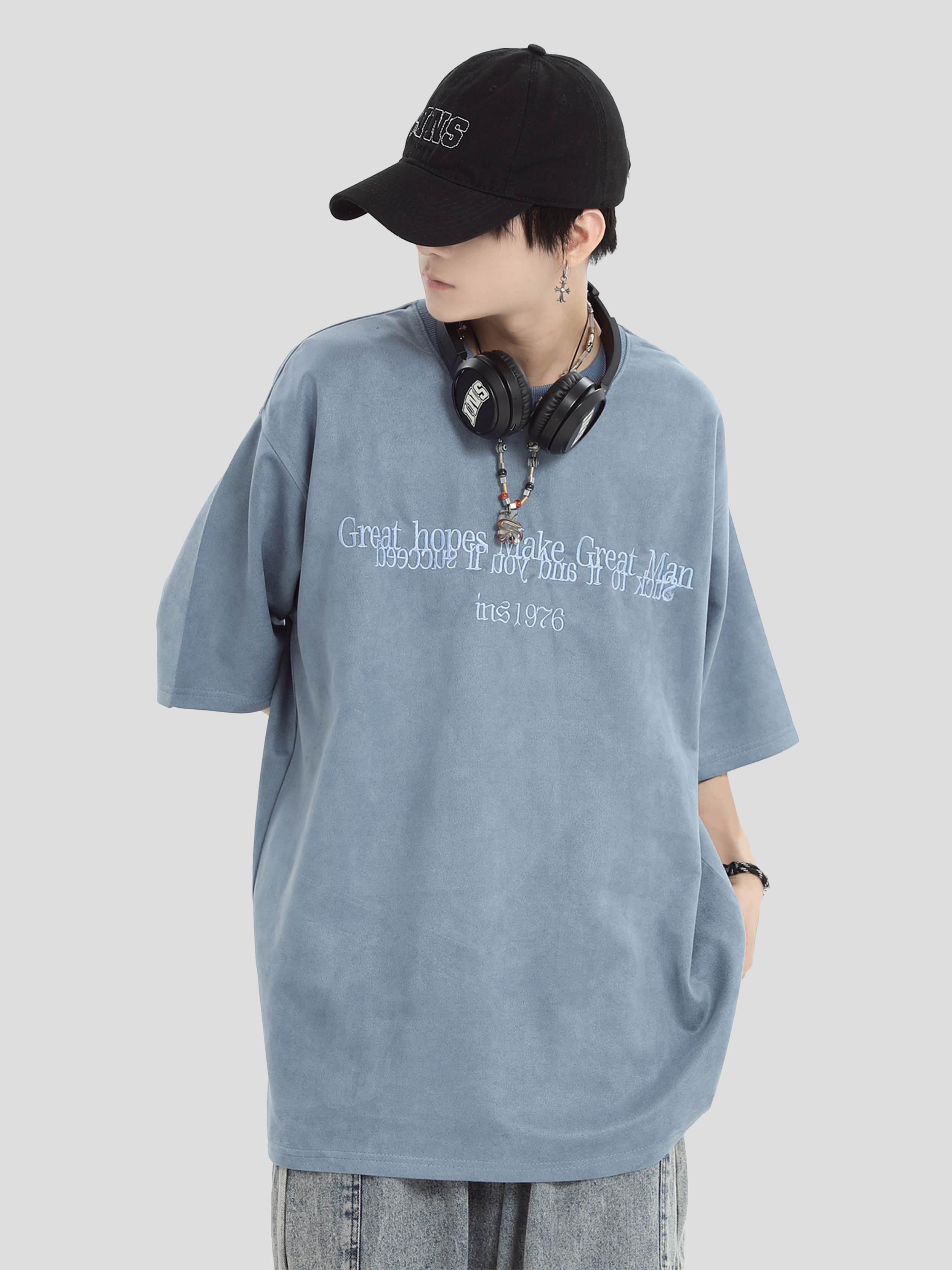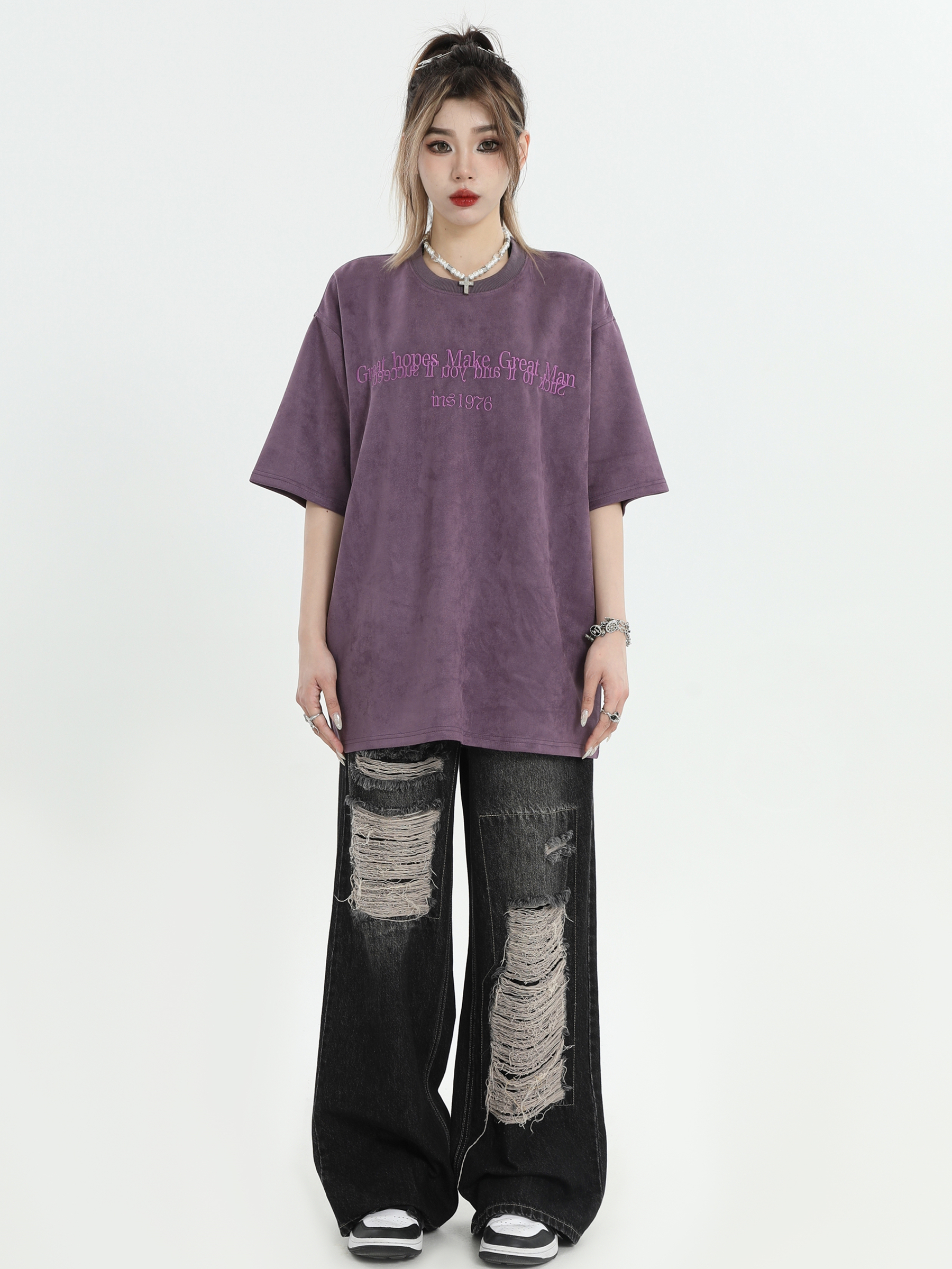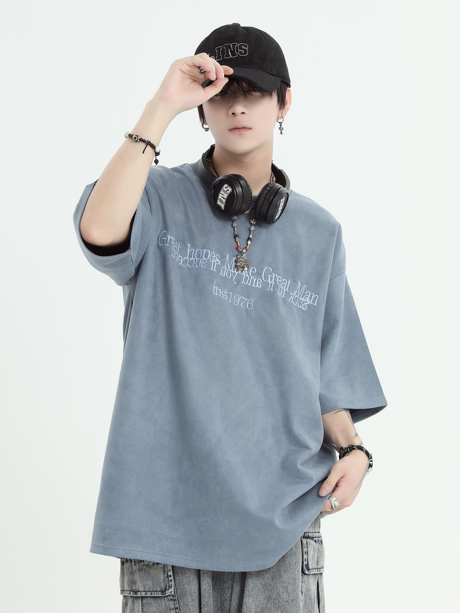 INSstudios 國潮牌情侶美式正反字母刺繡麂皮短袖寬鬆半袖T恤衫男