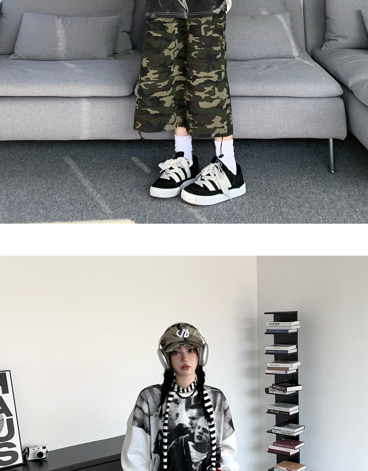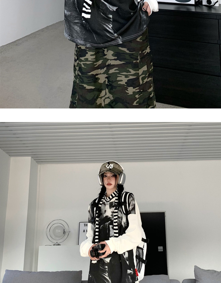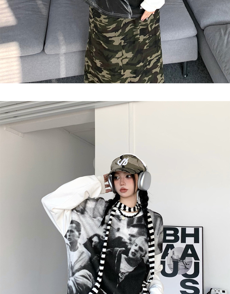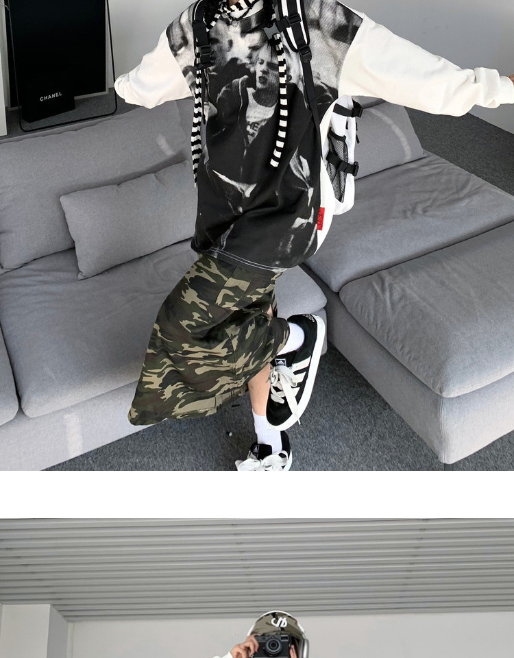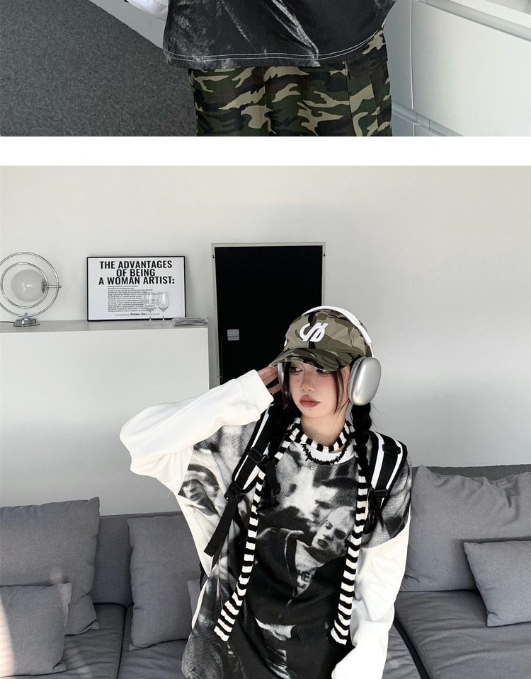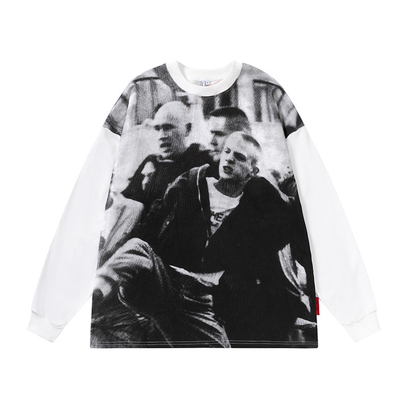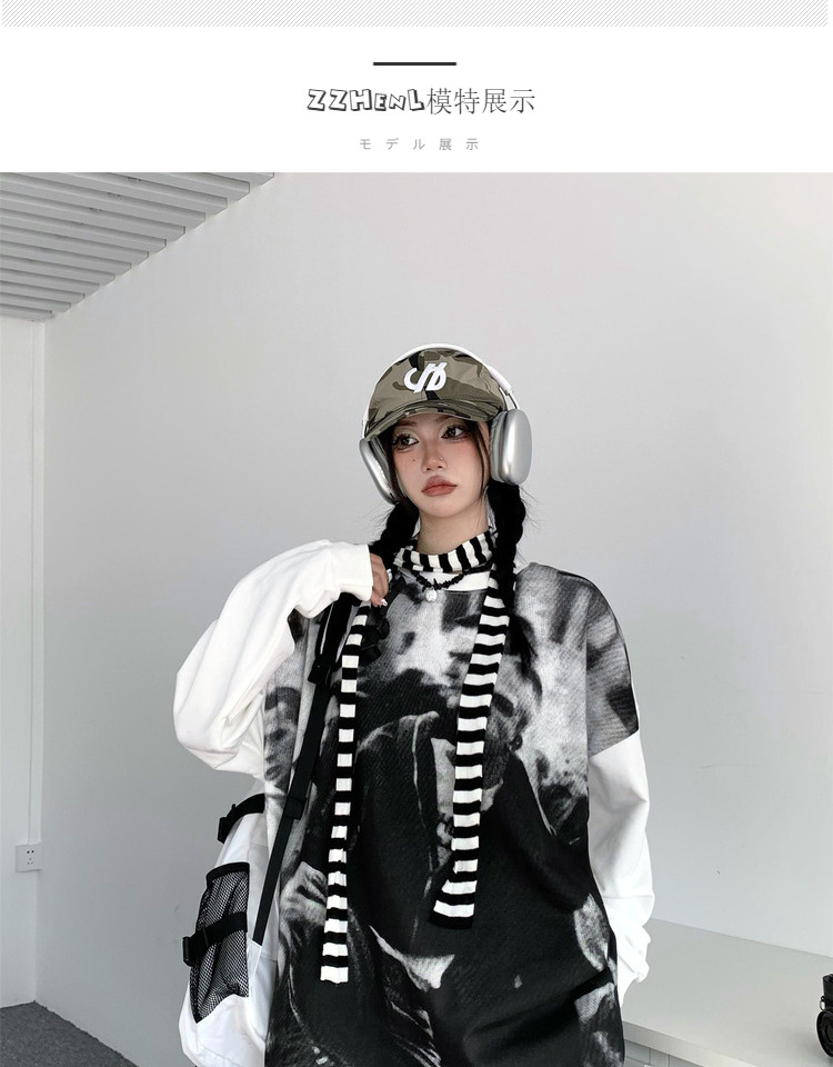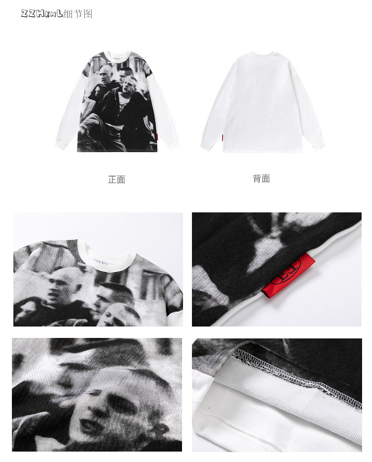 ZZHenL 潮牌黑白影印衛衣男拼色圓領寬鬆百搭休閒拼接打底衫情侶