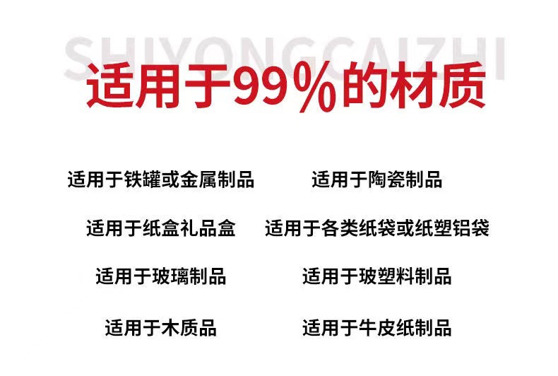 适用范围 玻璃杯 纸盒 马口铁盒 皮革 木制品 塑料表面等