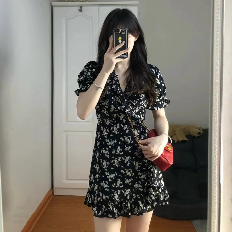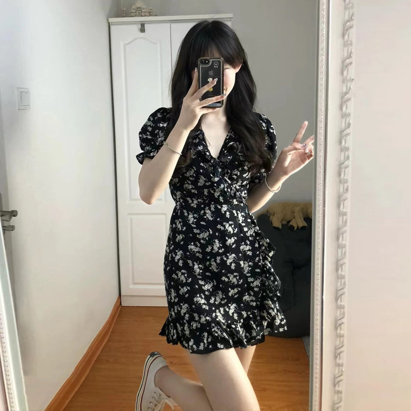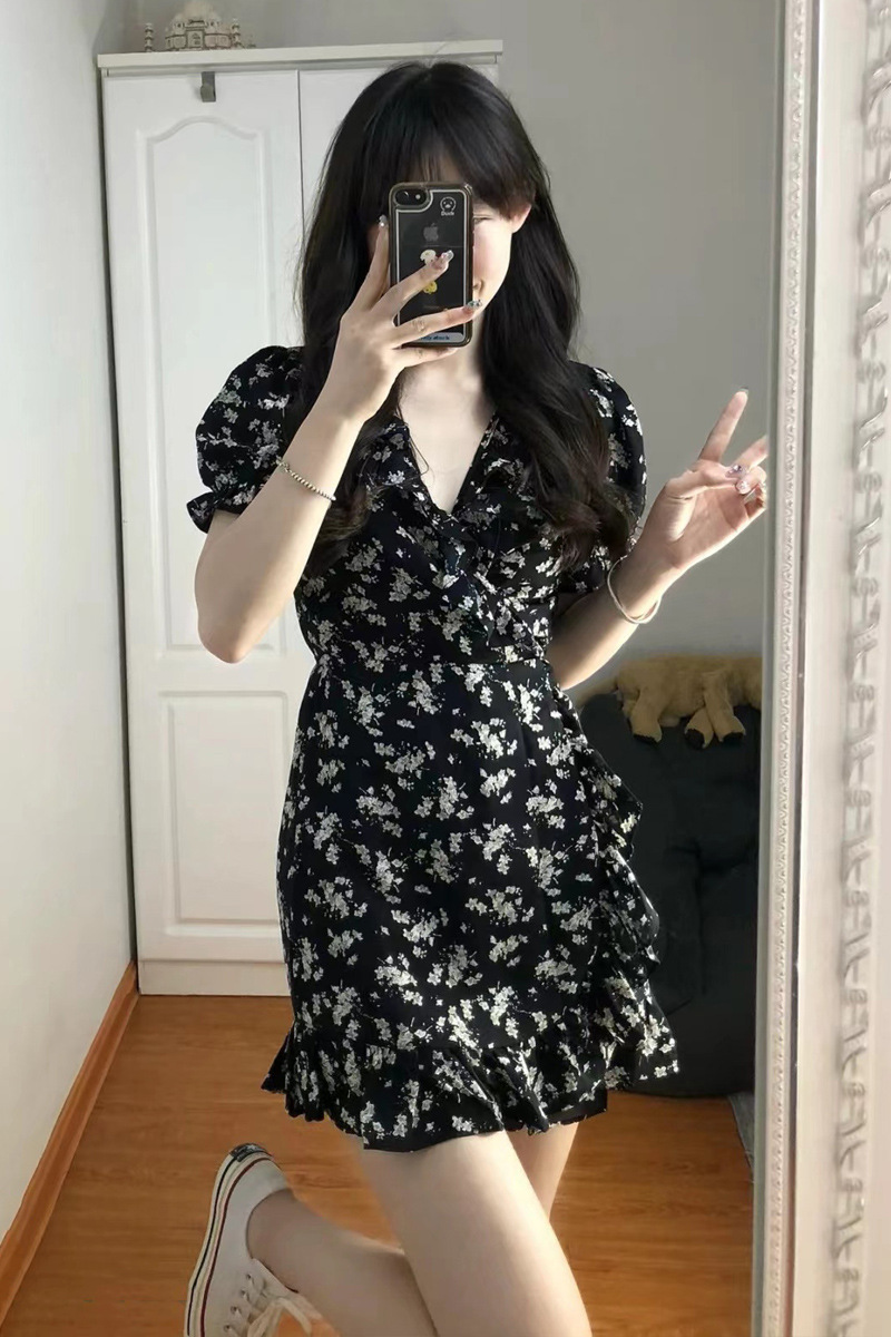 【美伊朵黑色碎花连衣裙女夏季V领收腰显瘦小个子一片式裹身短裙