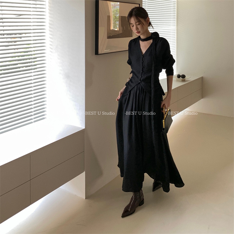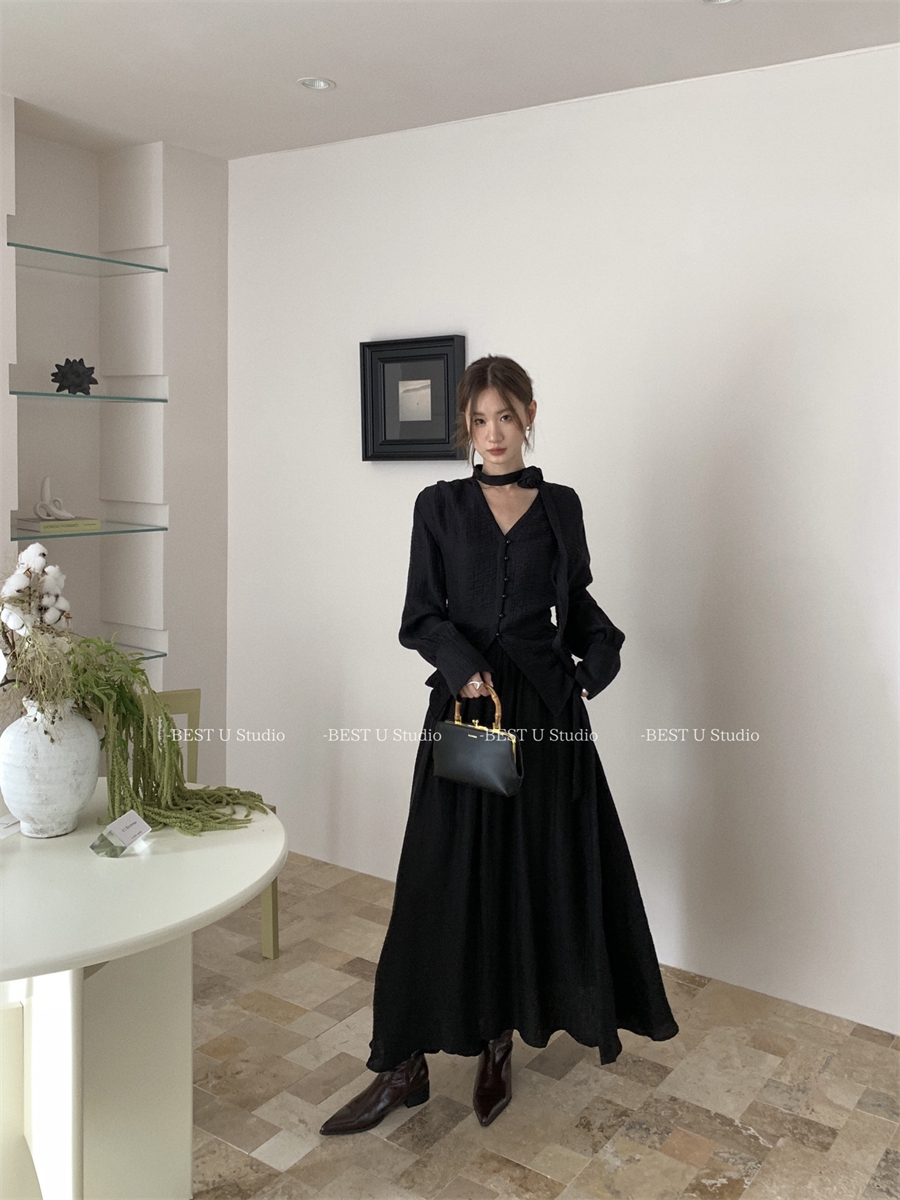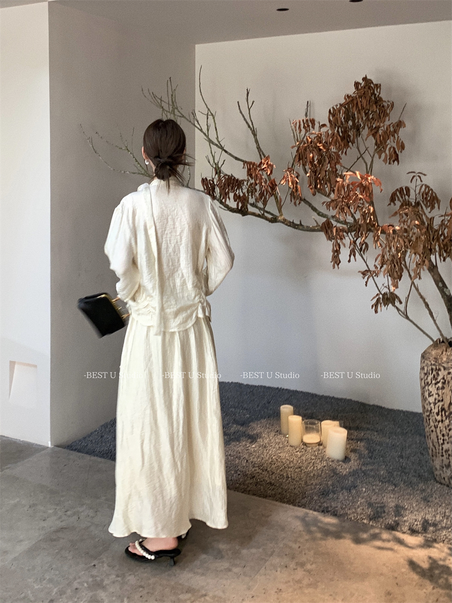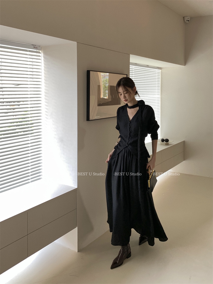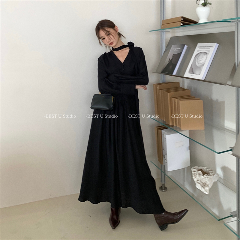 Best U新中式禪意純色褶皺半身裙女秋冬新款百搭顯瘦百褶長版裙子