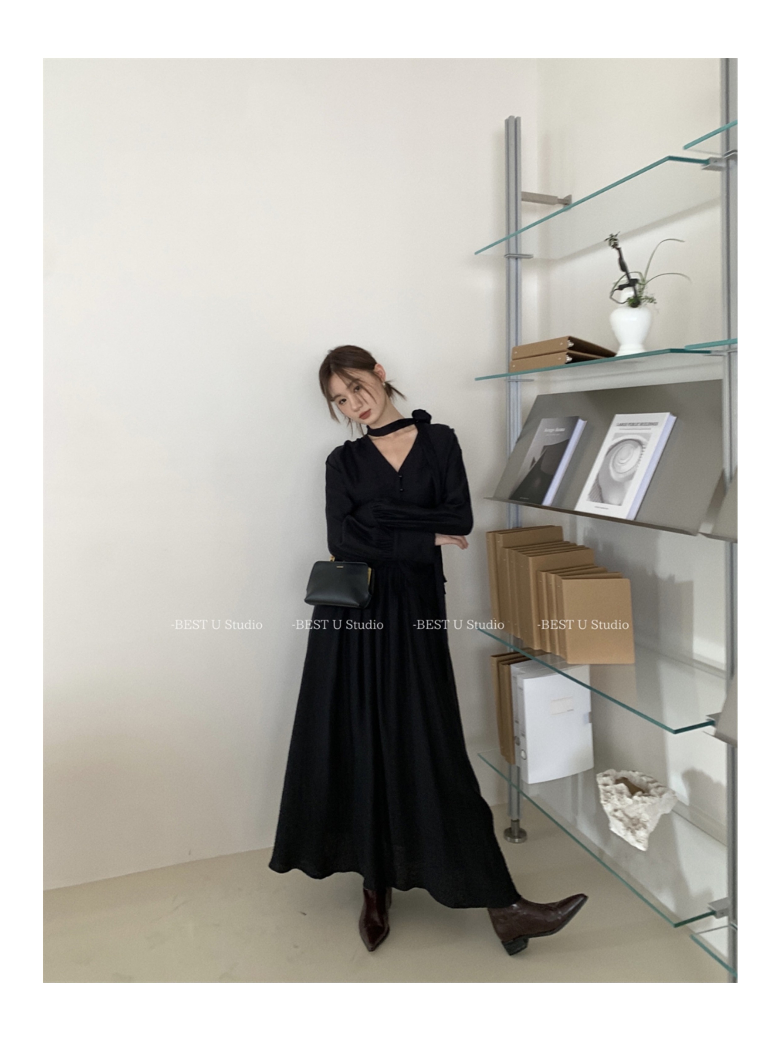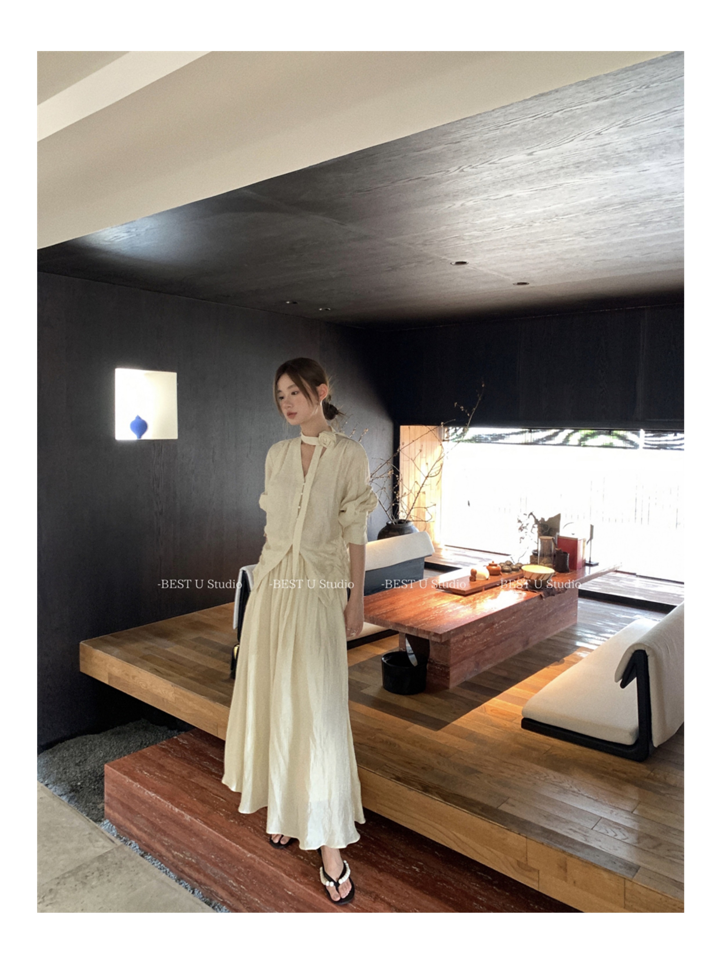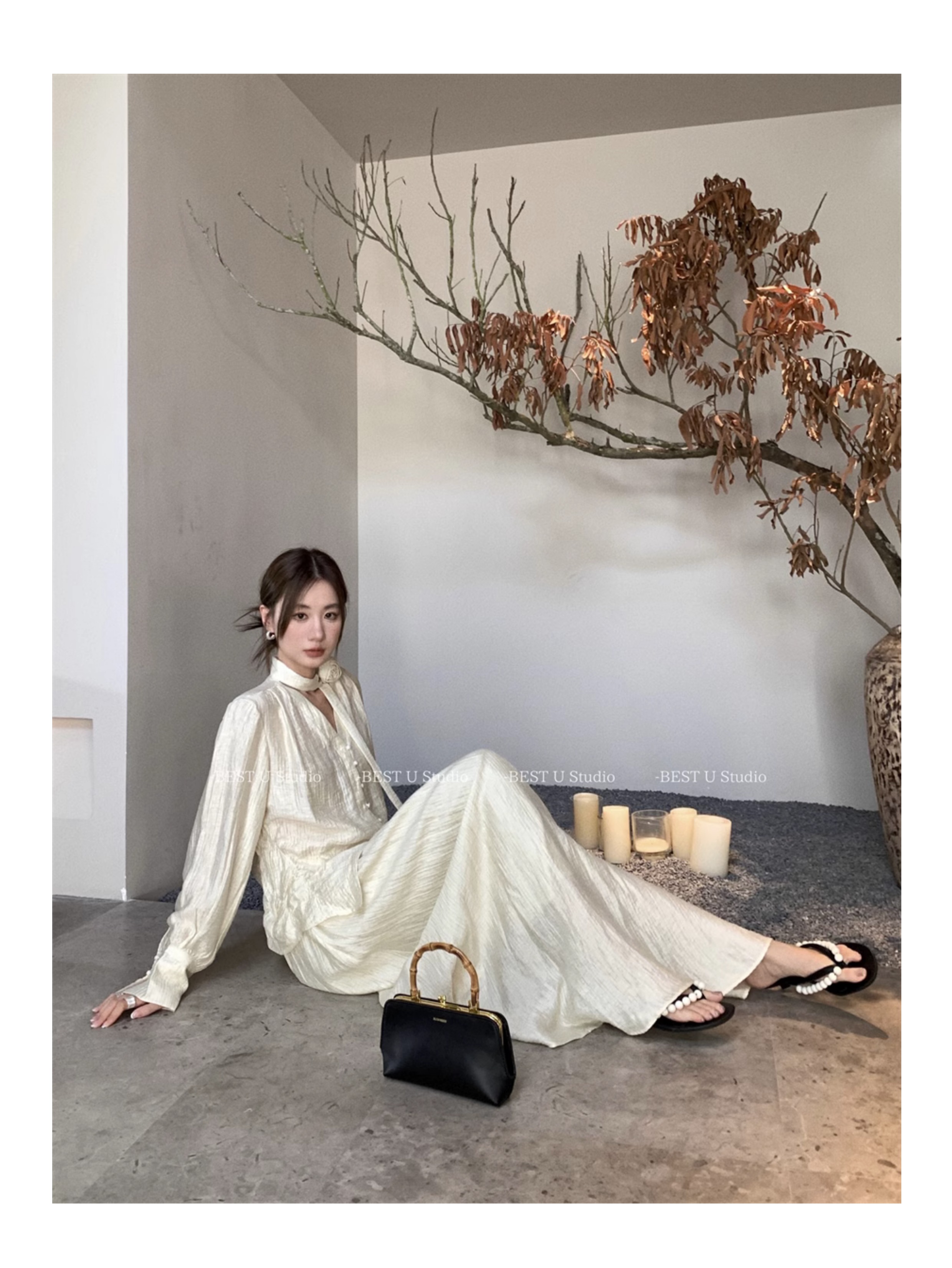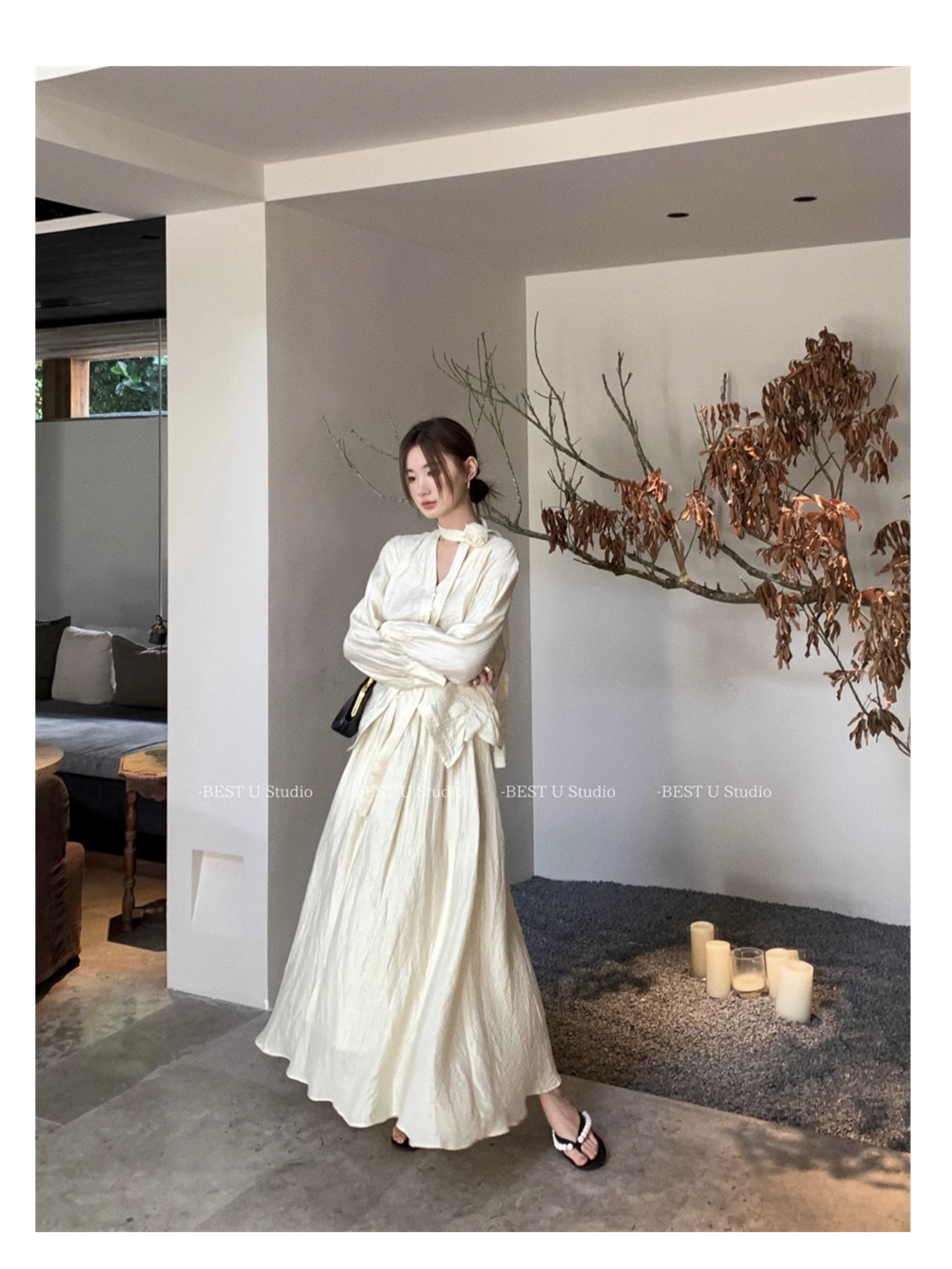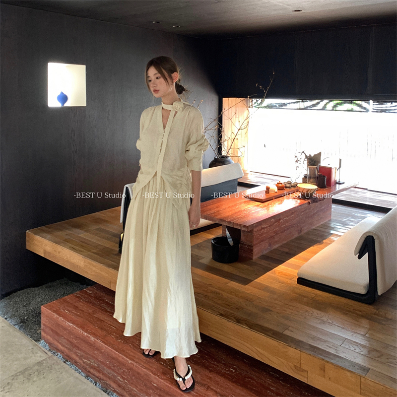 Best U新中式禪意純色褶皺半身裙女秋冬新款百搭顯瘦百褶長版裙子