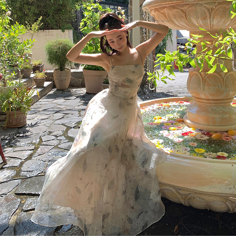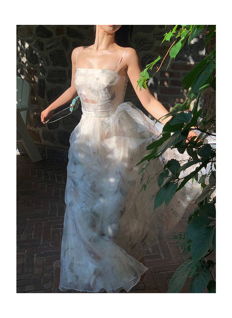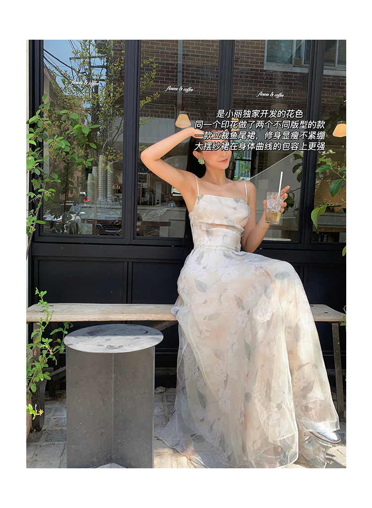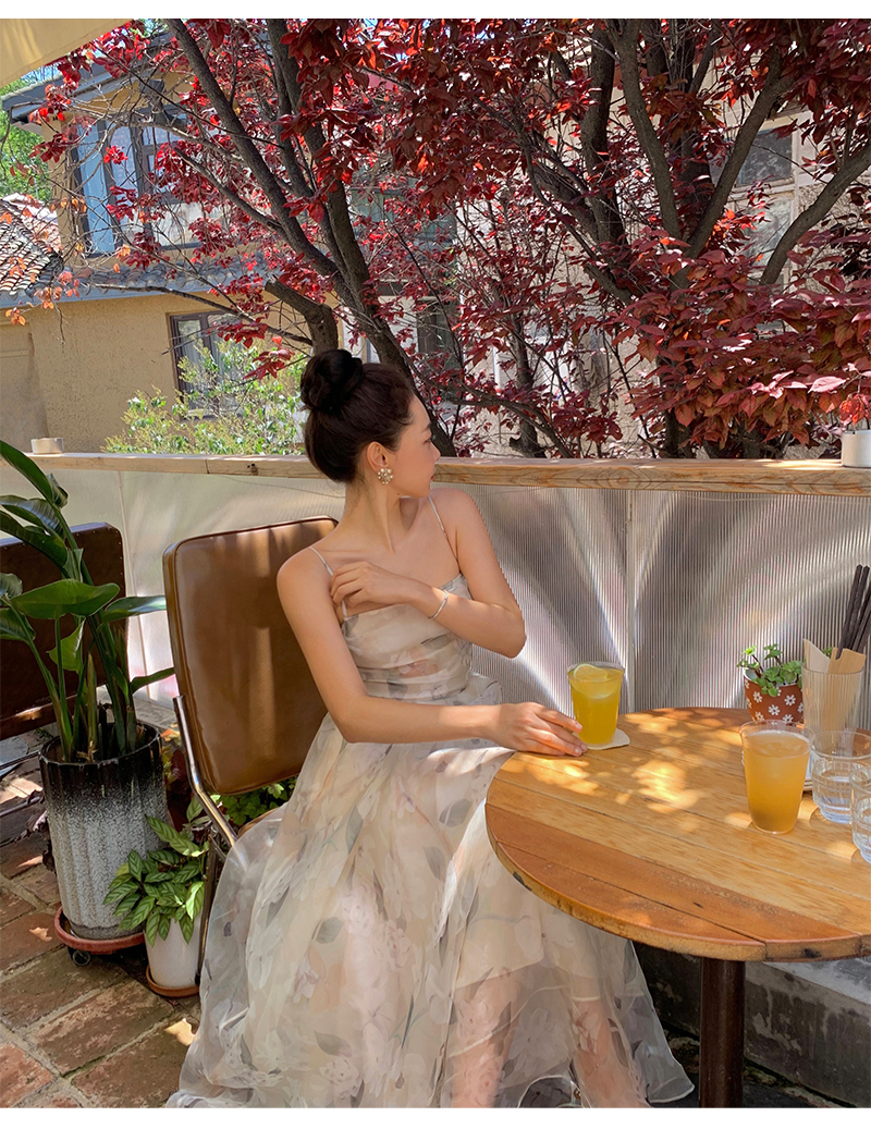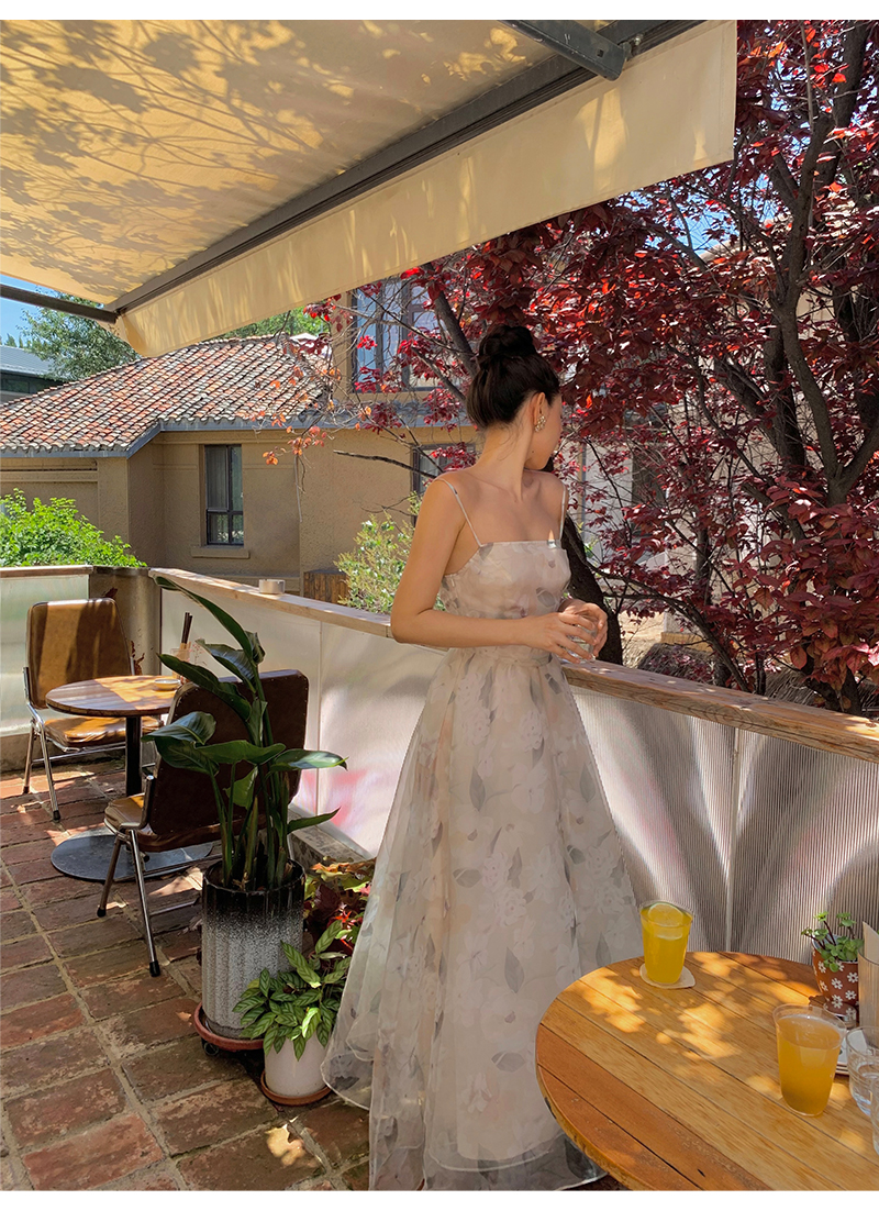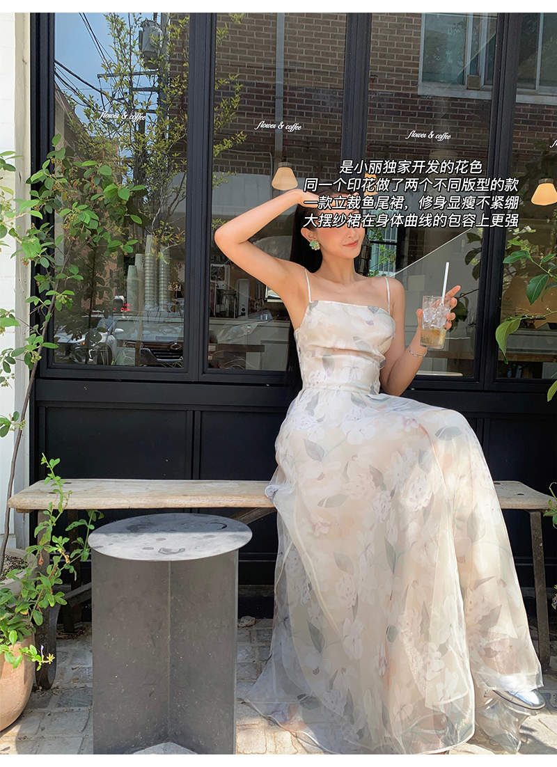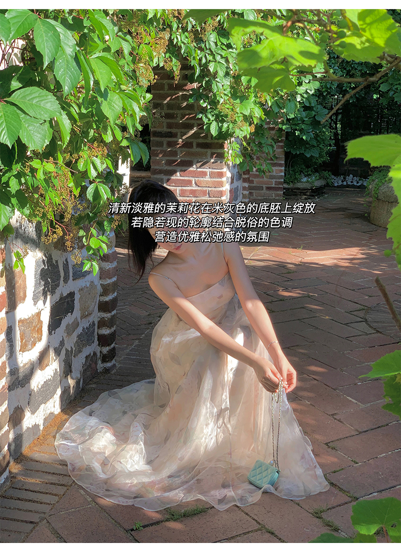 小麗XIAOLI月織霧紗a字吊帶碎花洋裝長裙夏季2023新款超仙公主裙