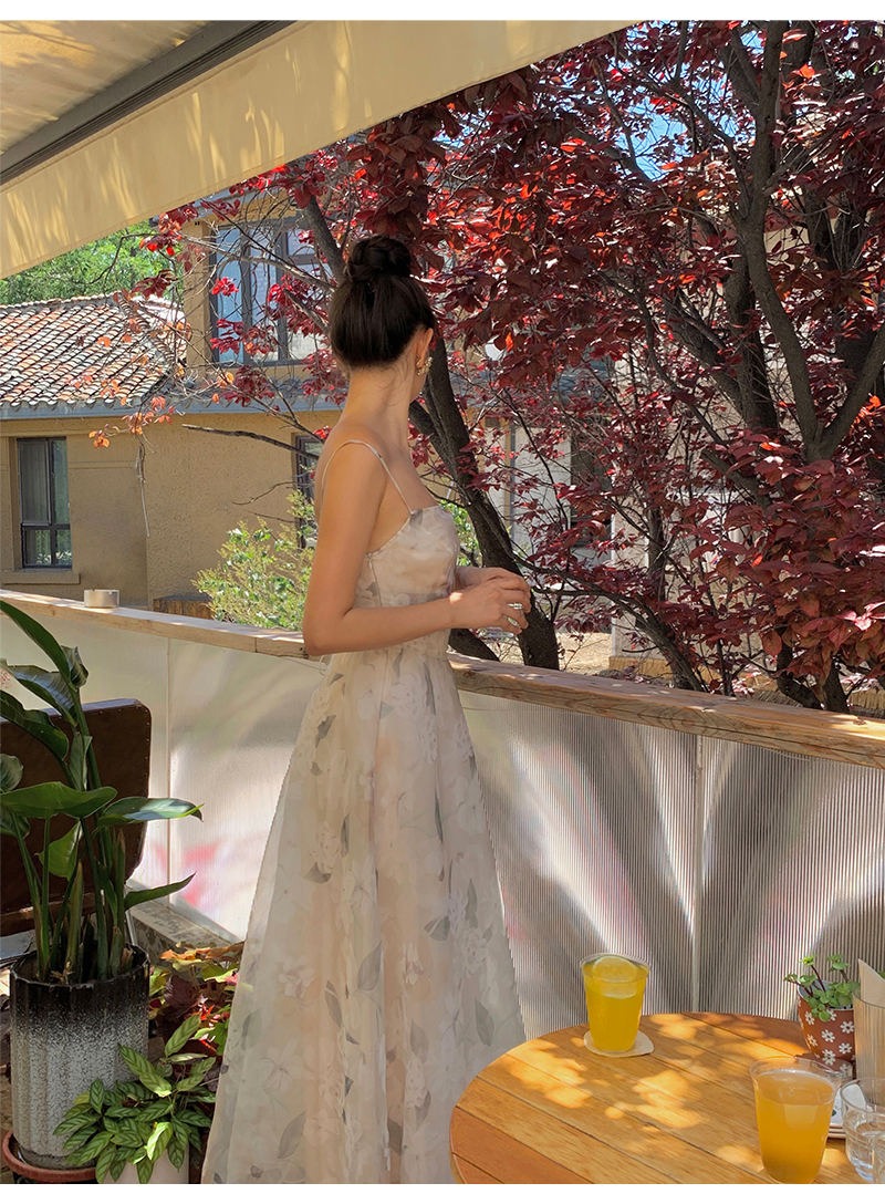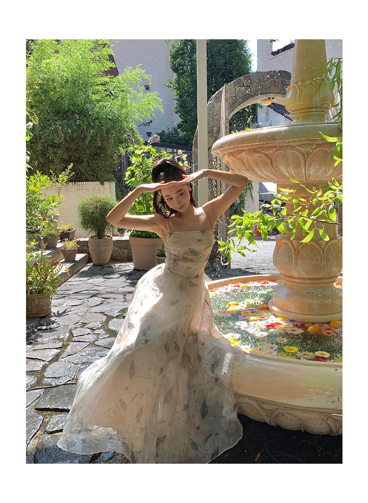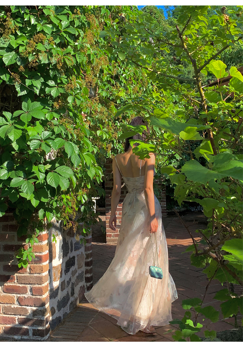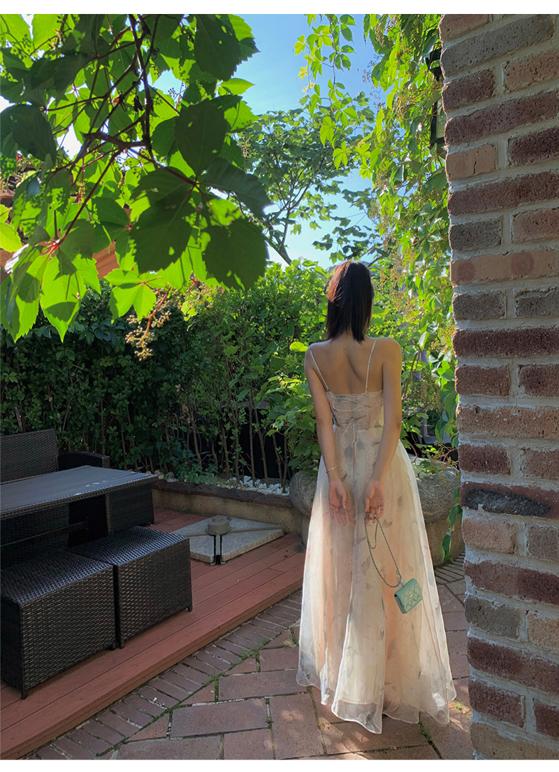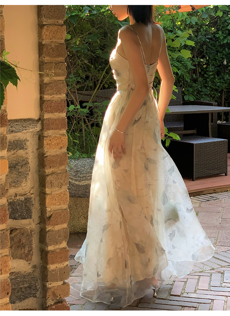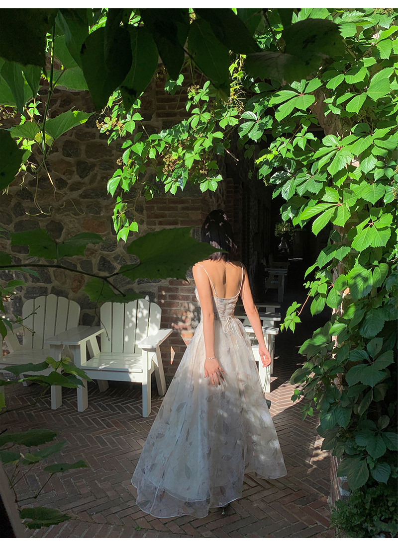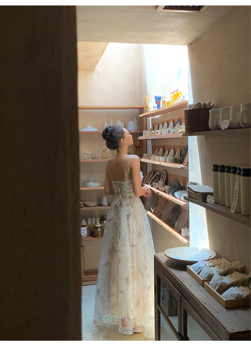 小麗XIAOLI月織霧紗a字吊帶碎花洋裝長裙夏季2023新款超仙公主裙