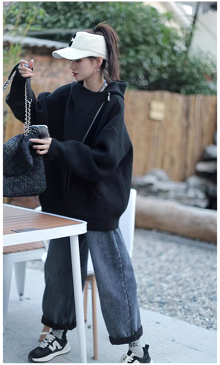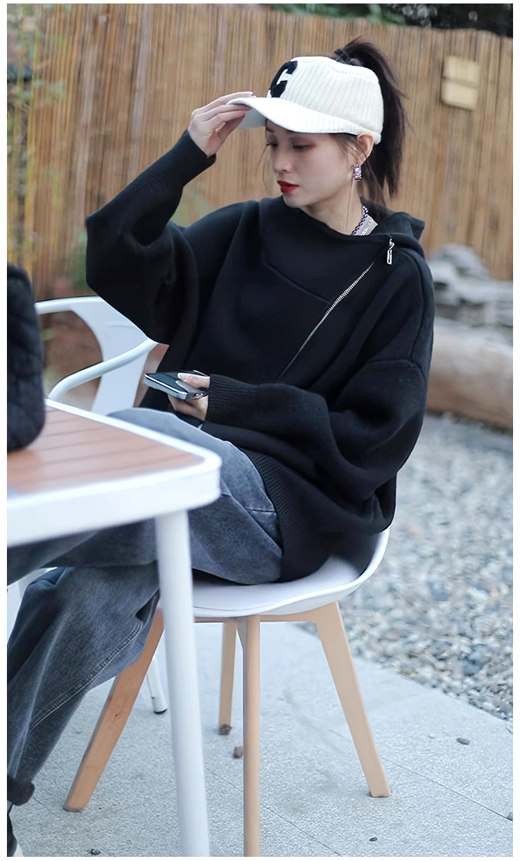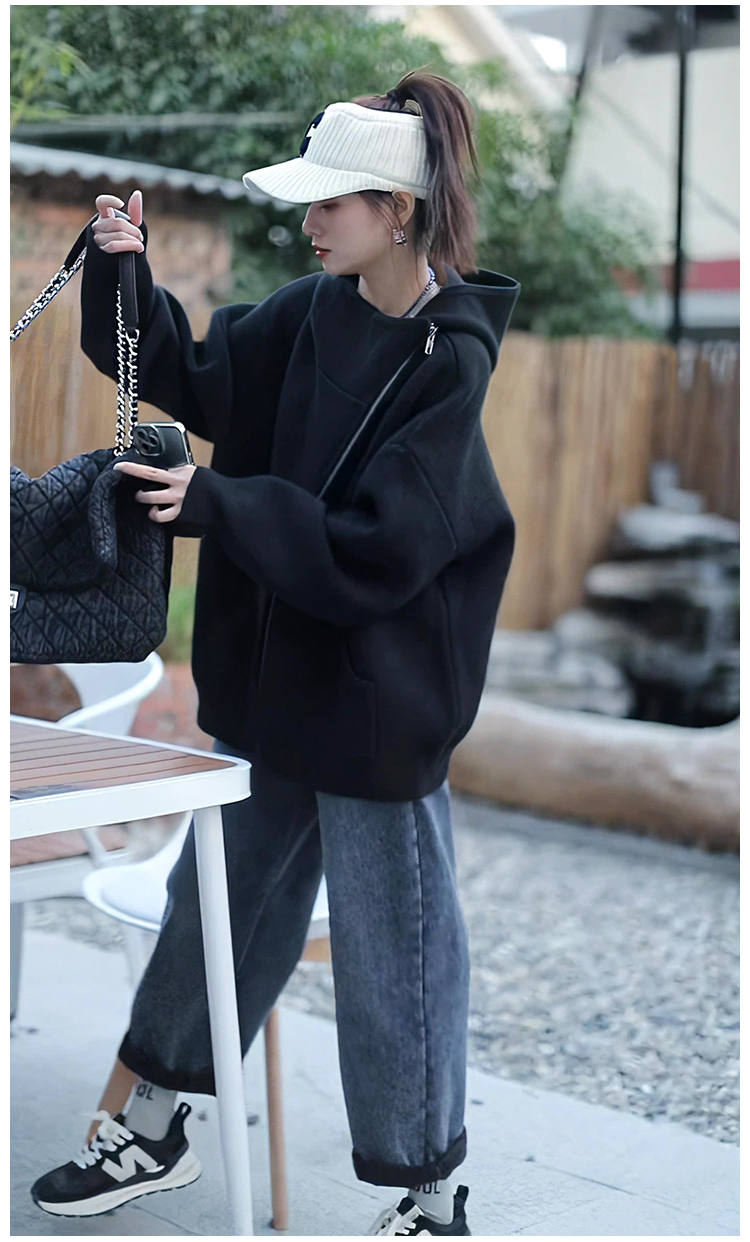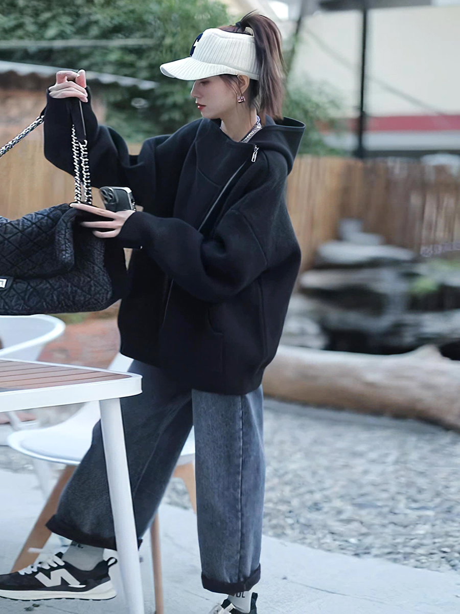 黑色厚棉T女2023秋季新款設計感小眾連帽寬鬆顯瘦休閒百搭開衫外套