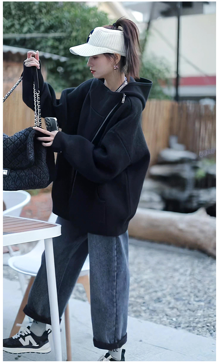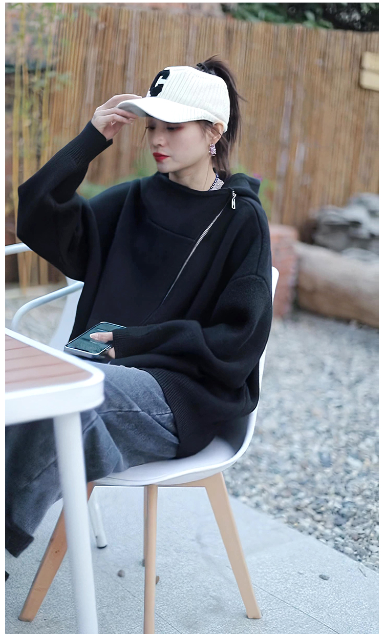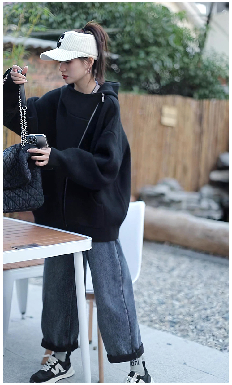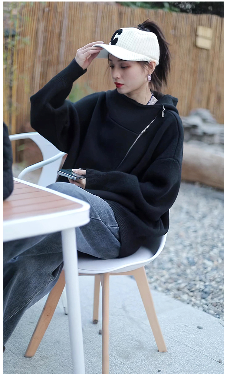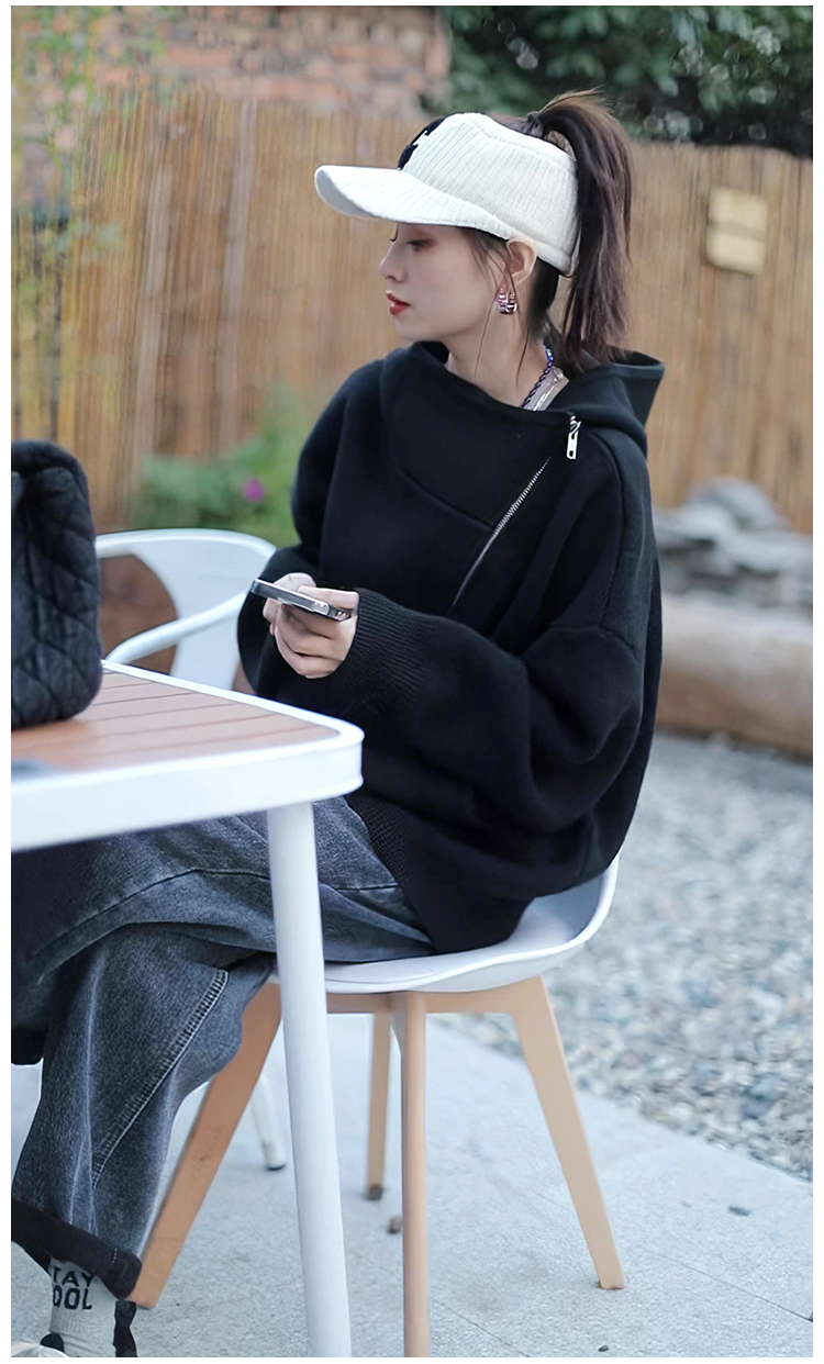 黑色厚棉T女2023秋季新款設計感小眾連帽寬鬆顯瘦休閒百搭開衫外套