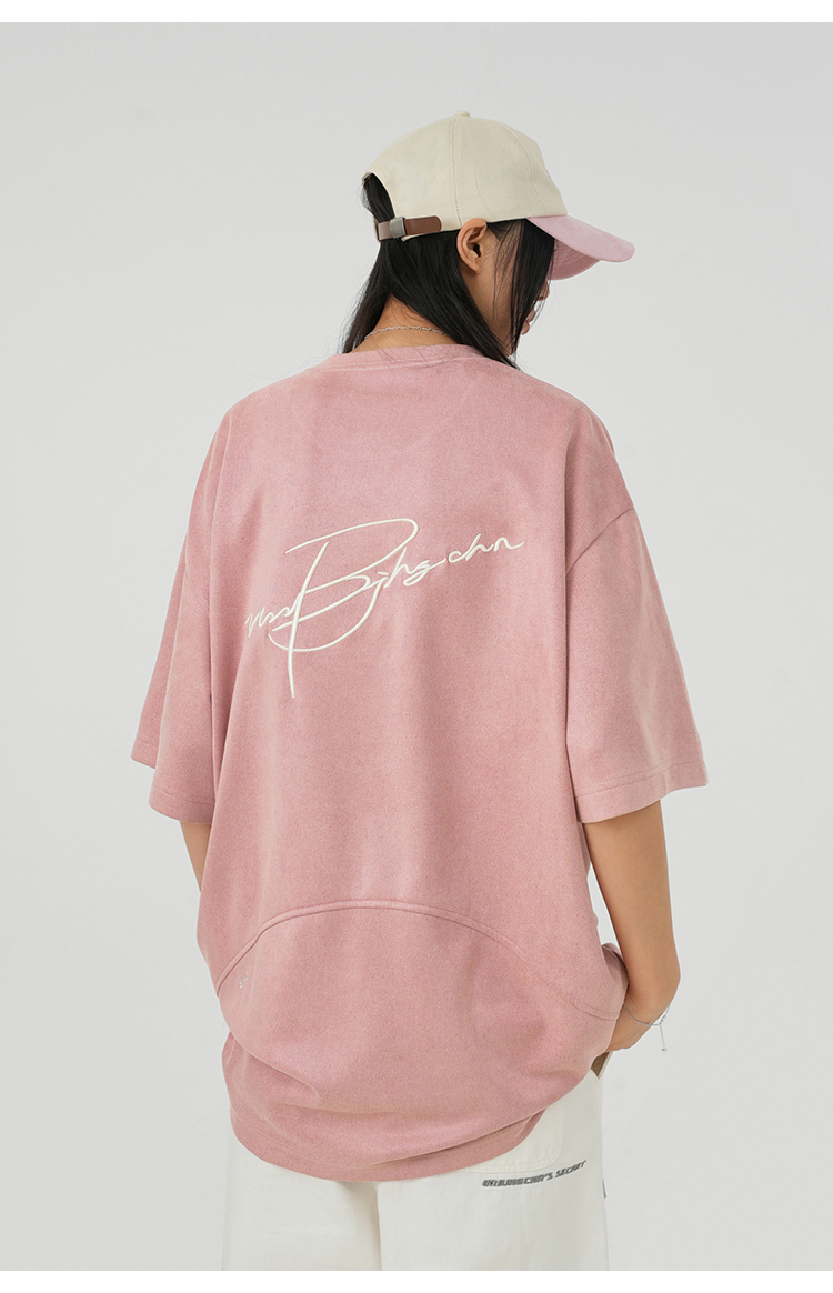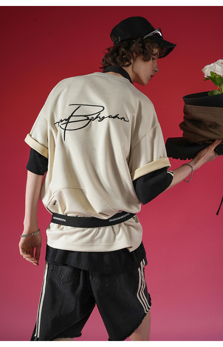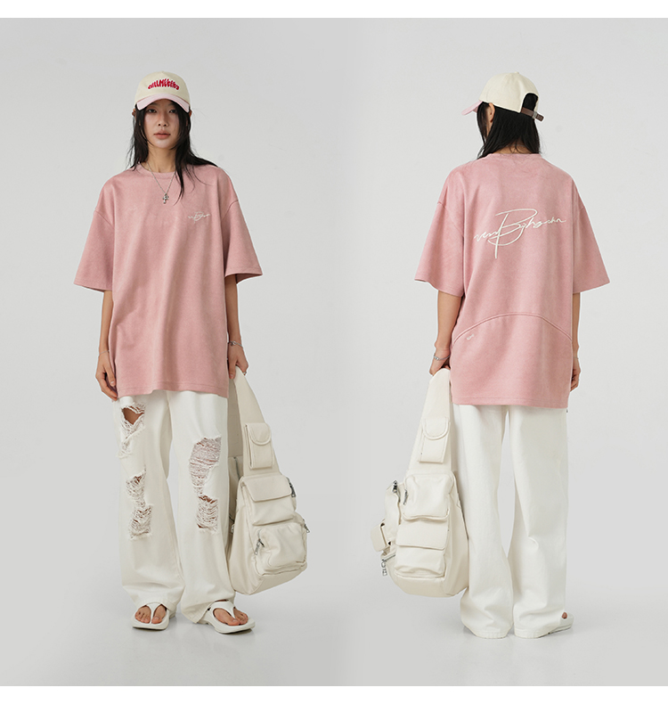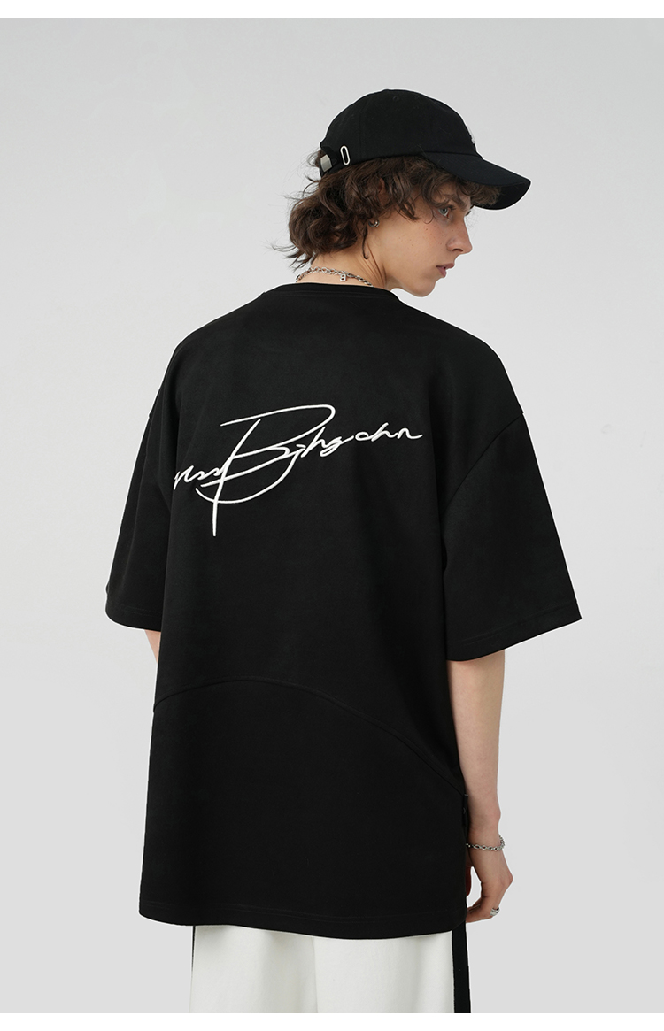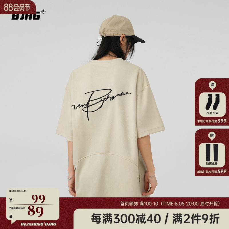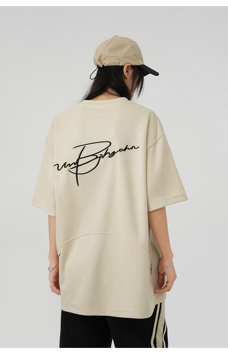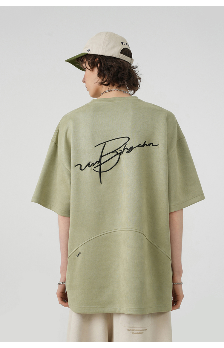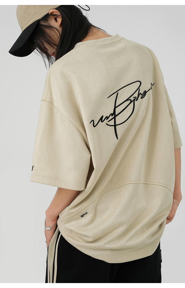BJHG不計後果 夏季美式重磅刺繡麂皮絨短袖男生潮牌解構寬鬆T恤女