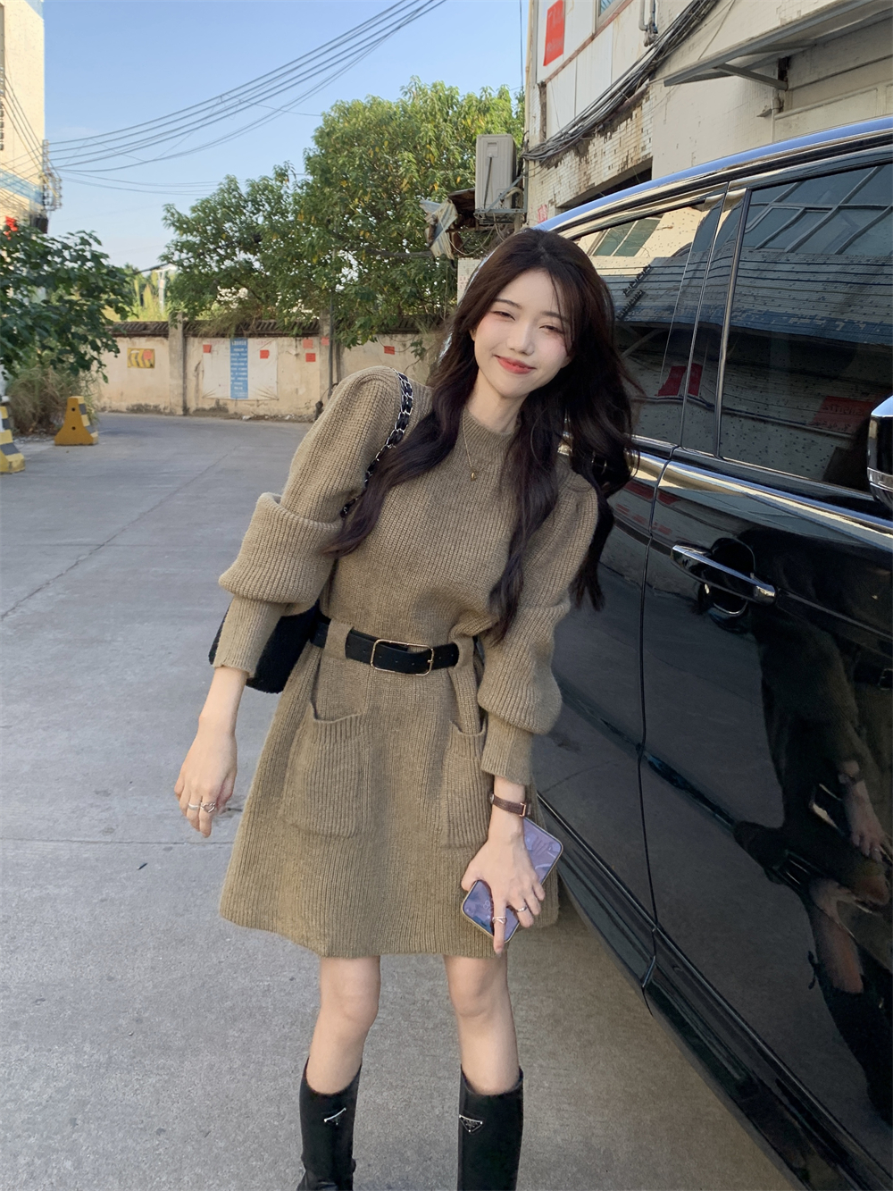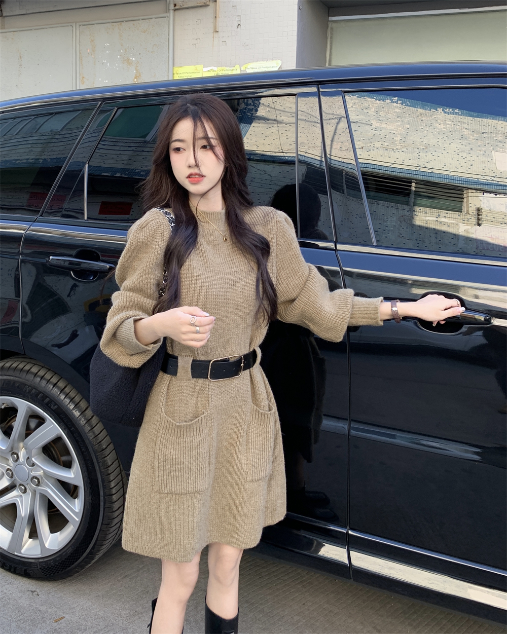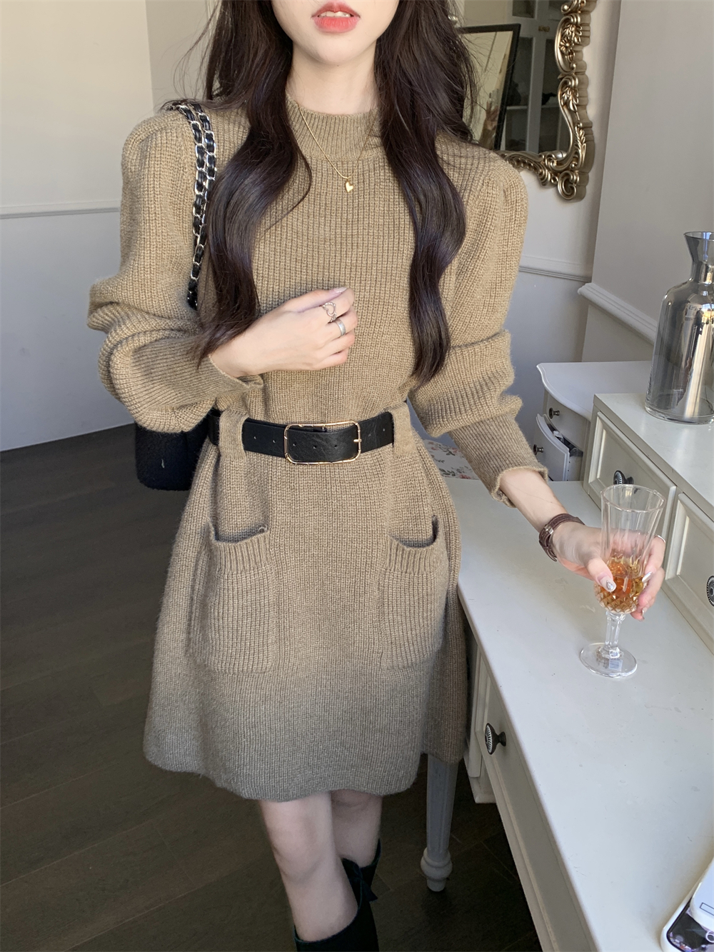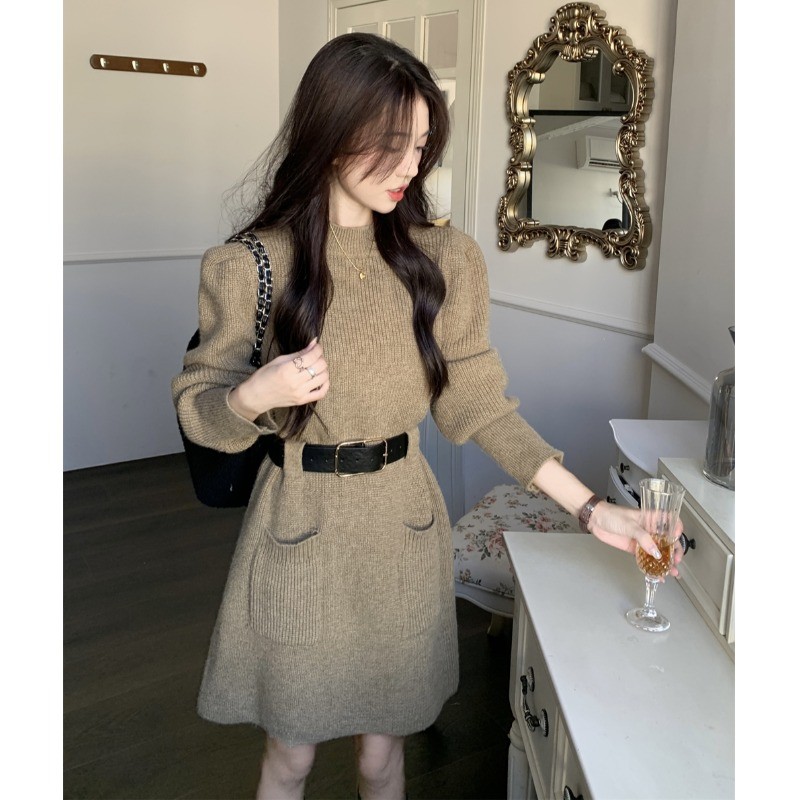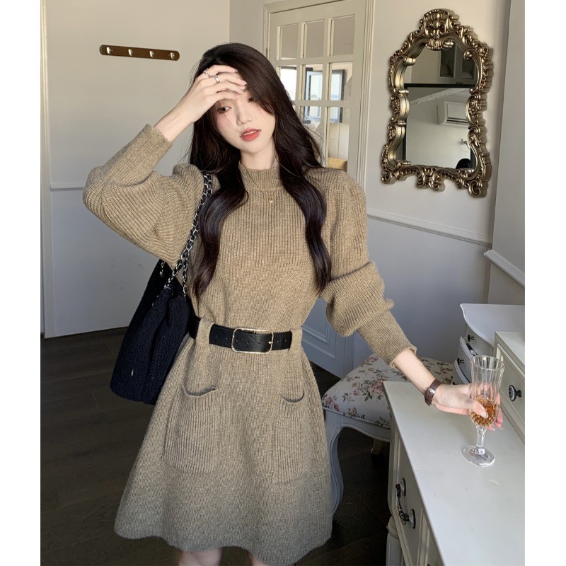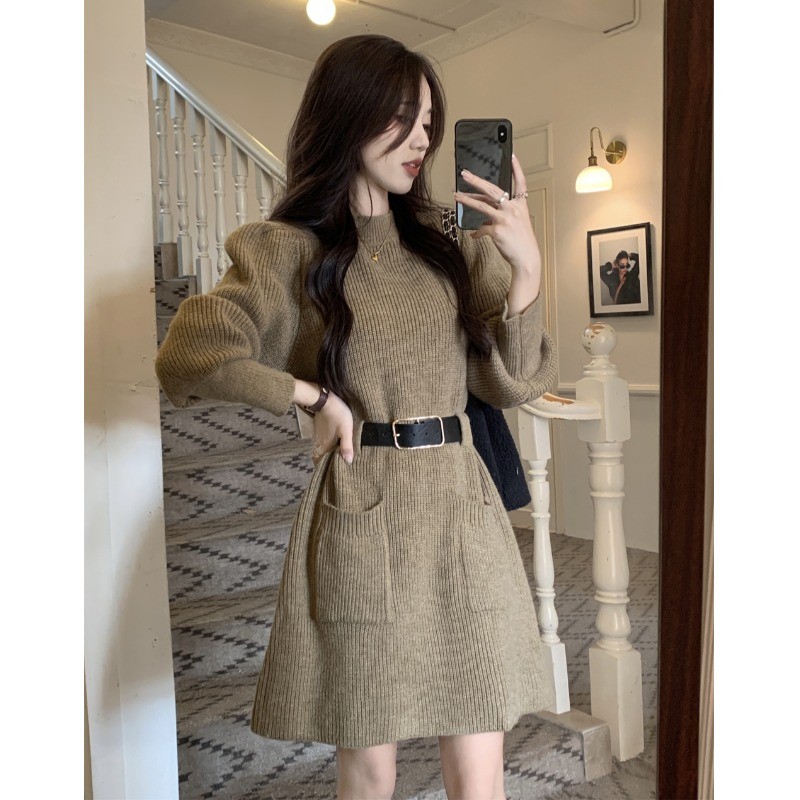 小個子收腰泡泡袖針織毛線洋裝女秋冬配長靴大衣內搭打底可外穿