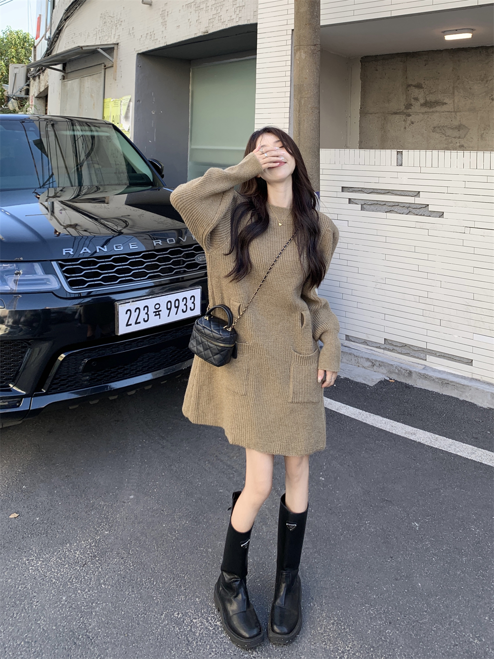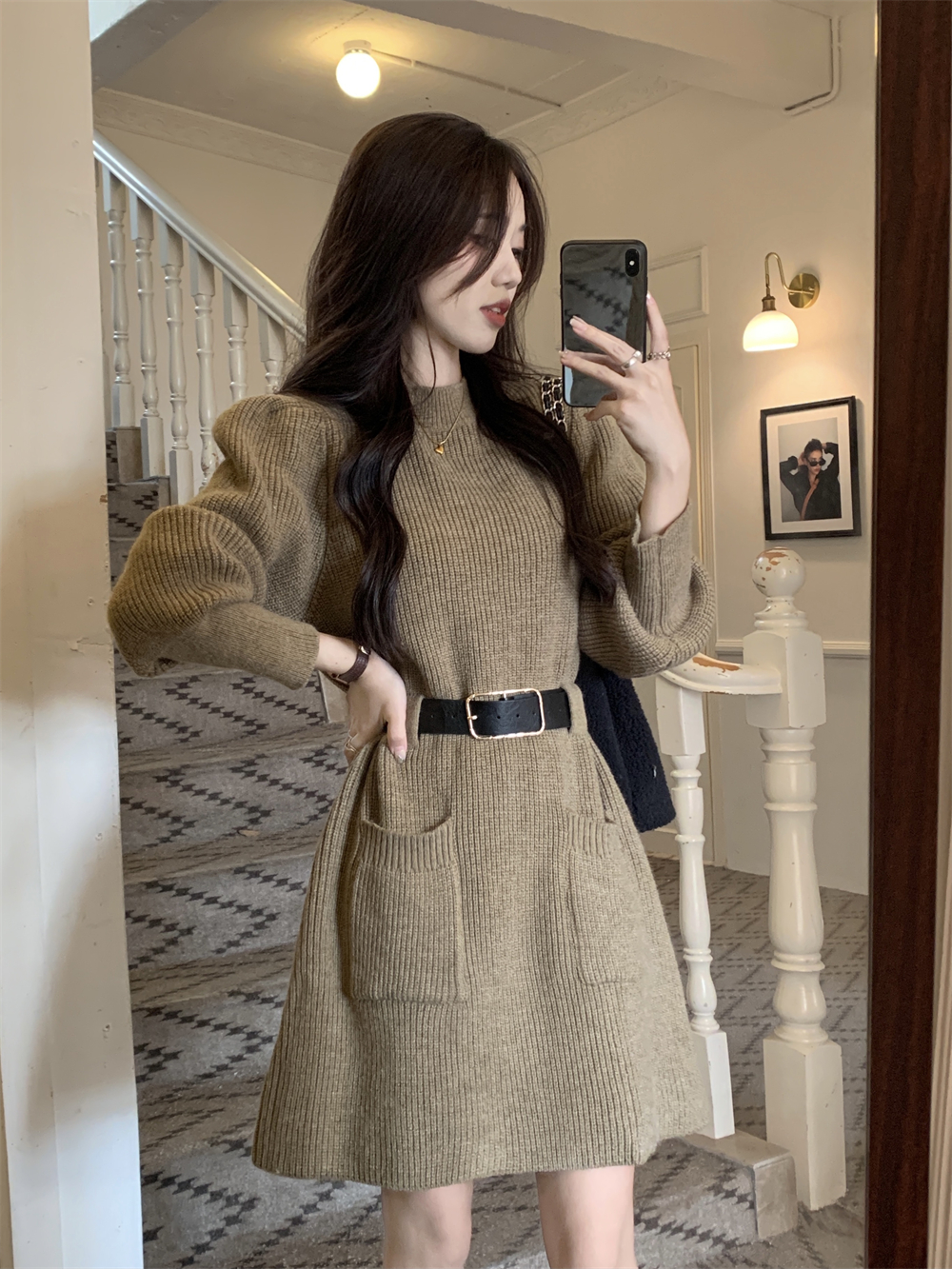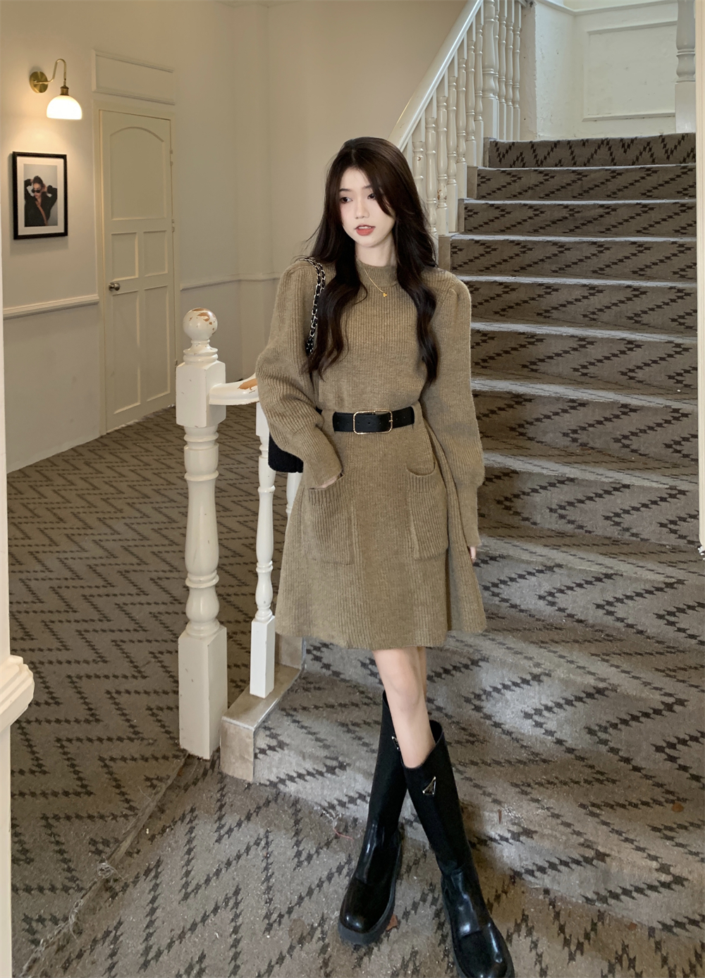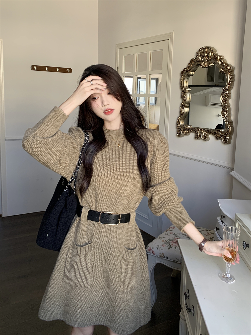 小個子收腰泡泡袖針織毛線洋裝女秋冬配長靴大衣內搭打底可外穿
