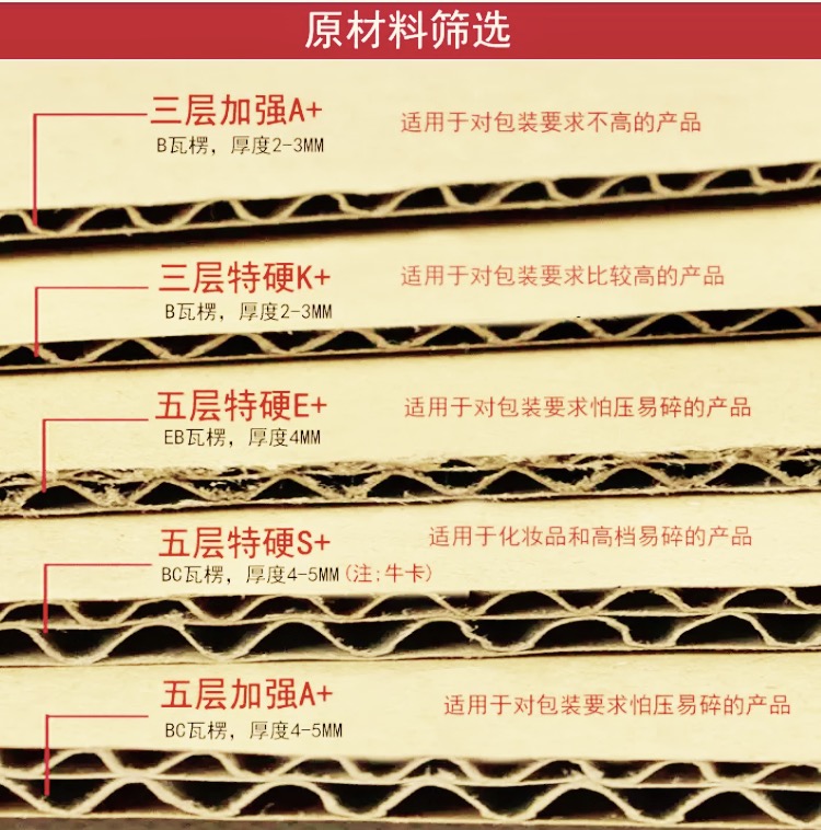 材质硬度等级 飞机盒(A级加硬),飞机盒(K级特硬),三层纸箱(K级特硬),五层纸箱 (K级特硬),三层半高纸箱(A级),三层纸箱半高(K级),三层纸箱(S级加硬)