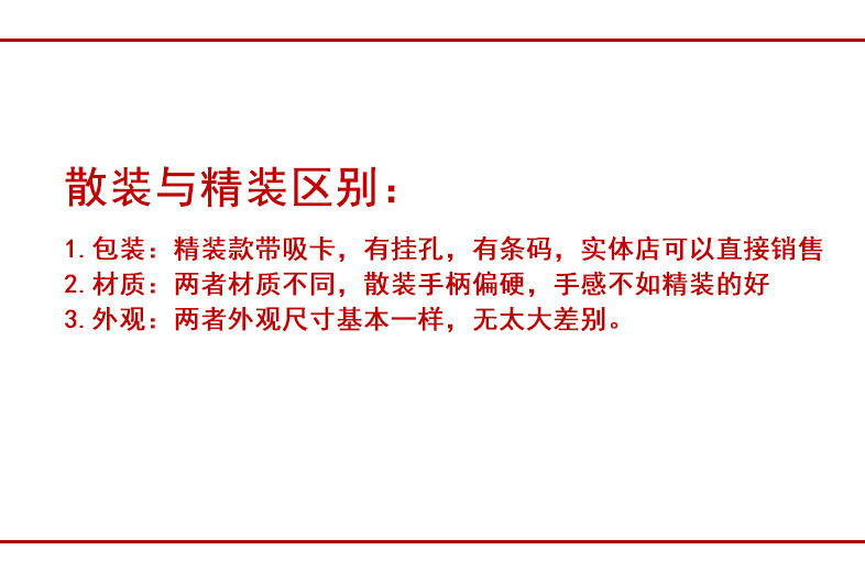 们注意了 因散装规格无包装 手柄处会有划痕剐蹭不做质量问题处理哦 介意的话请选择精装带包装款 无划痕剐蹭的