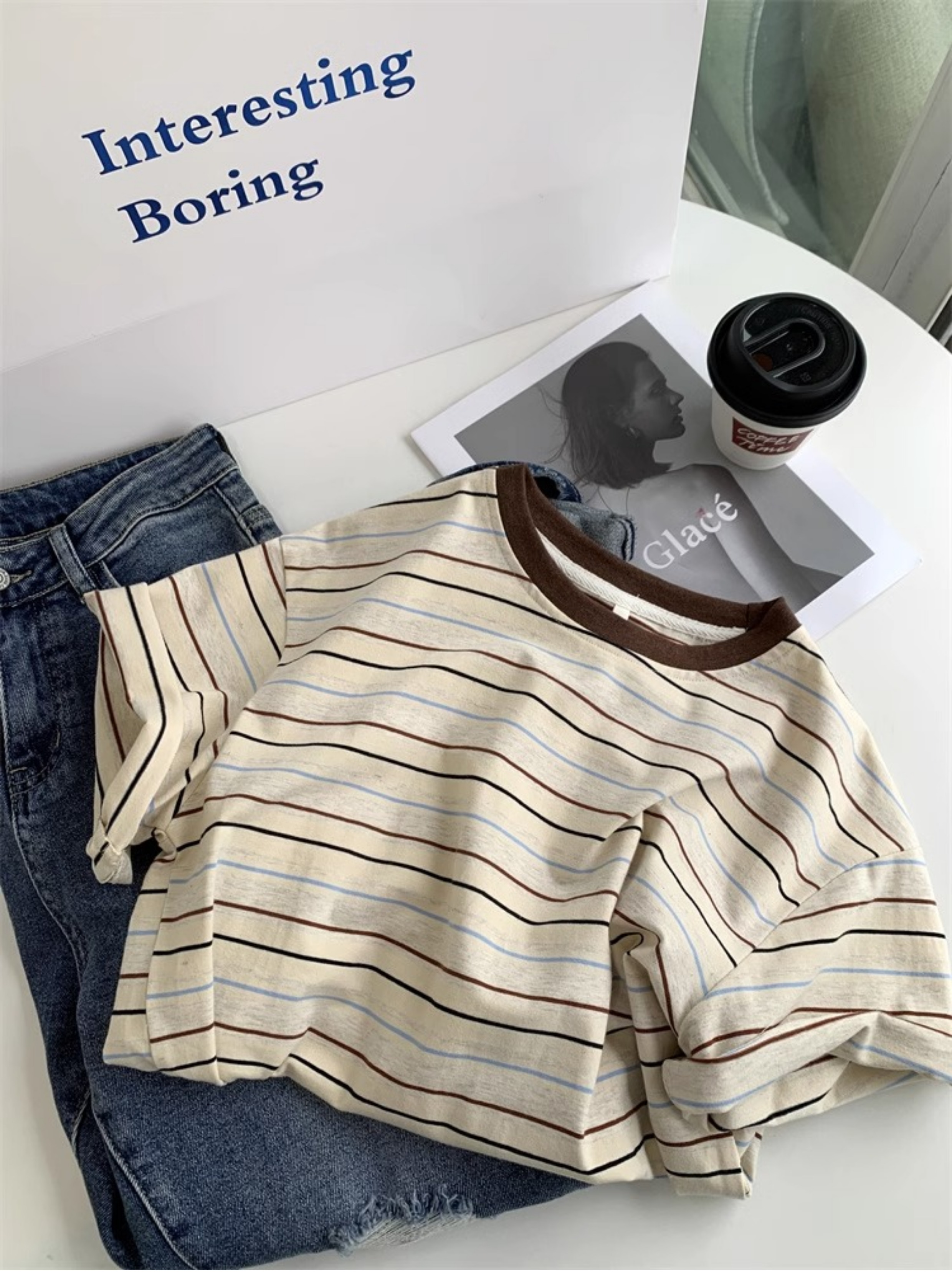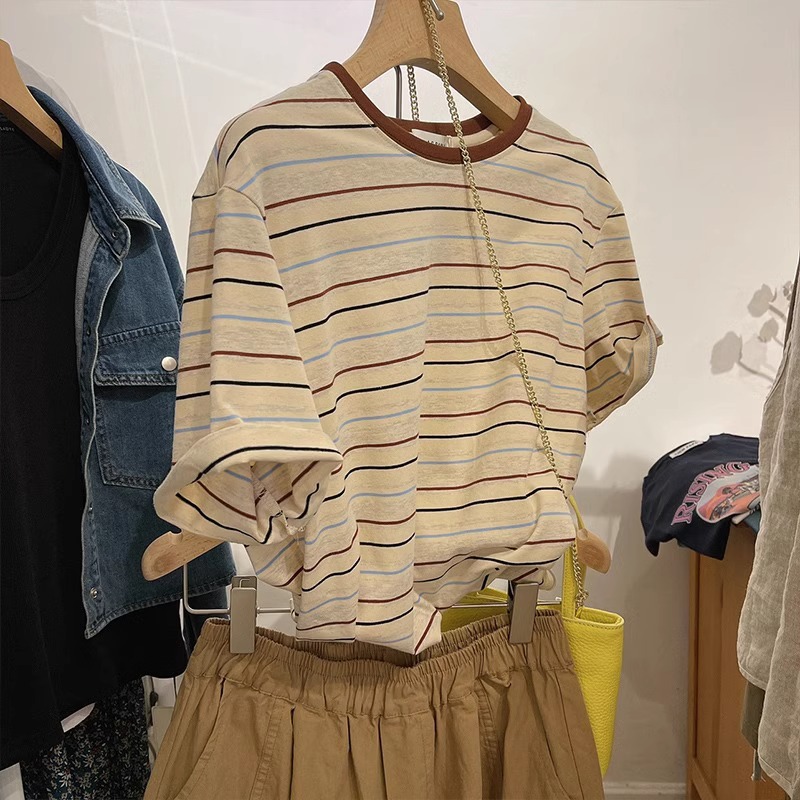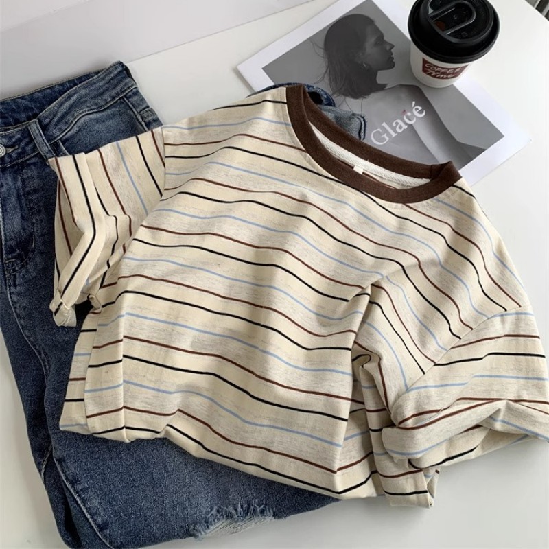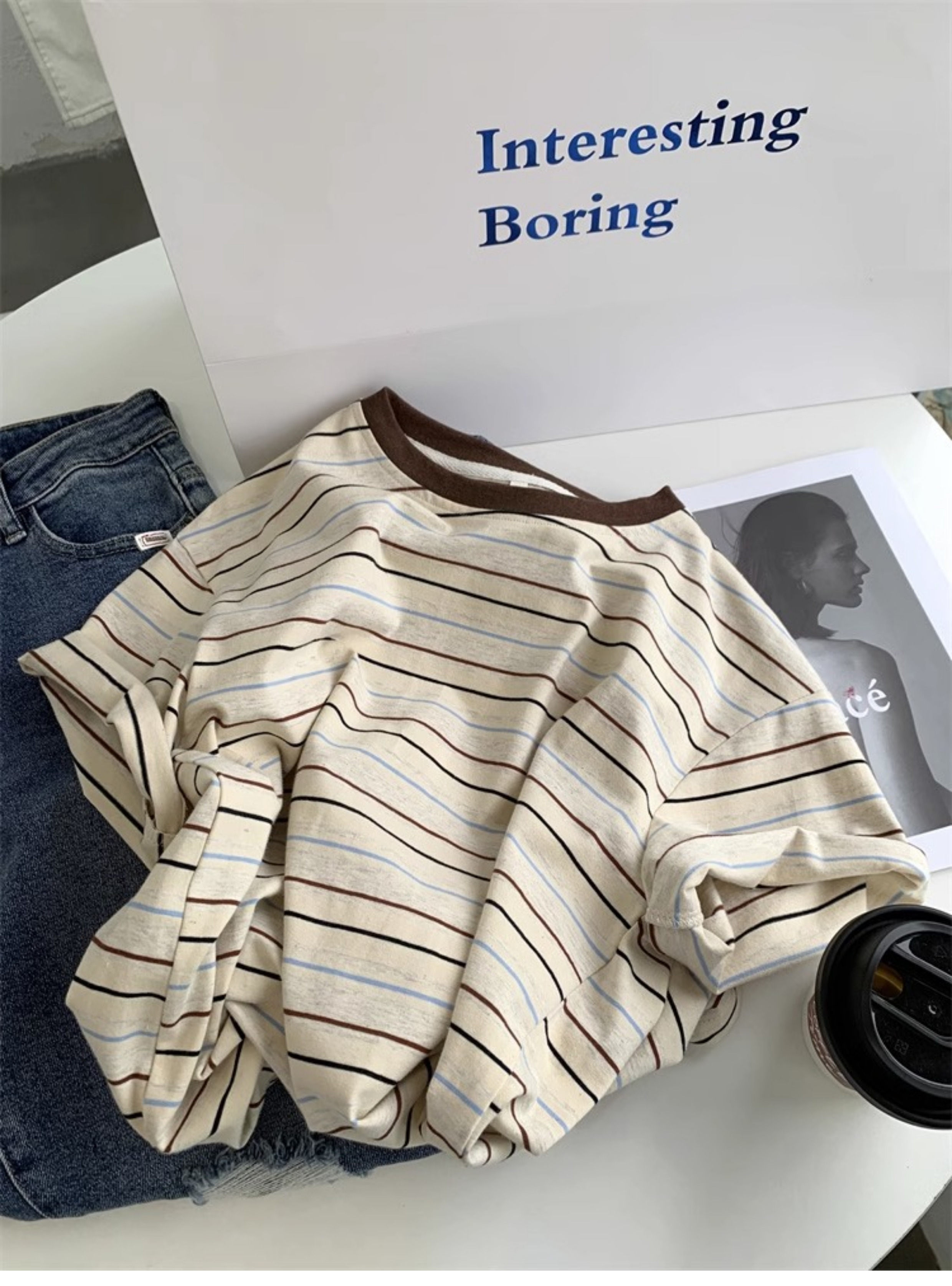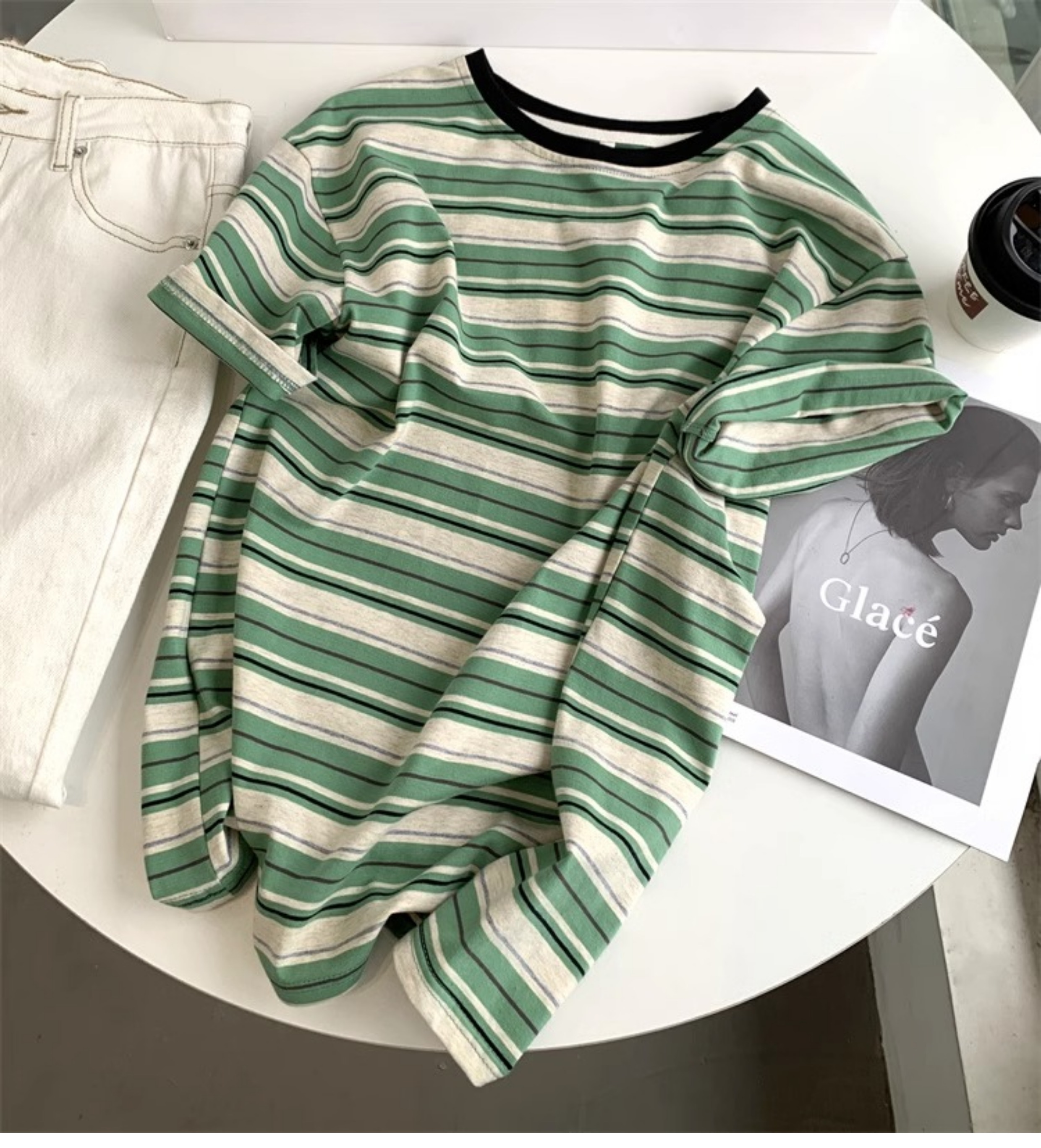 條紋短袖T恤女夏季純棉新款半袖正肩寬鬆大尺碼顯瘦休閒韓版上衣女