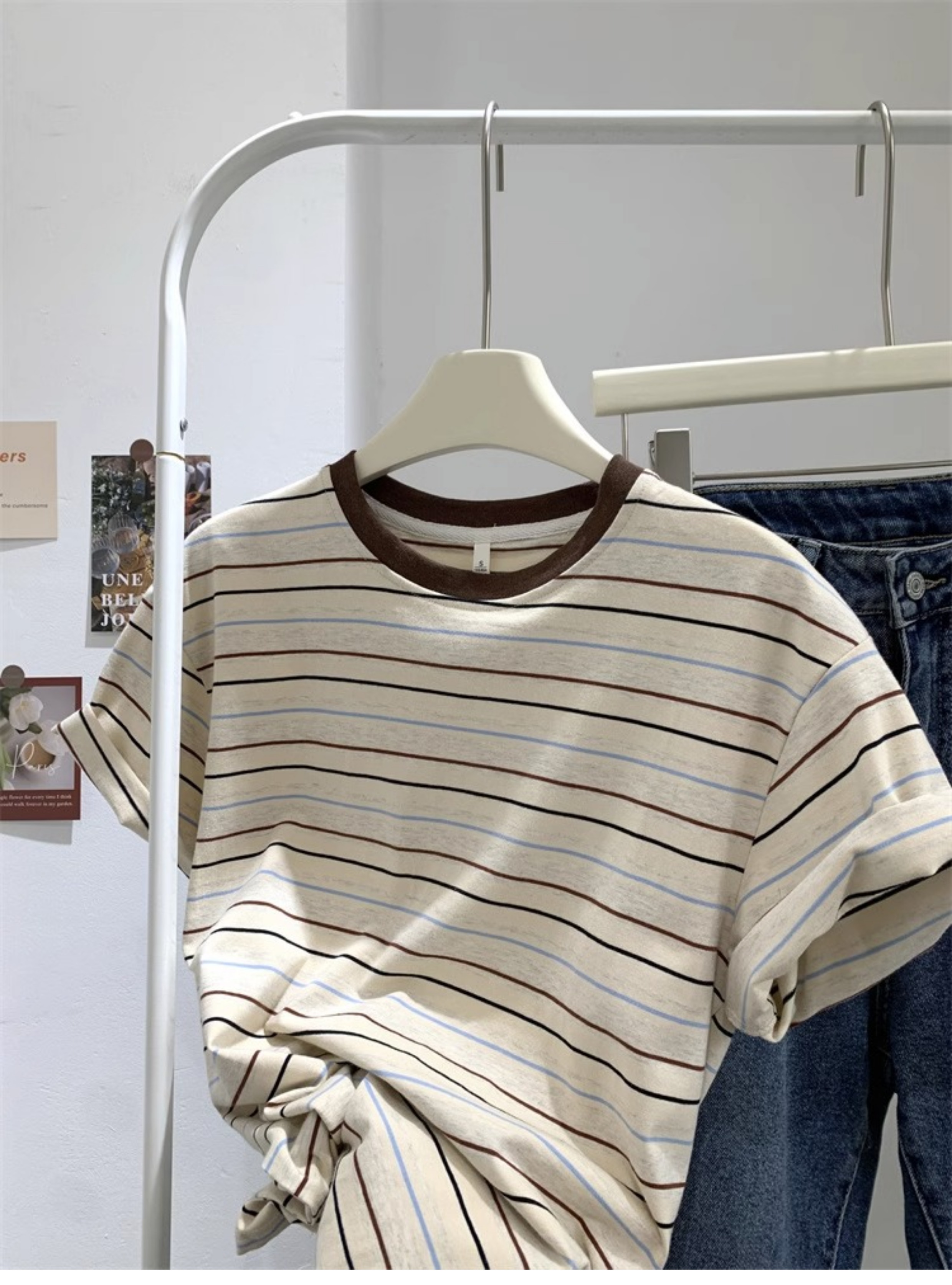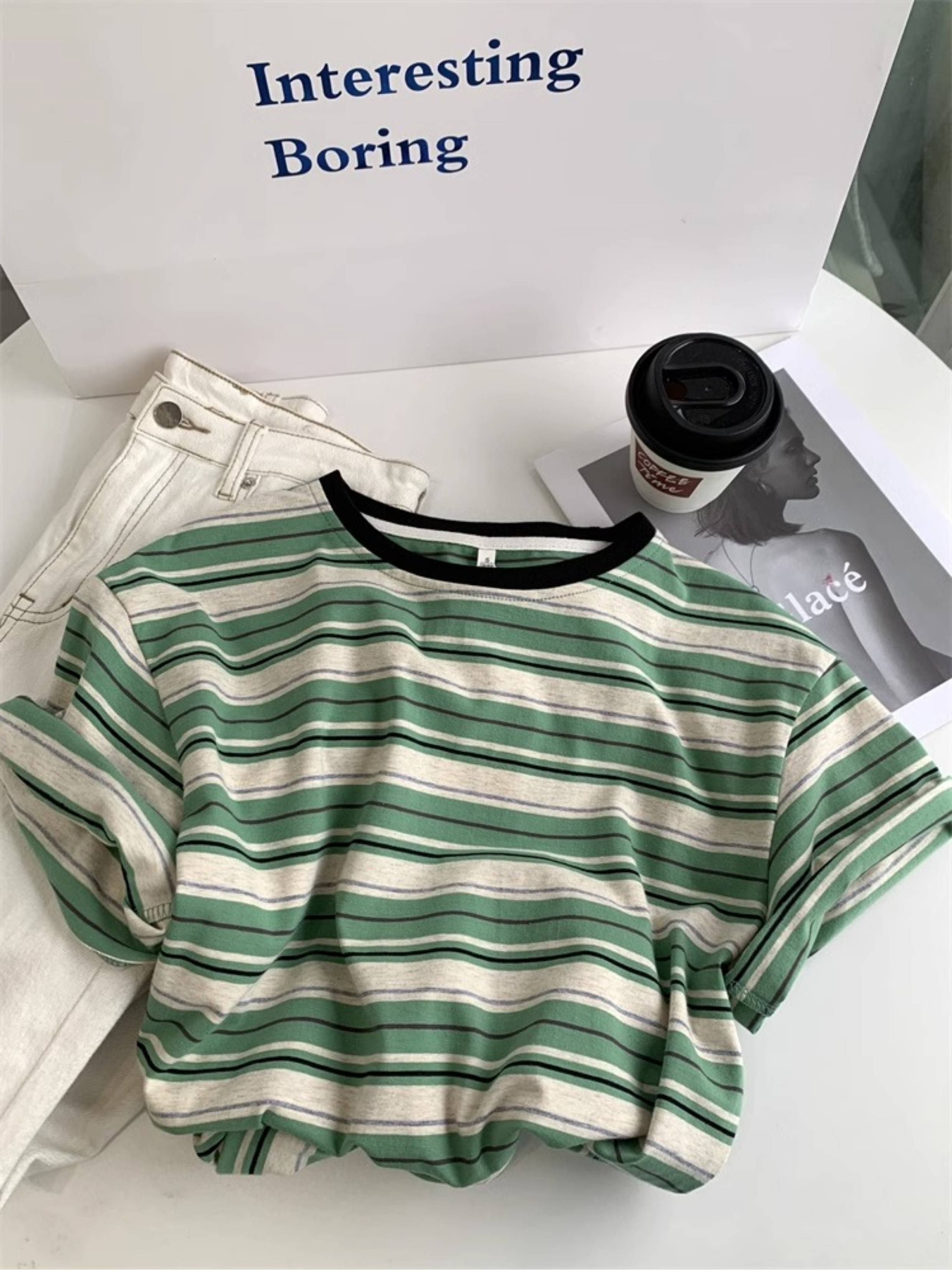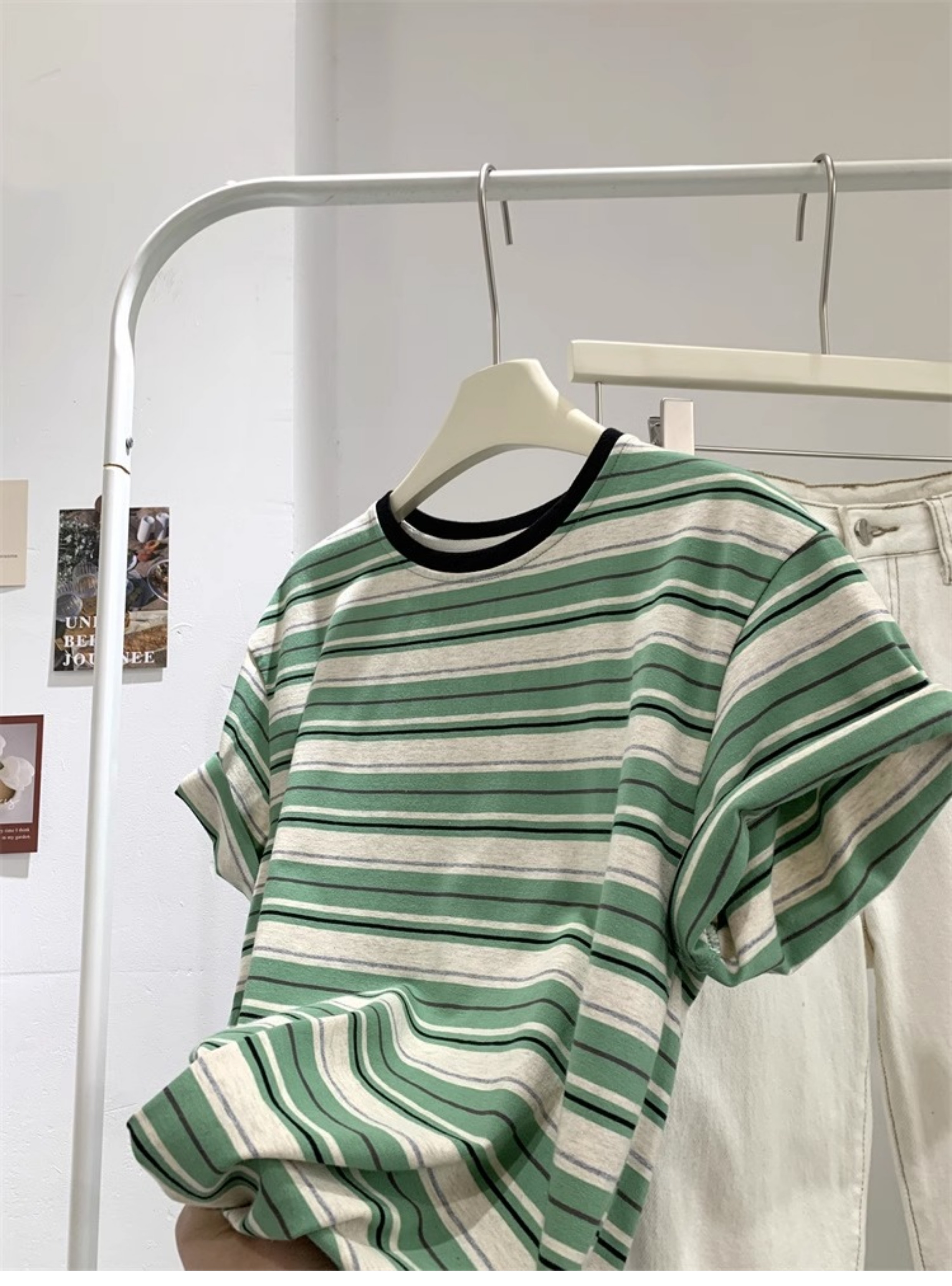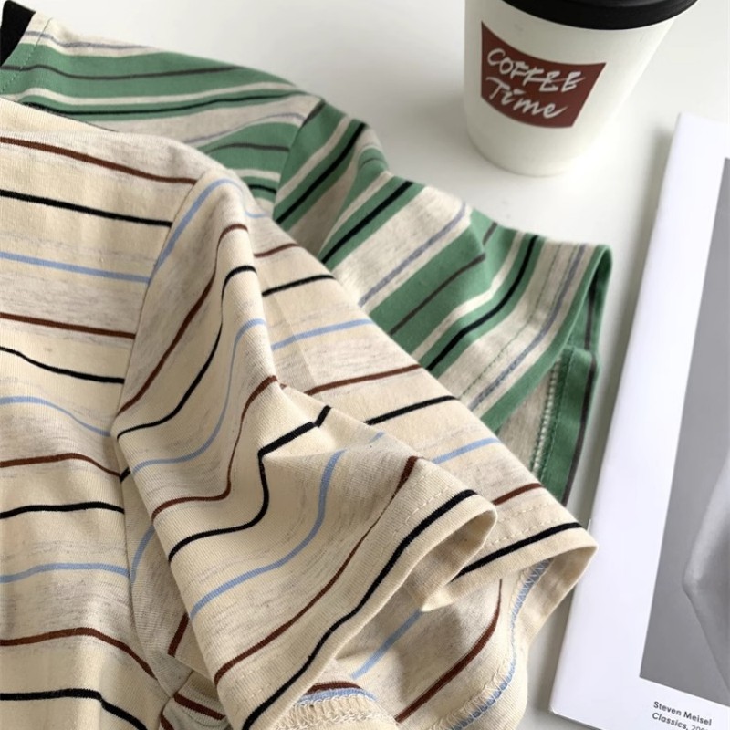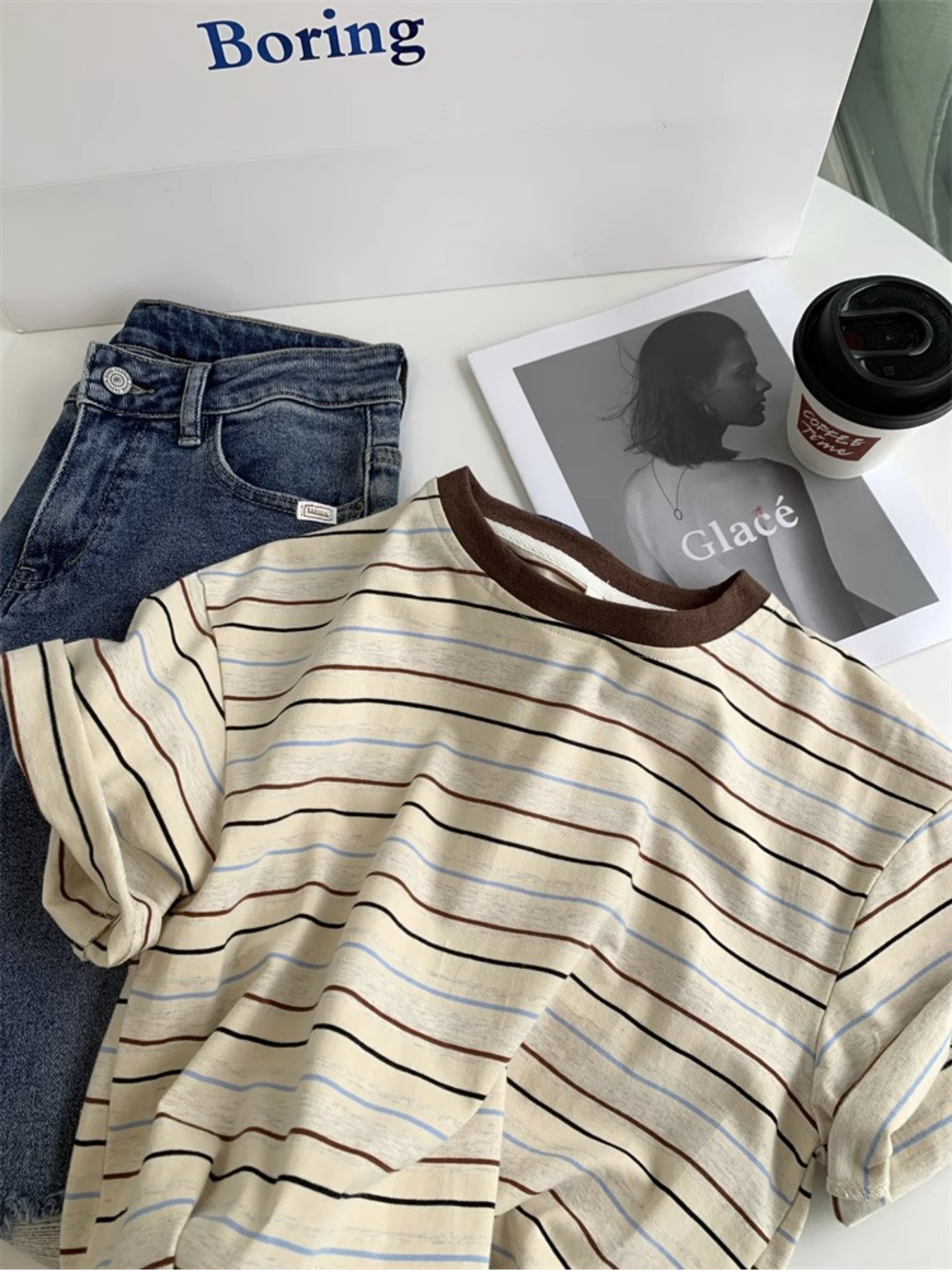 條紋短袖T恤女夏季純棉新款半袖正肩寬鬆大尺碼顯瘦休閒韓版上衣女