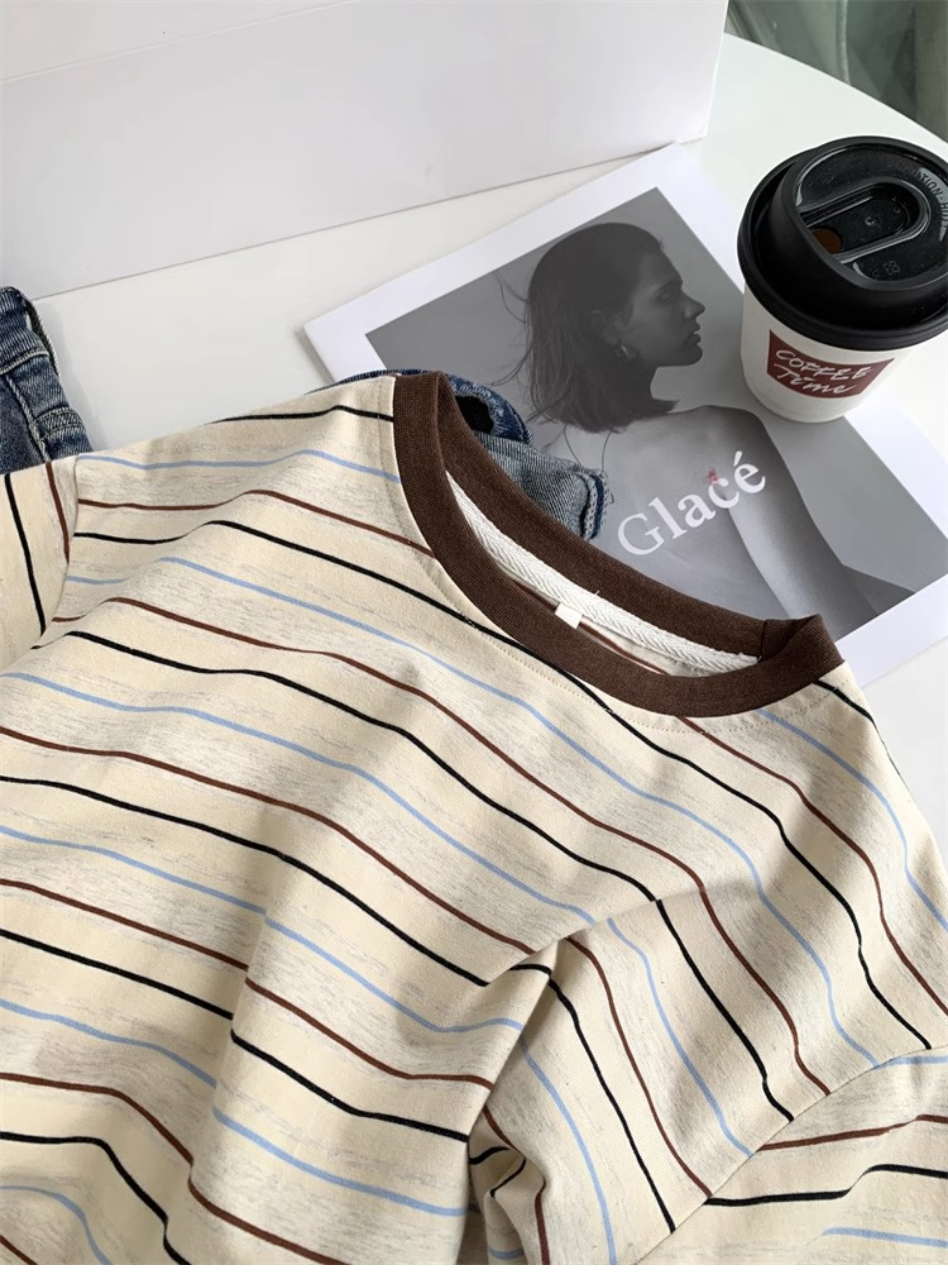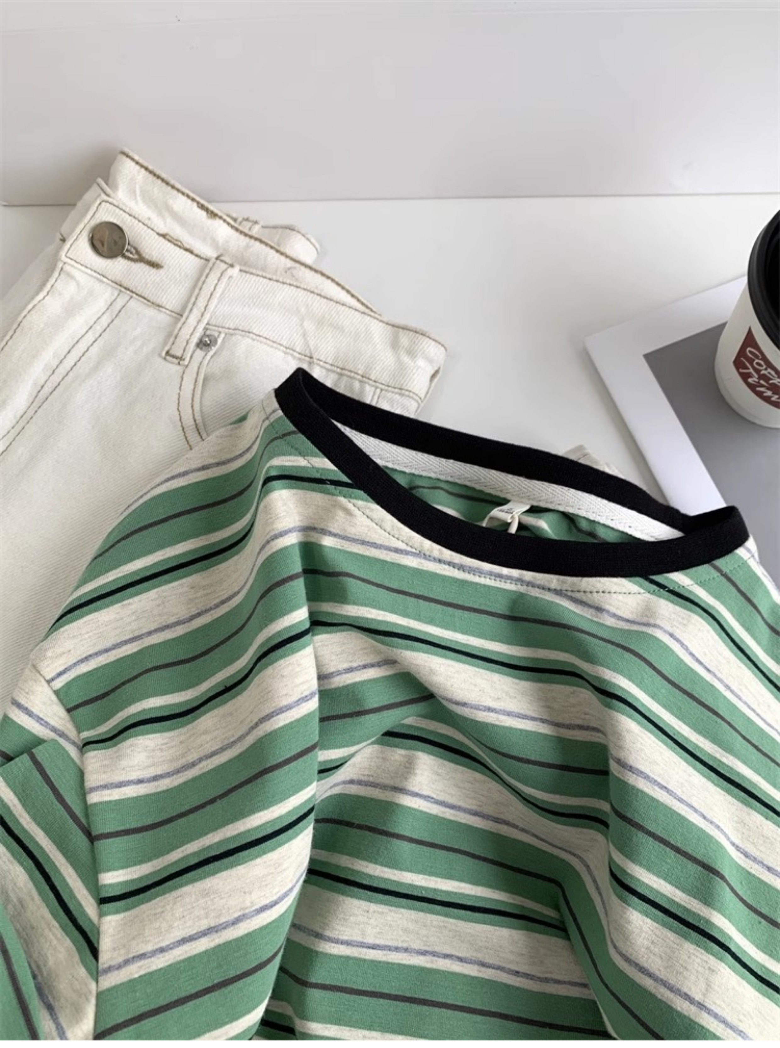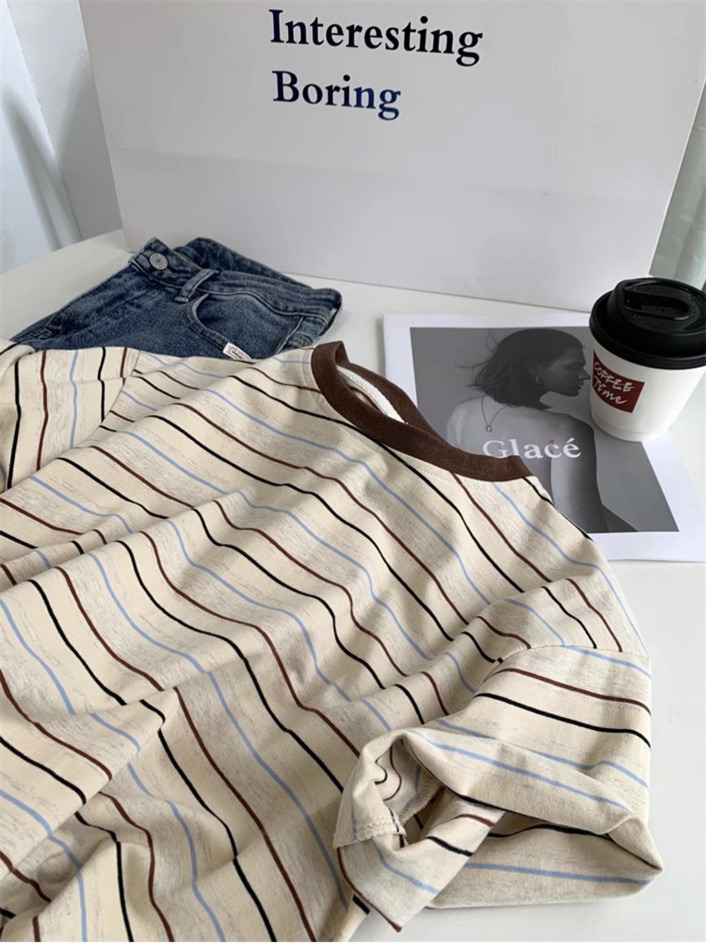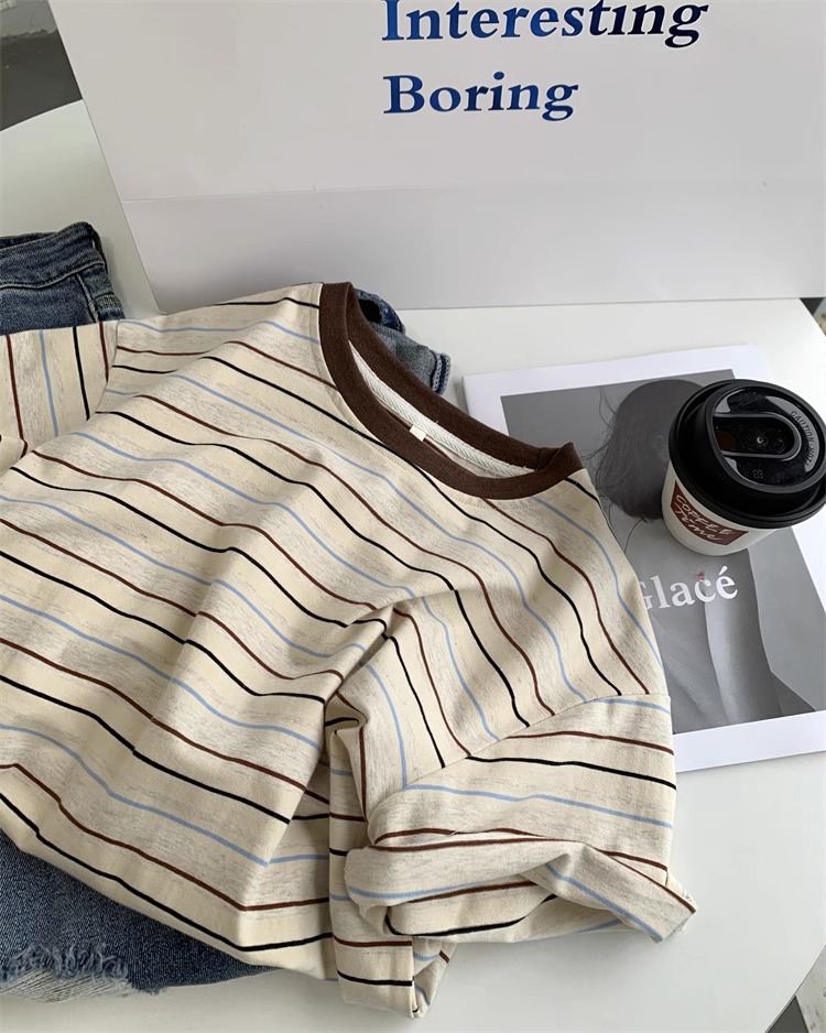 條紋短袖T恤女夏季純棉新款半袖正肩寬鬆大尺碼顯瘦休閒韓版上衣女