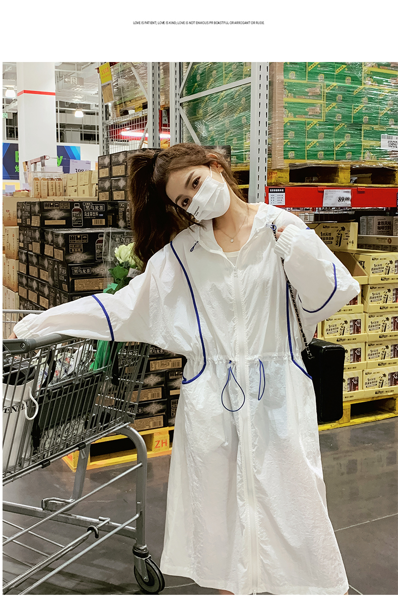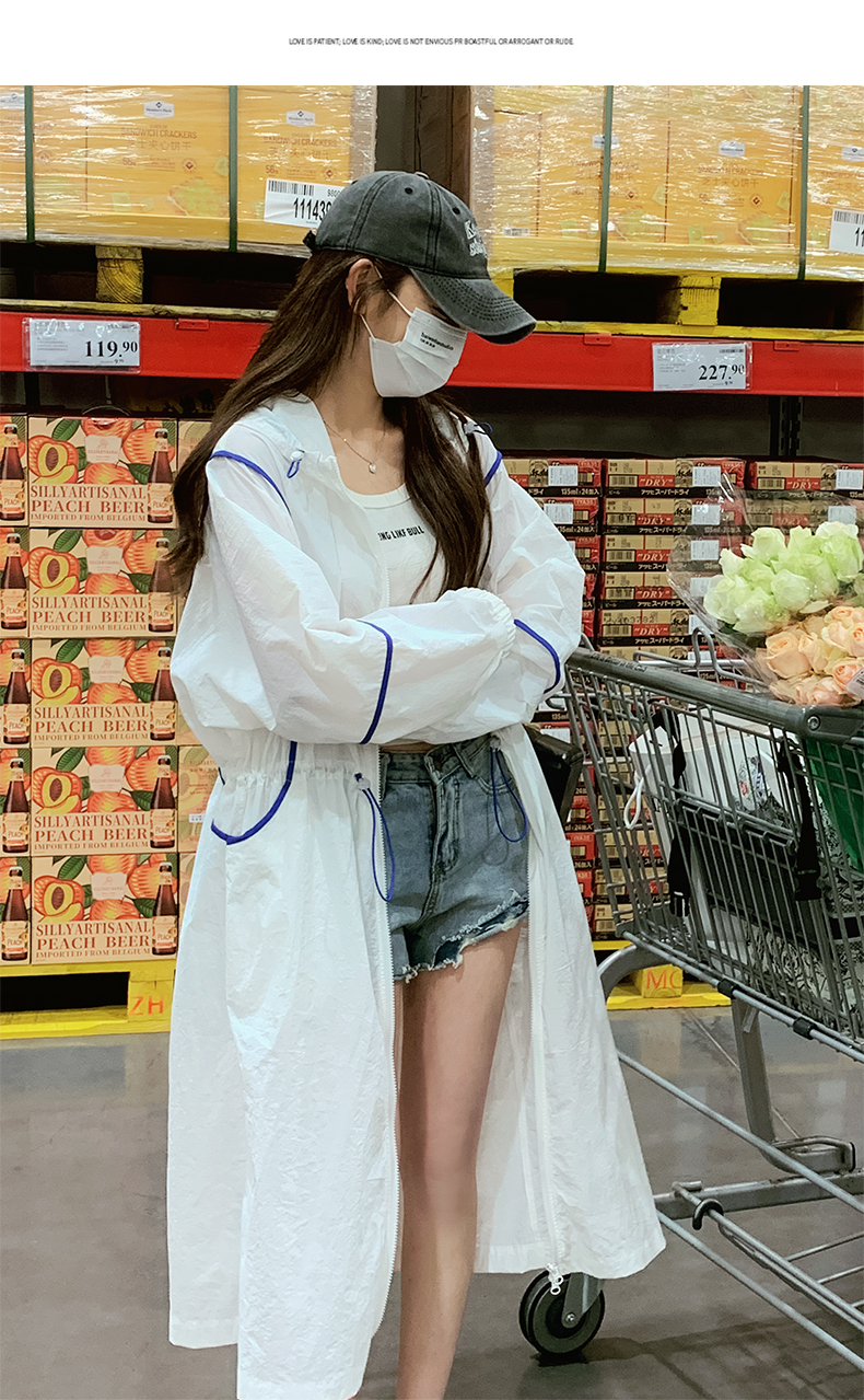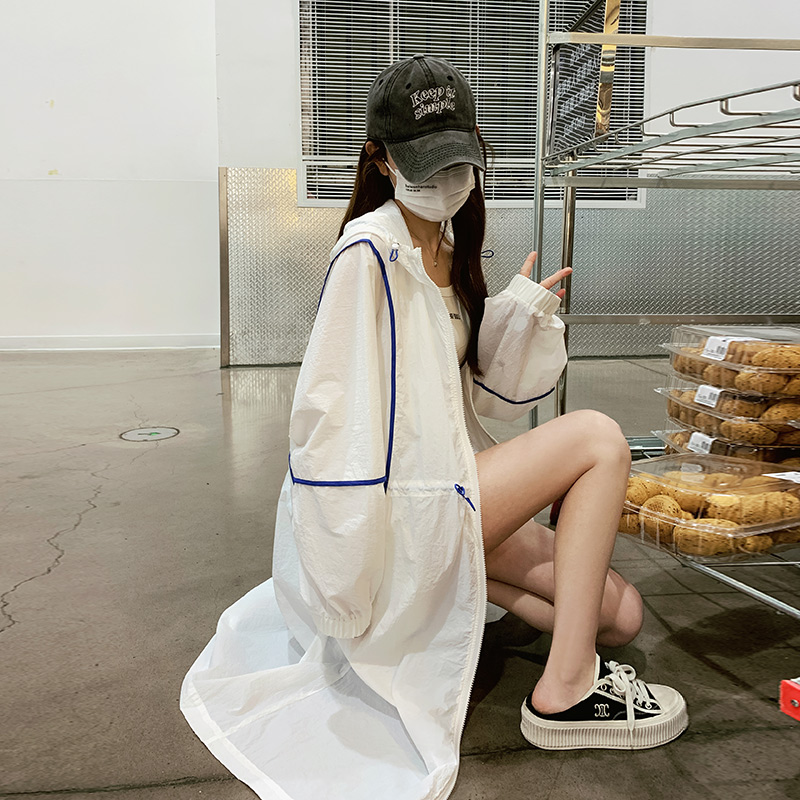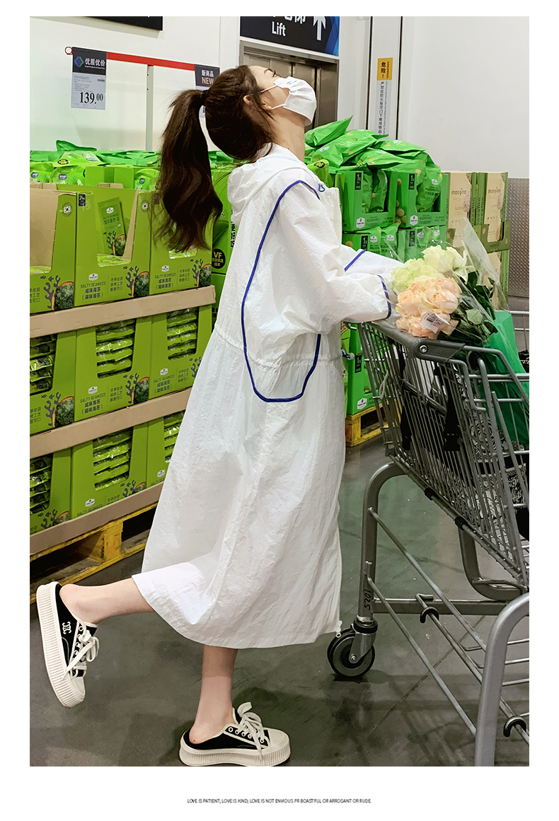 白色連帽防曬衣女長版2023新款寬鬆透氣法式開衫收腰外套薄款外搭