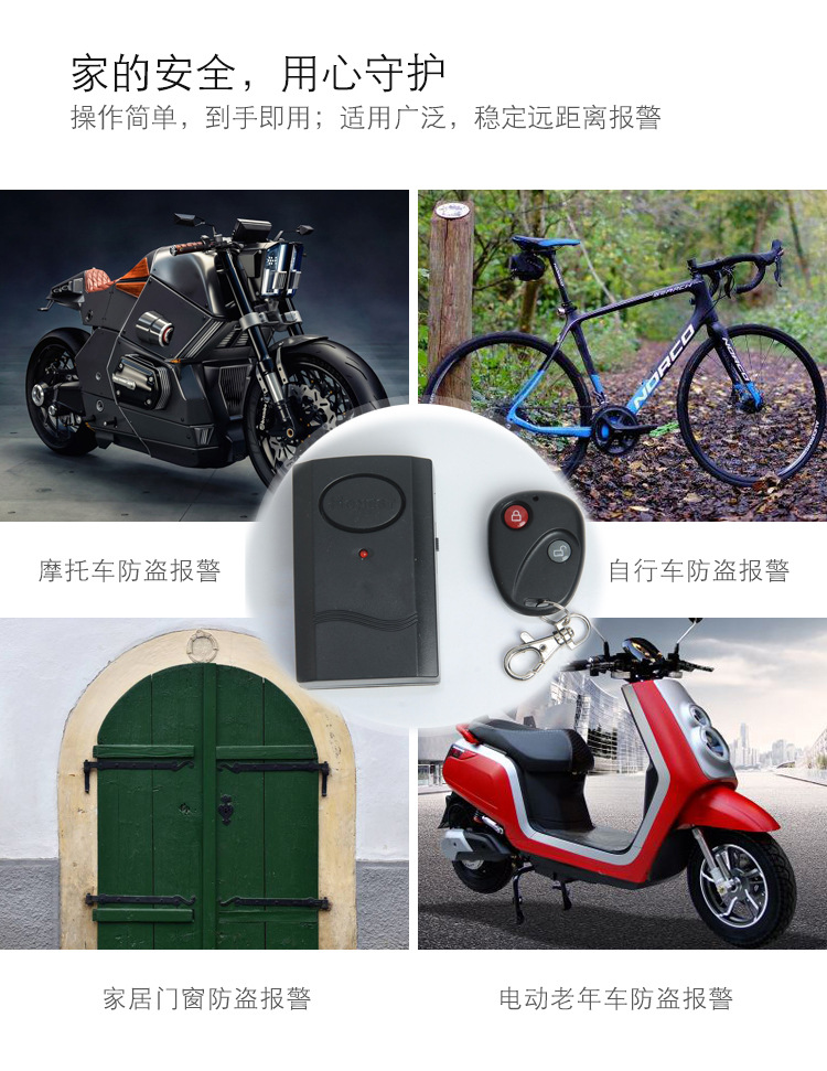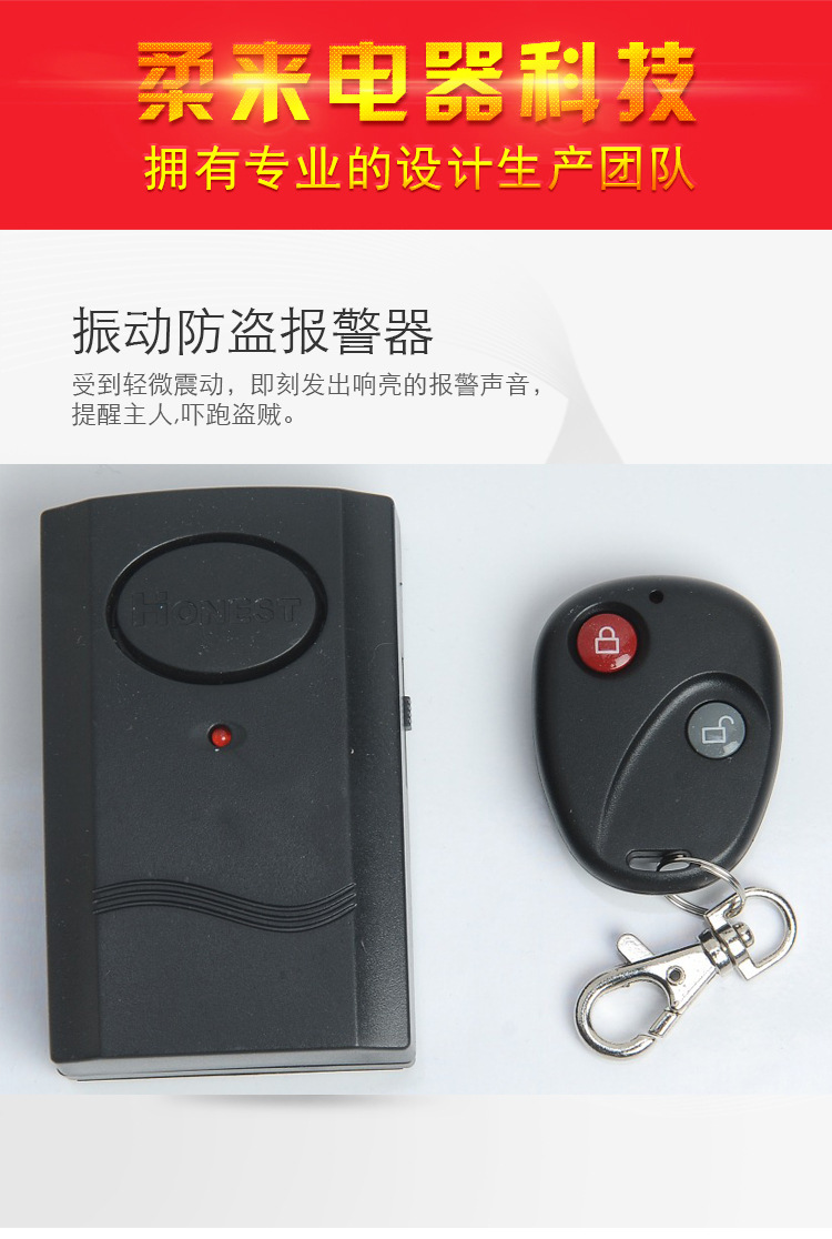 1.防盗设定:按一下布防键,则3秒后进入防盗警戒状态,震动触发,报警声循环4-8次。