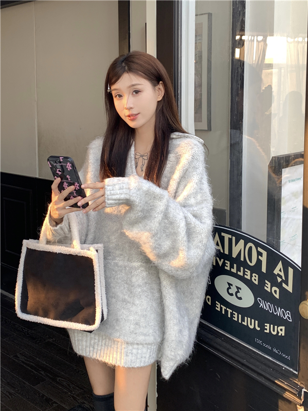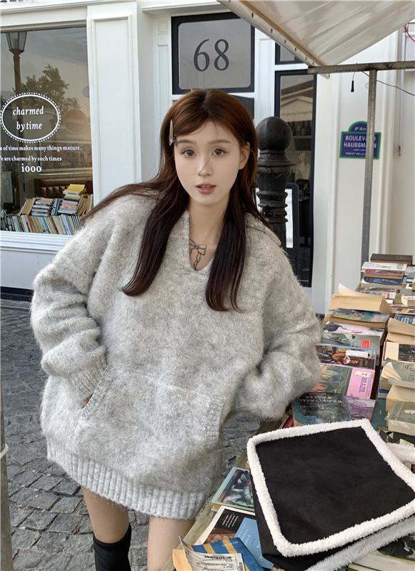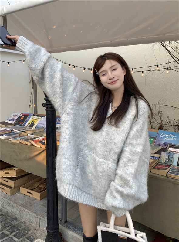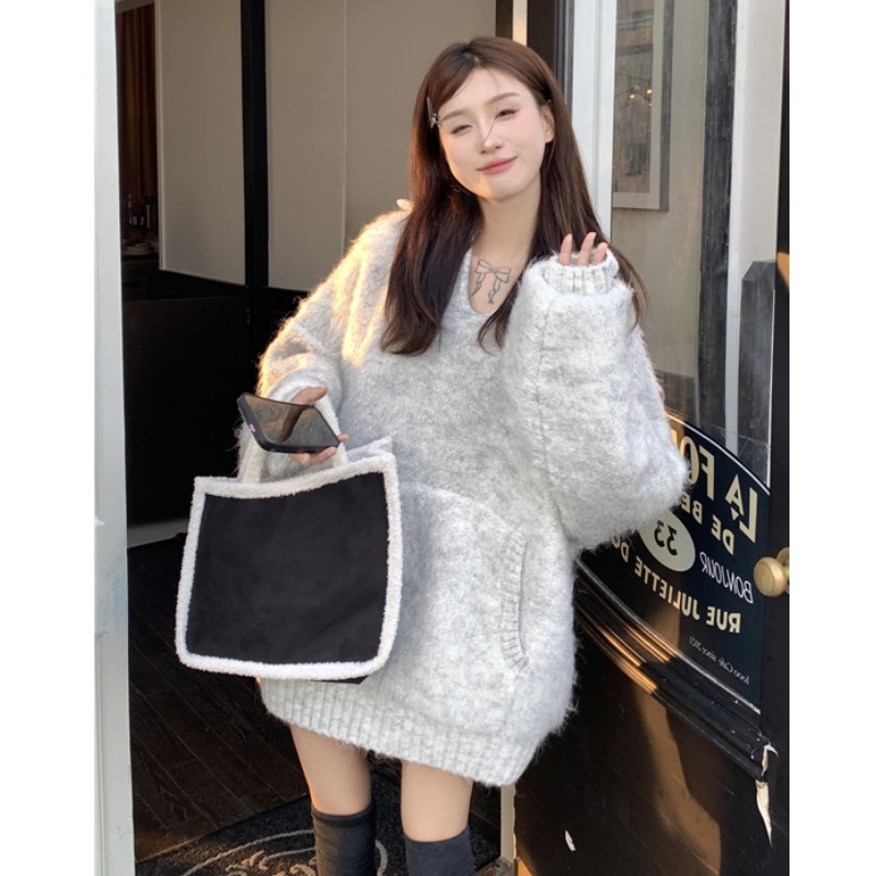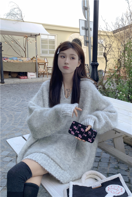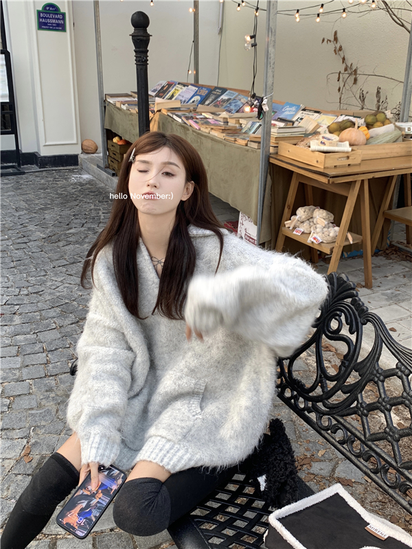灰色套頭毛衣女秋冬加厚2023新款寬鬆韓系溫柔風軟糯中長版針織衫