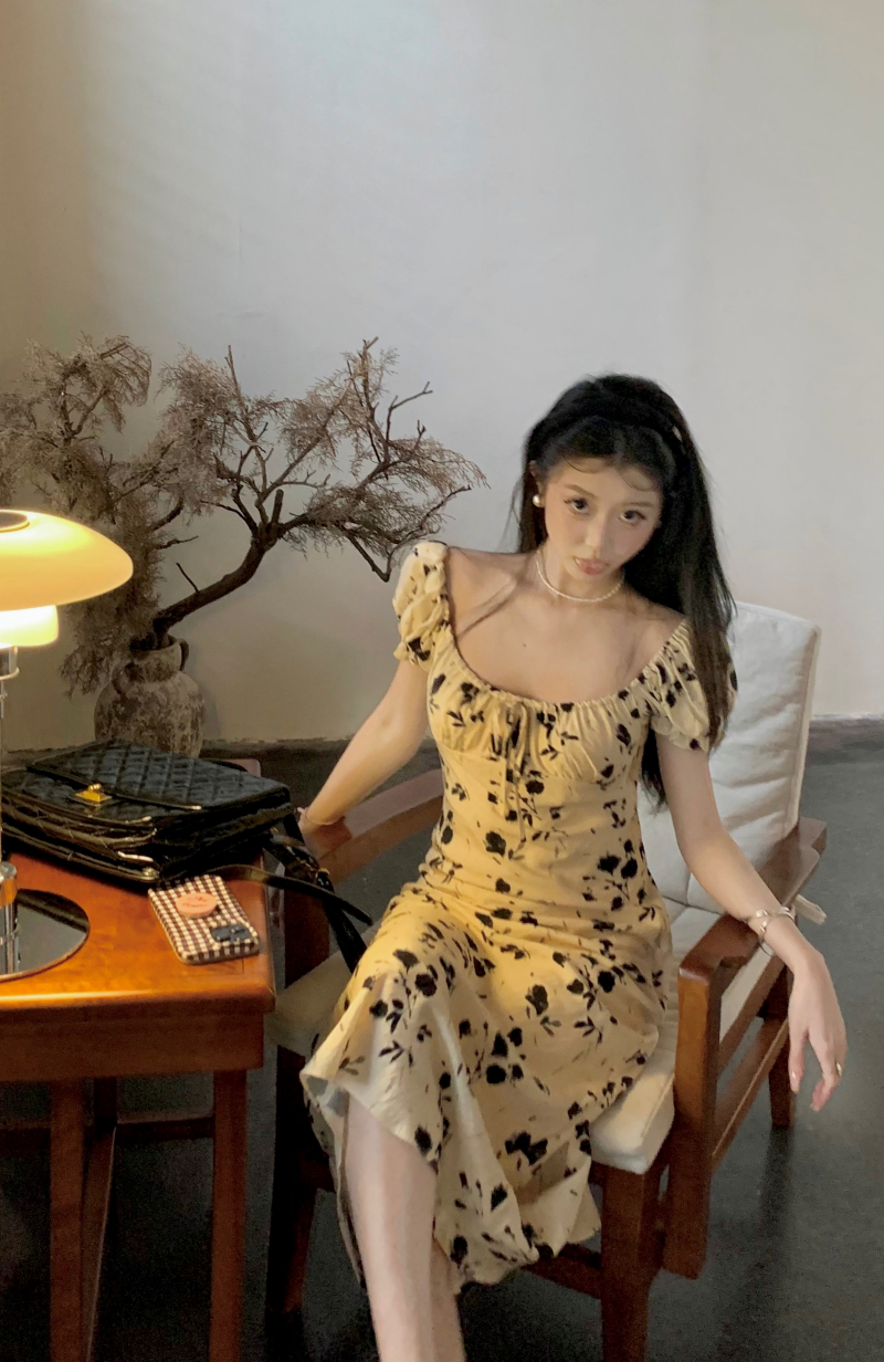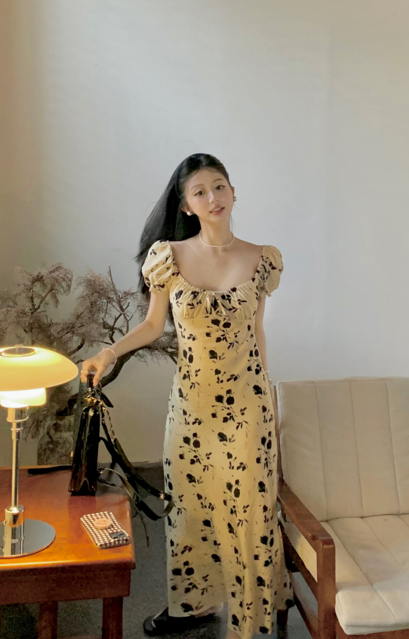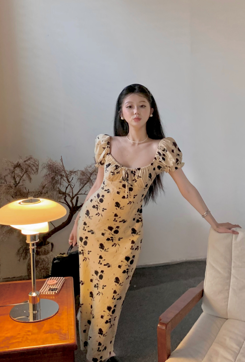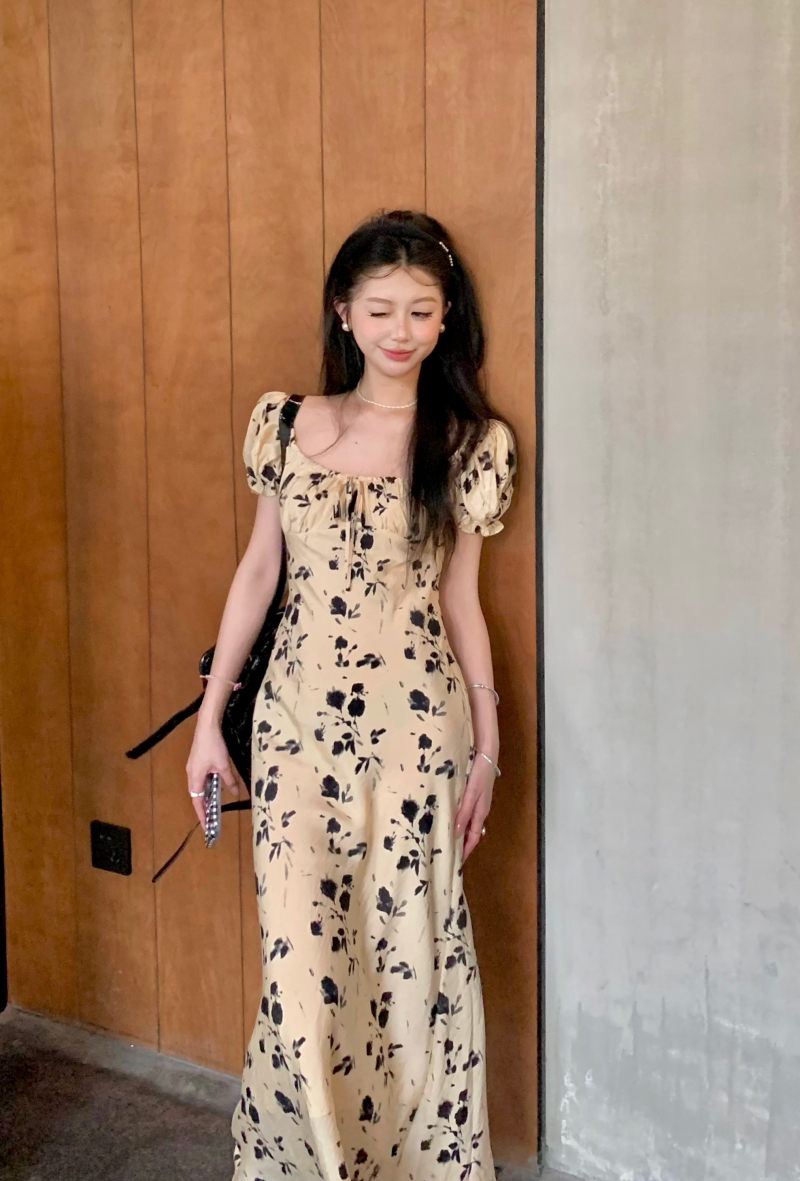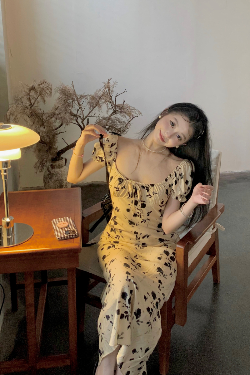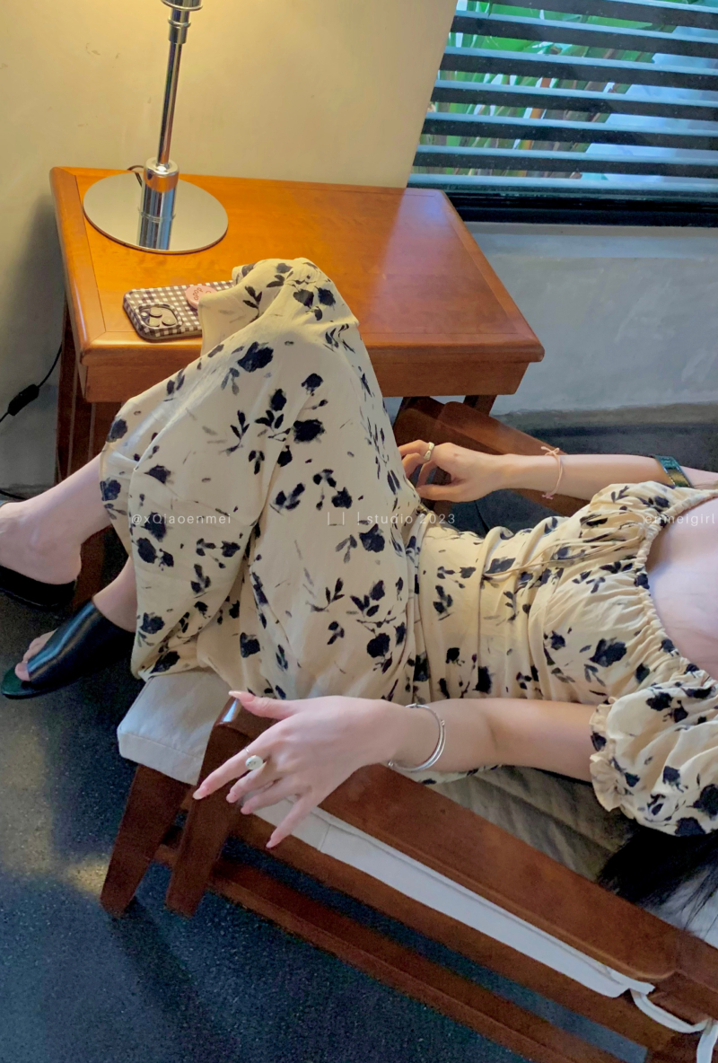 PPHOME溫柔學姐~簡約潮方領綁帶泡泡袖碎花裙女夏季暈染顯瘦長裙
