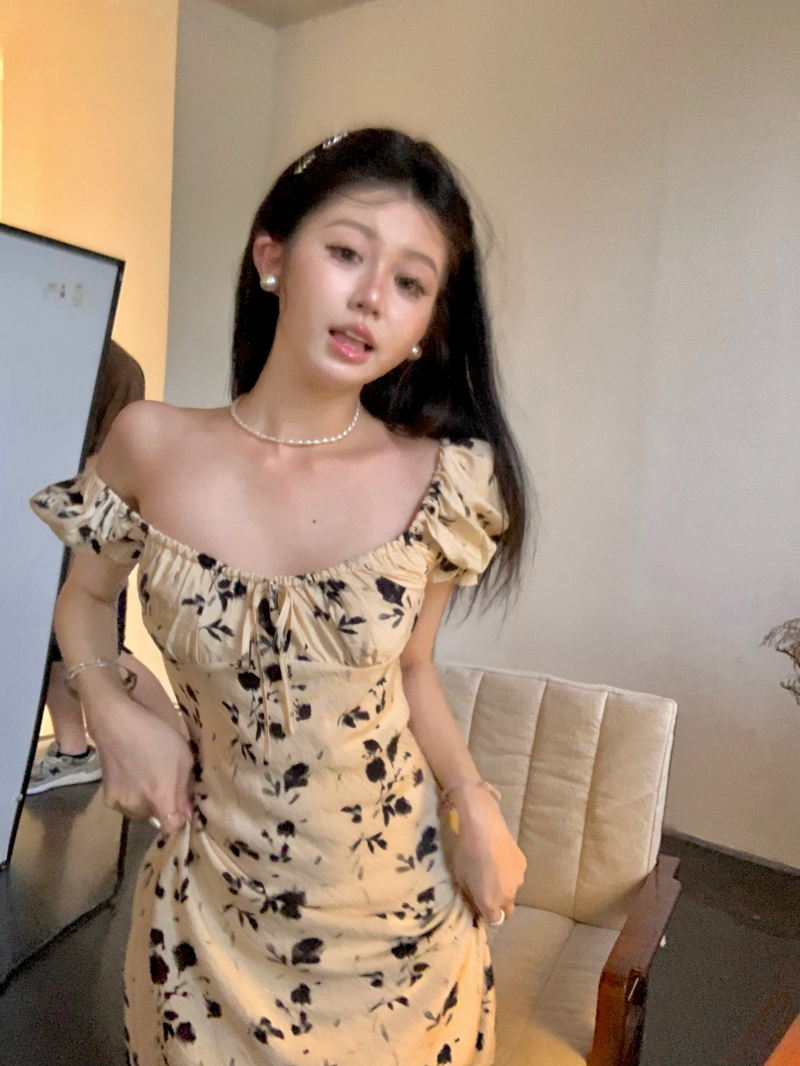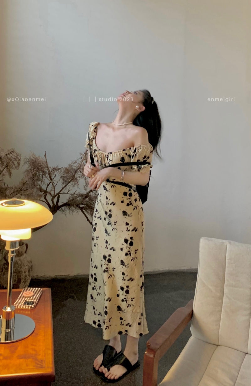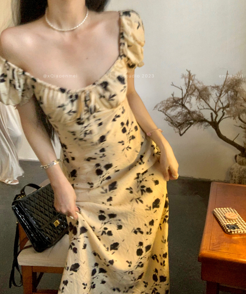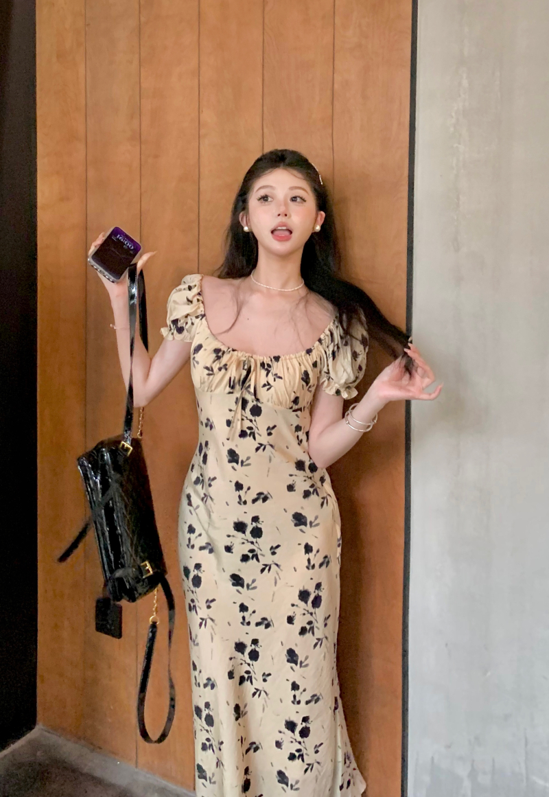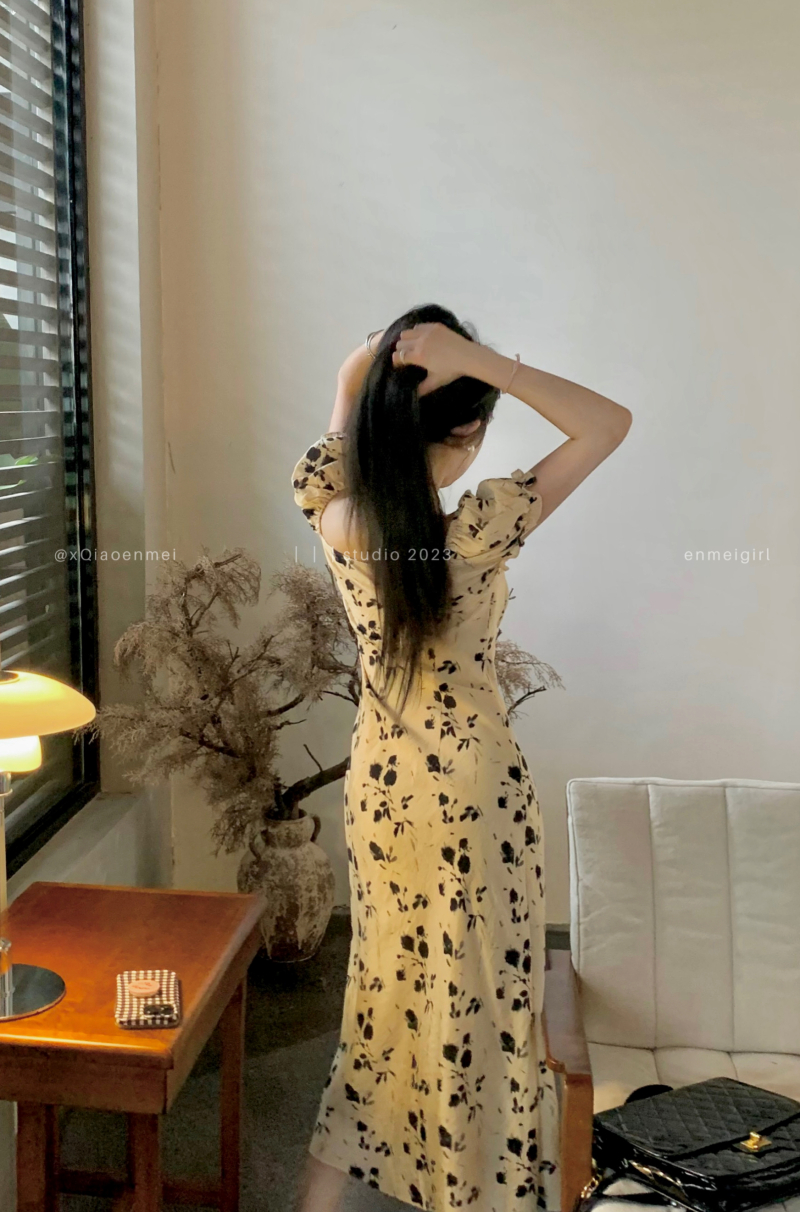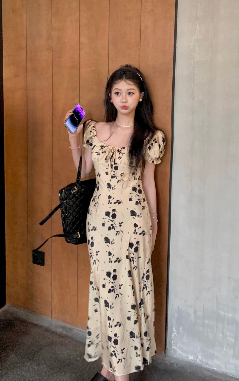 PPHOME溫柔學姐~簡約潮方領綁帶泡泡袖碎花裙女夏季暈染顯瘦長裙
