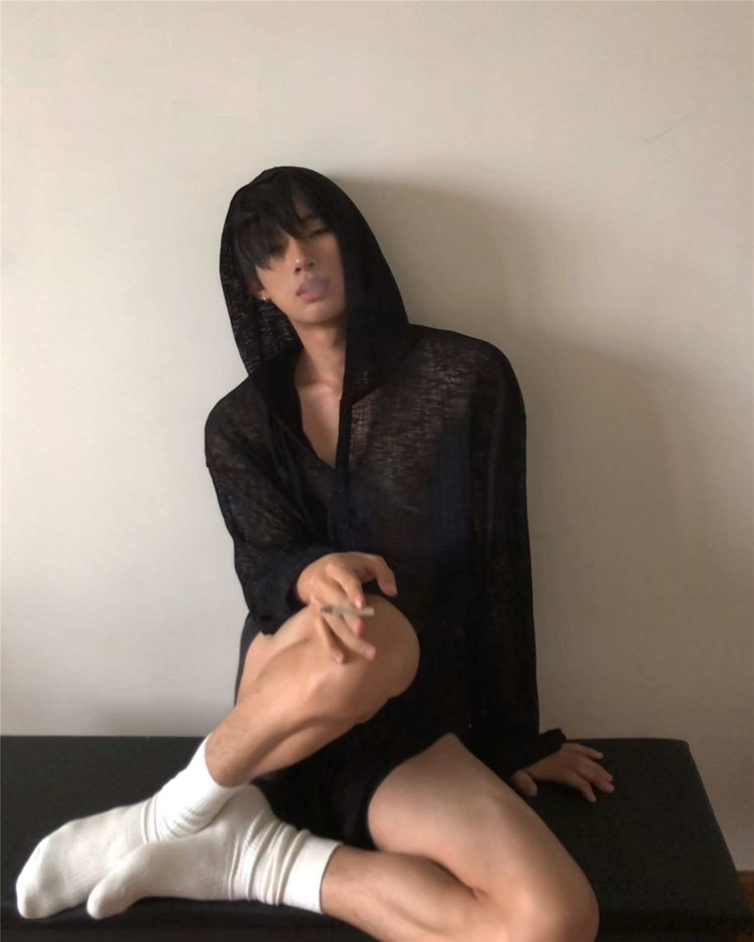 奇趣魚 初秋新款涼爽如麻肌膚般的裸感 小眾設計款連帽長袖T恤潮