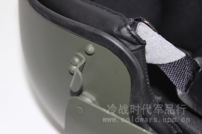 盔顶和两侧的金属零件,起到限制面罩滑动区间作用,其中头顶上那个圆锥型金属零件是面罩掀起固定入味卡扣,由于参照原品采用简单的金属装扣,个别会出现由于面罩上凸起撞片下压或者锥顶磨圆导致撞扣无法入位的情况,属于正常现象,处理方式是将面罩拆下来,用工具将撞片中间的凸起进行处理,使其能够卡住卡扣,即可解决。