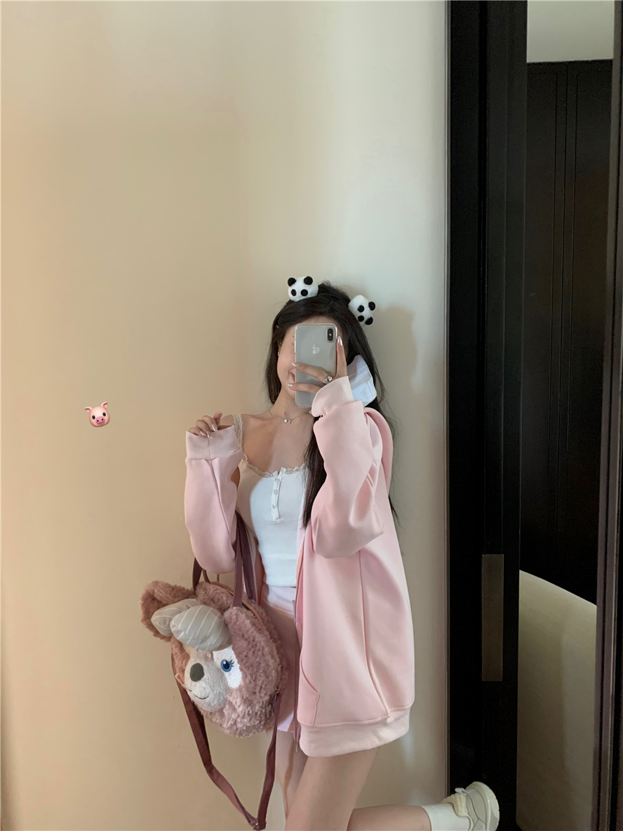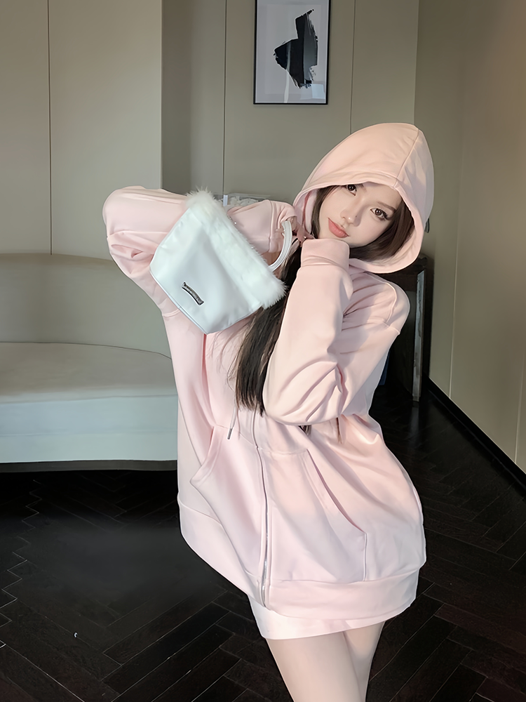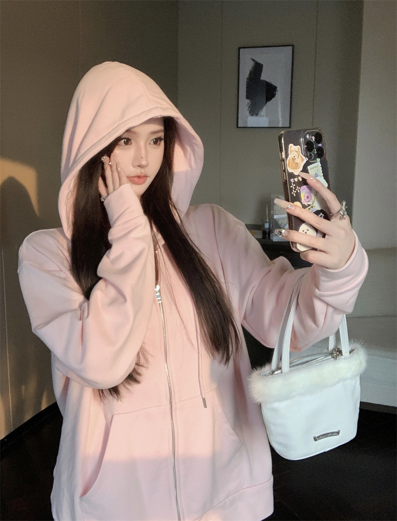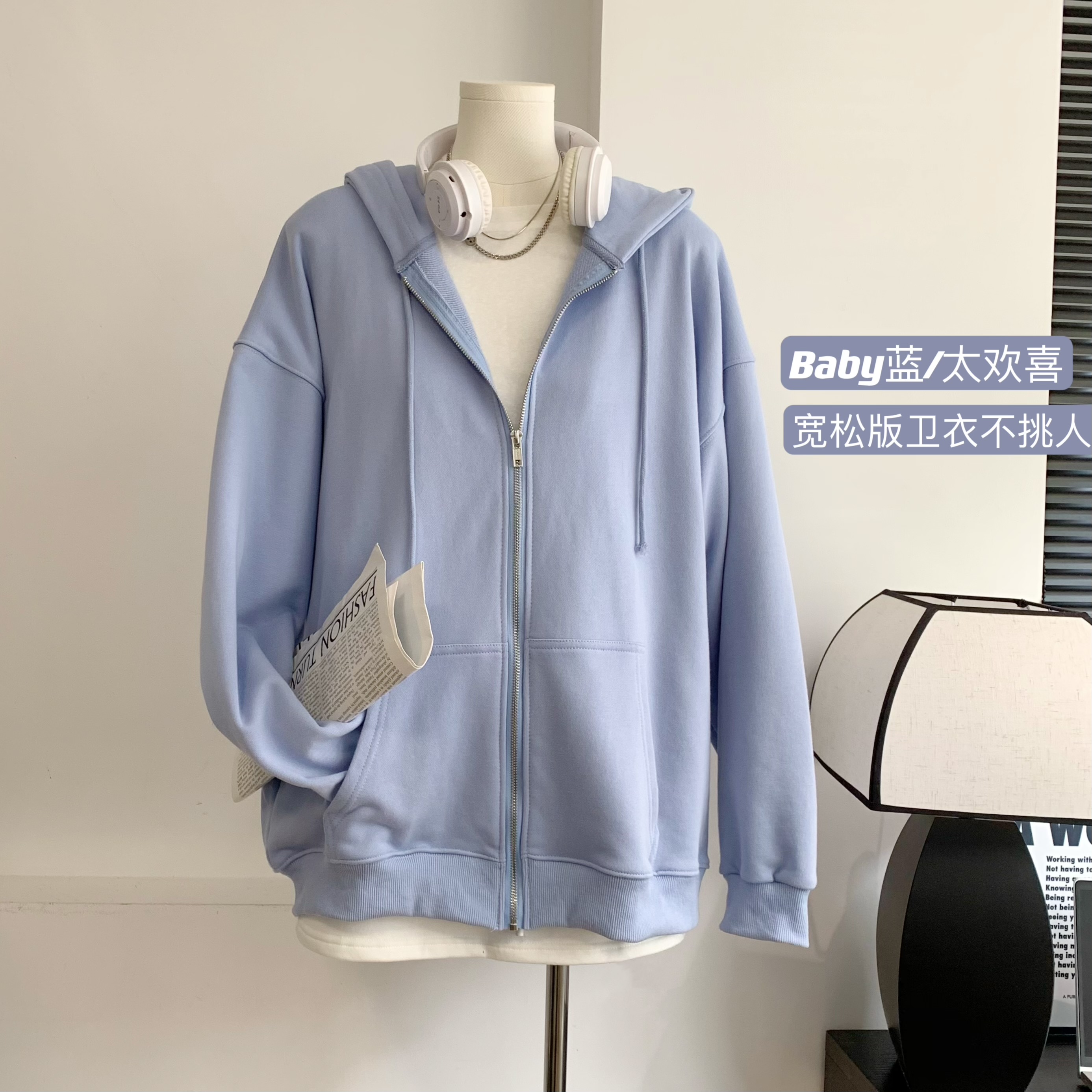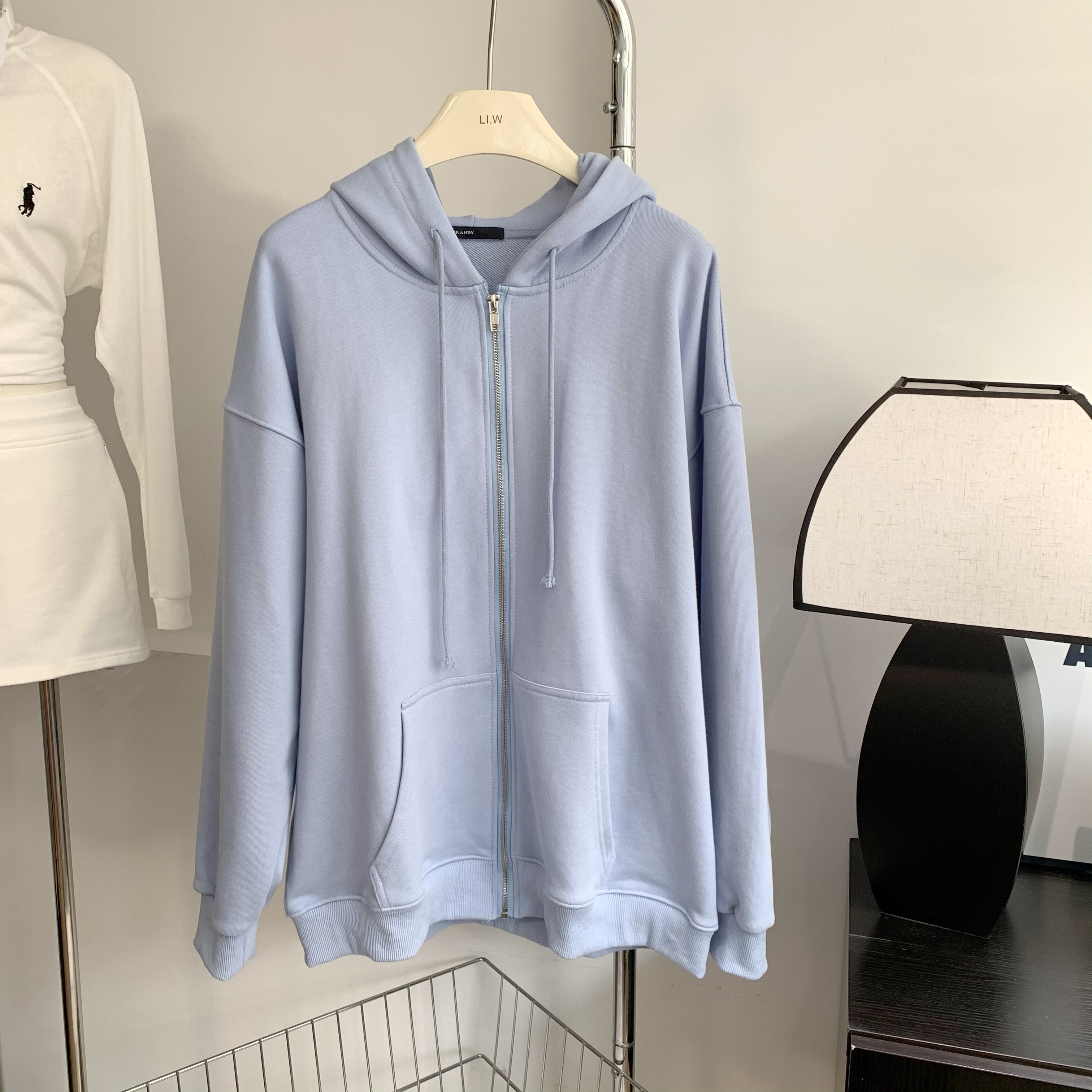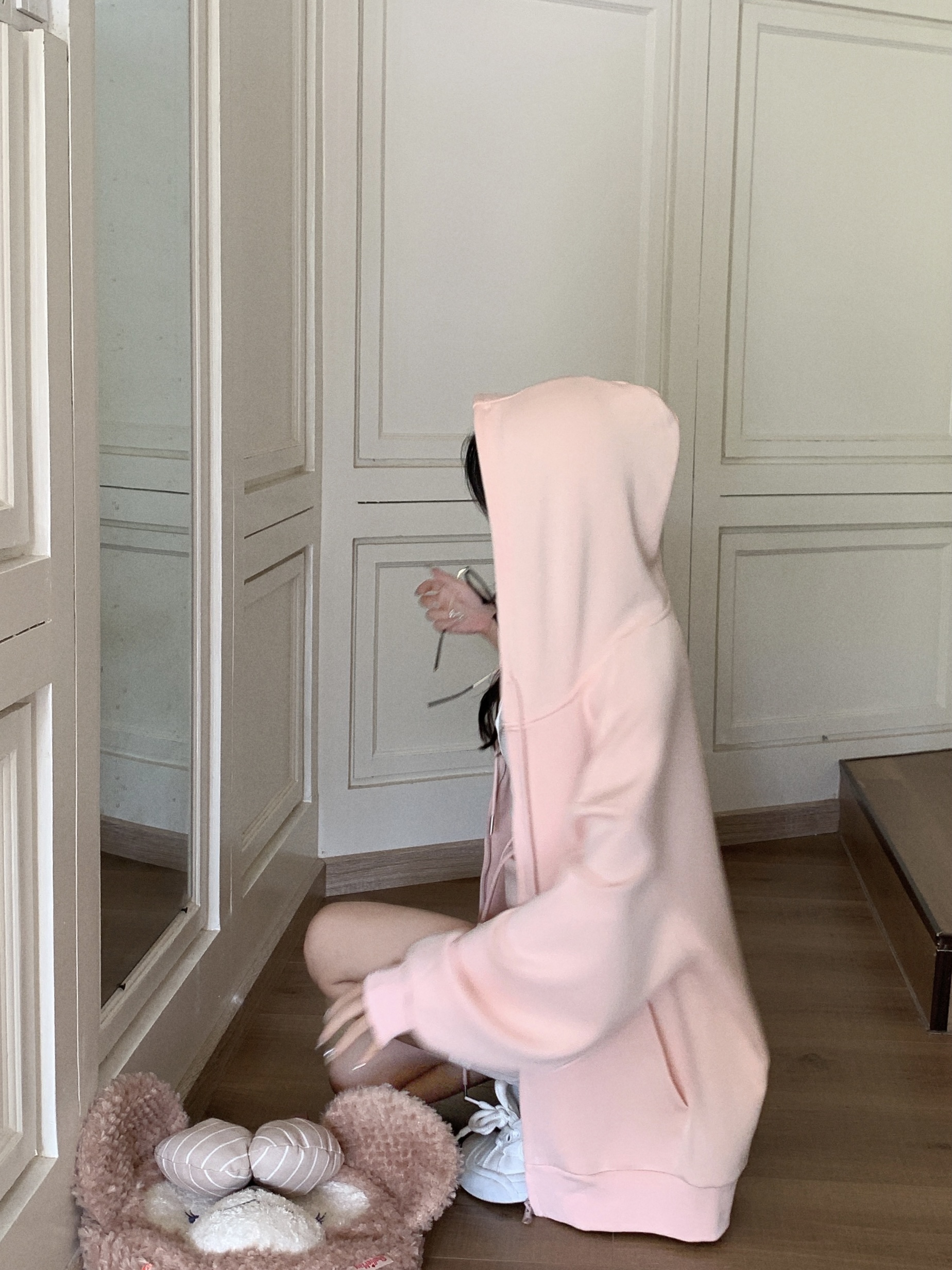 MOXI裸粉蜜桃 新款運動休閒感韓系寬鬆純色連帽開衫衛衣休閒外套