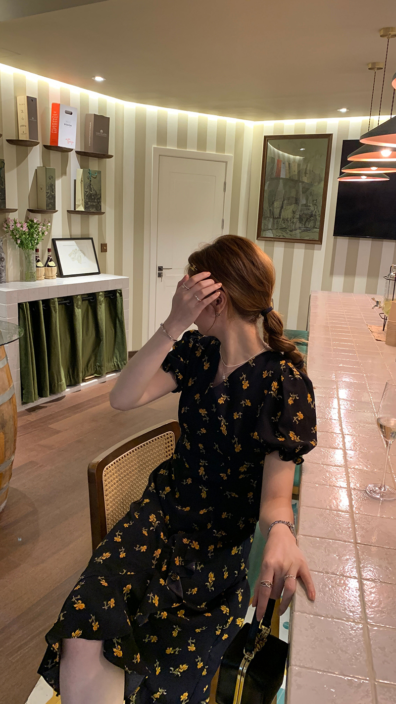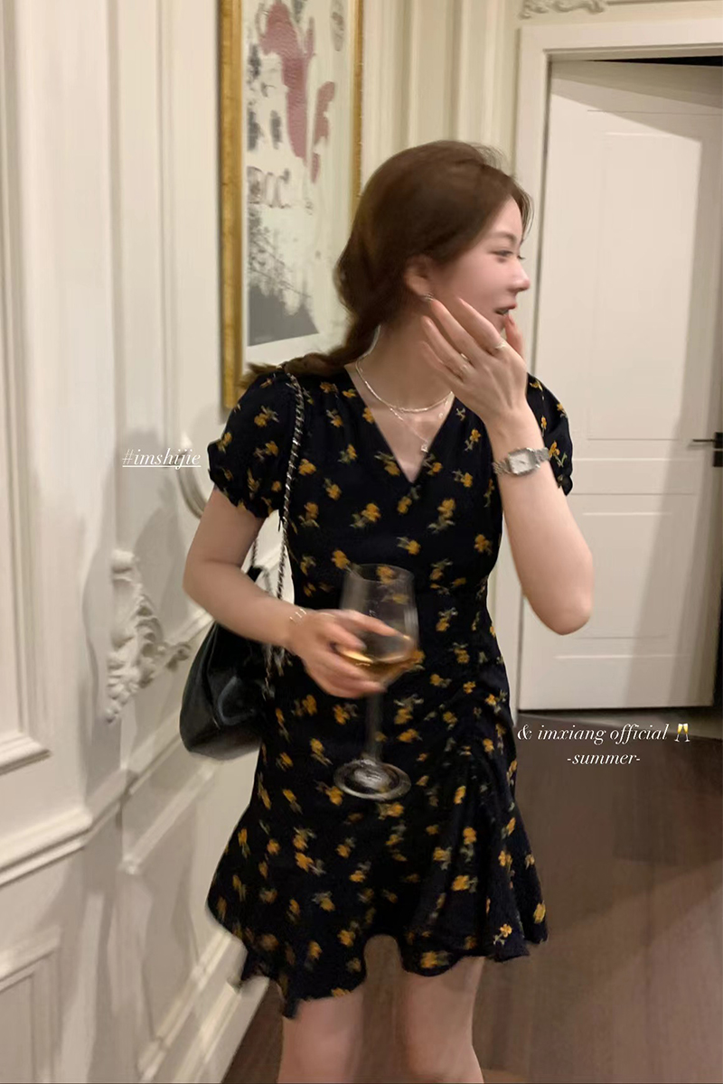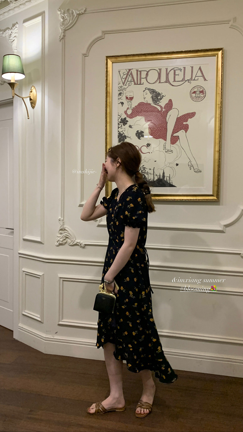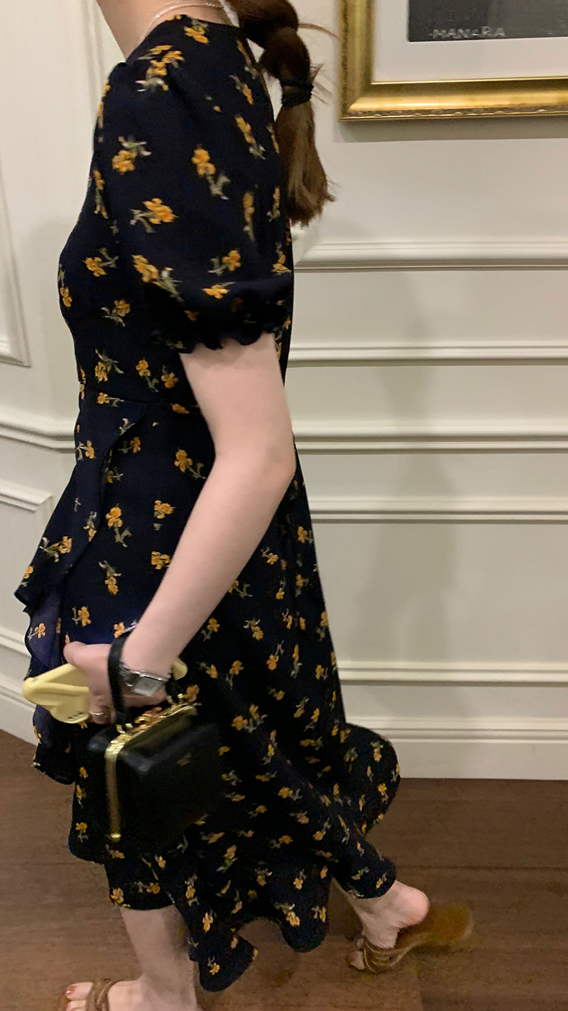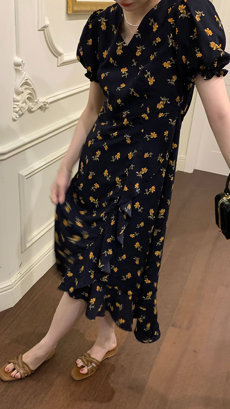 【現貨】im向油畫小黃花V領泡泡袖洋裝不規則荷葉邊甜美碎花裙